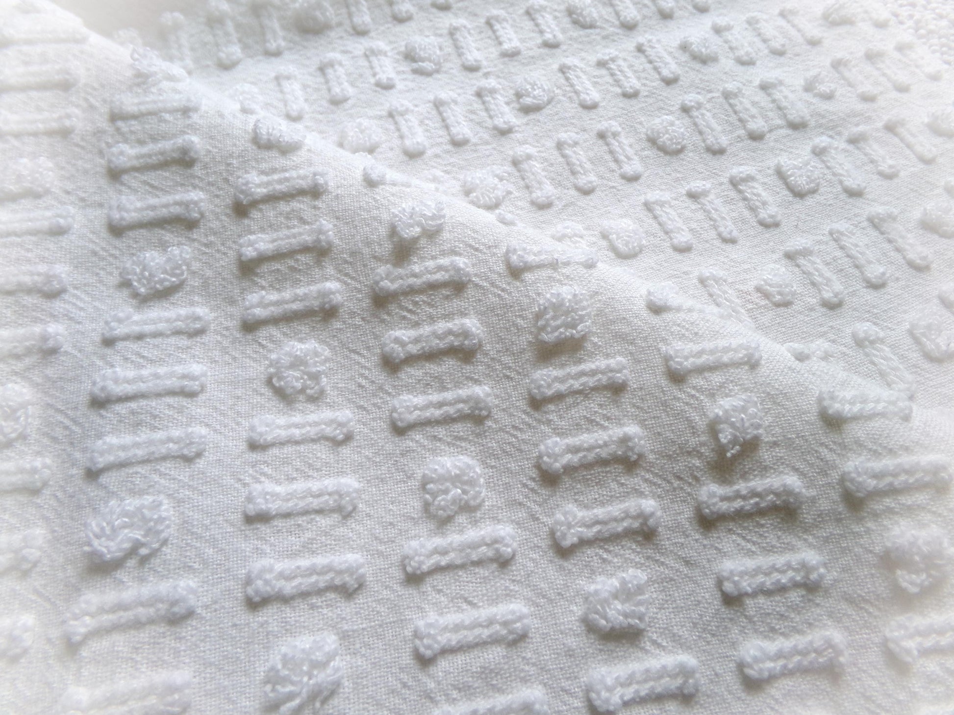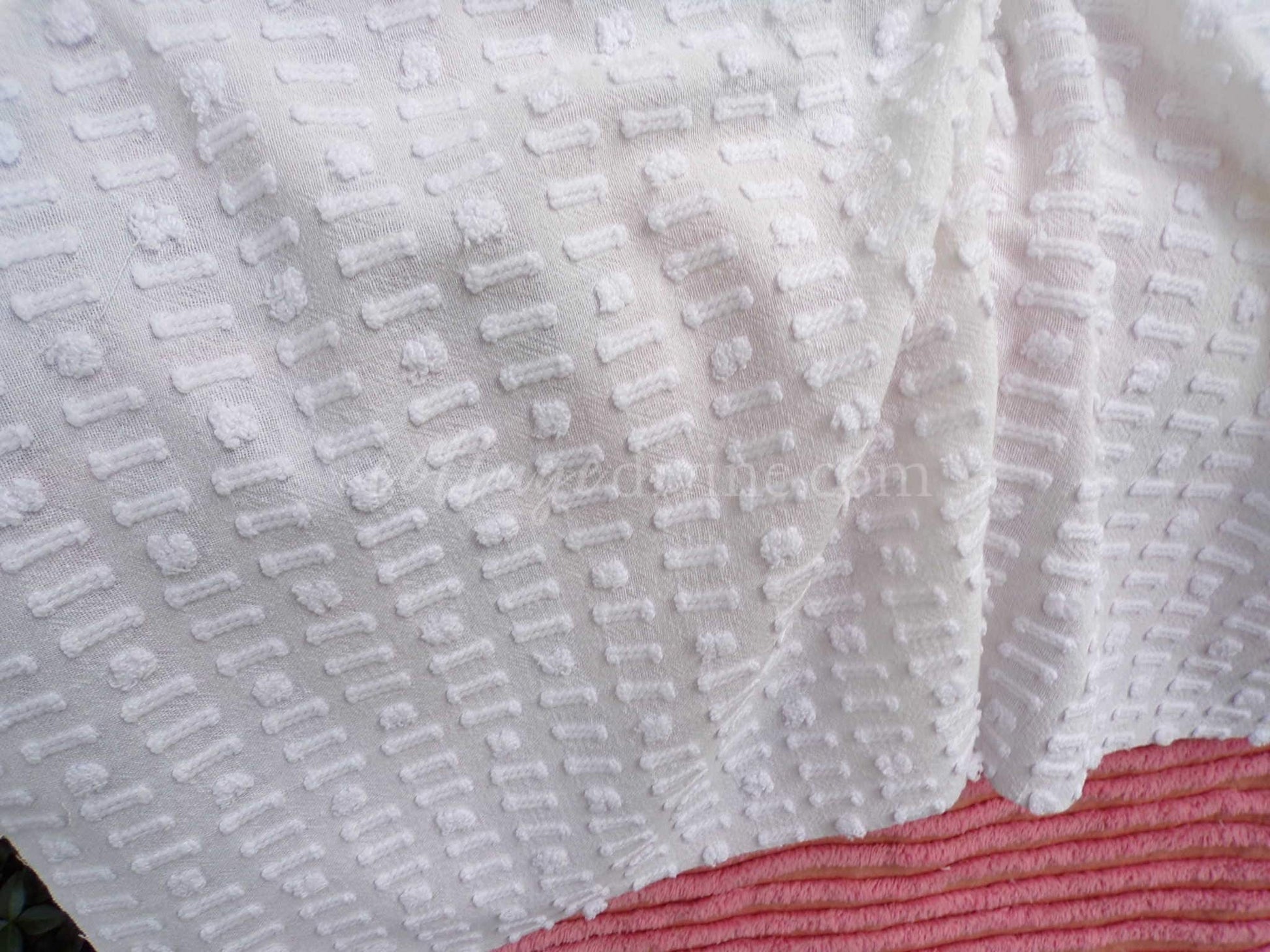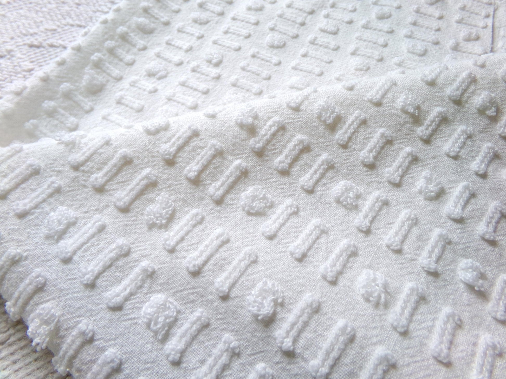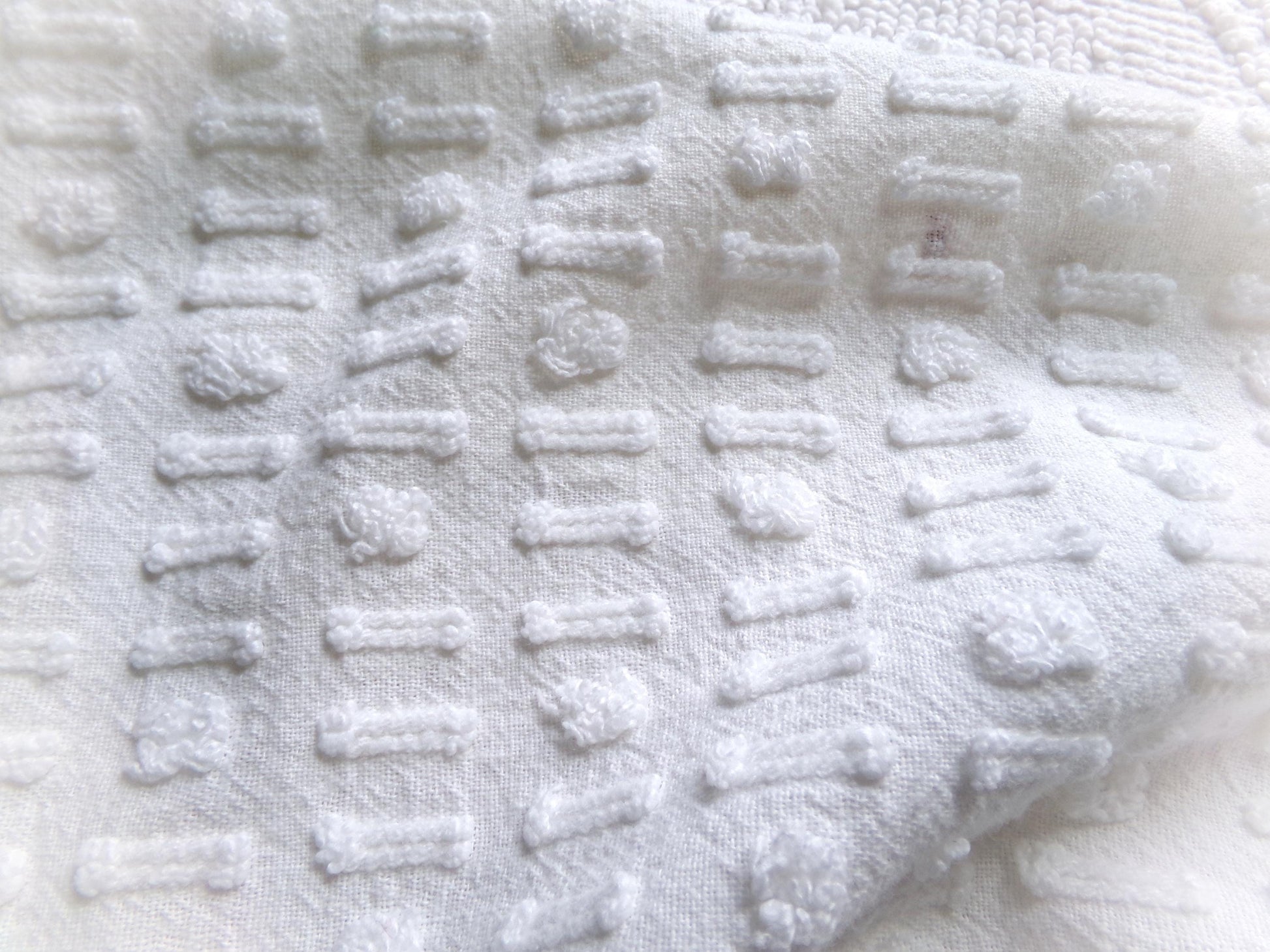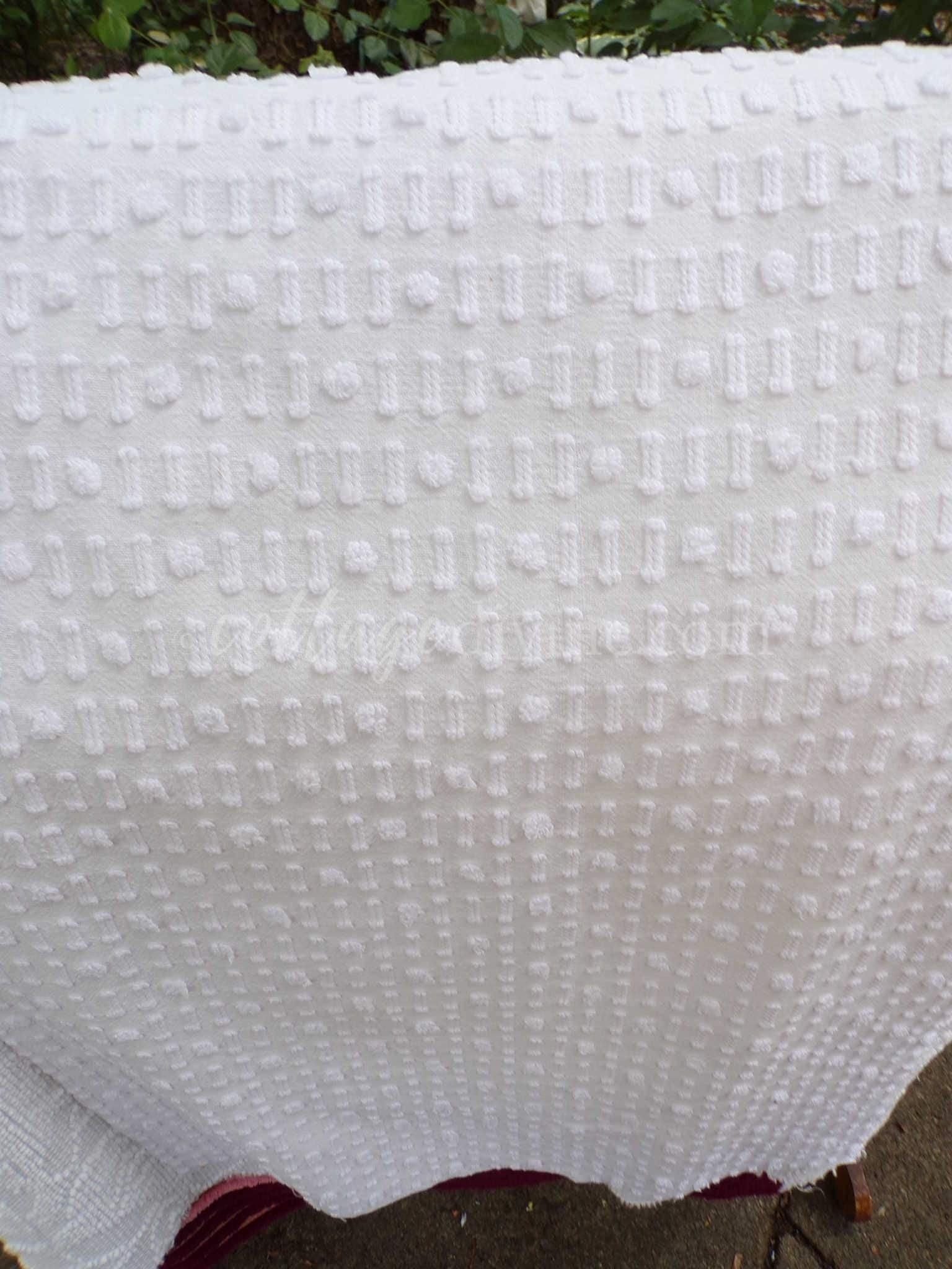 see more, cottagedivine.comA dainty dot-dash design graces this versatile piece of vintage chenille fabric. This popular design adds nice textural interest to any project without overpowering. Use in quilting, small sewing and craft projects, doll blankets, and more.