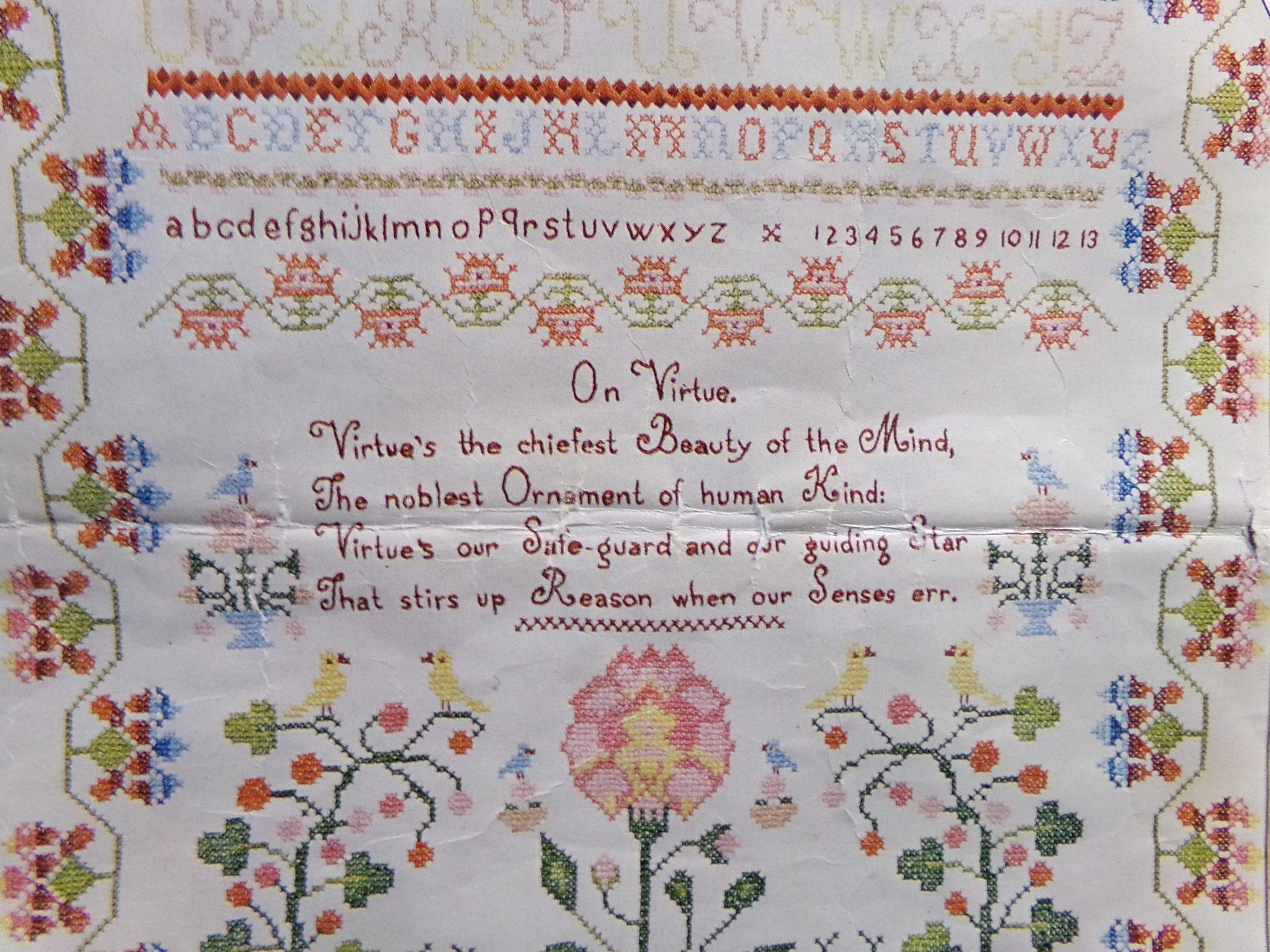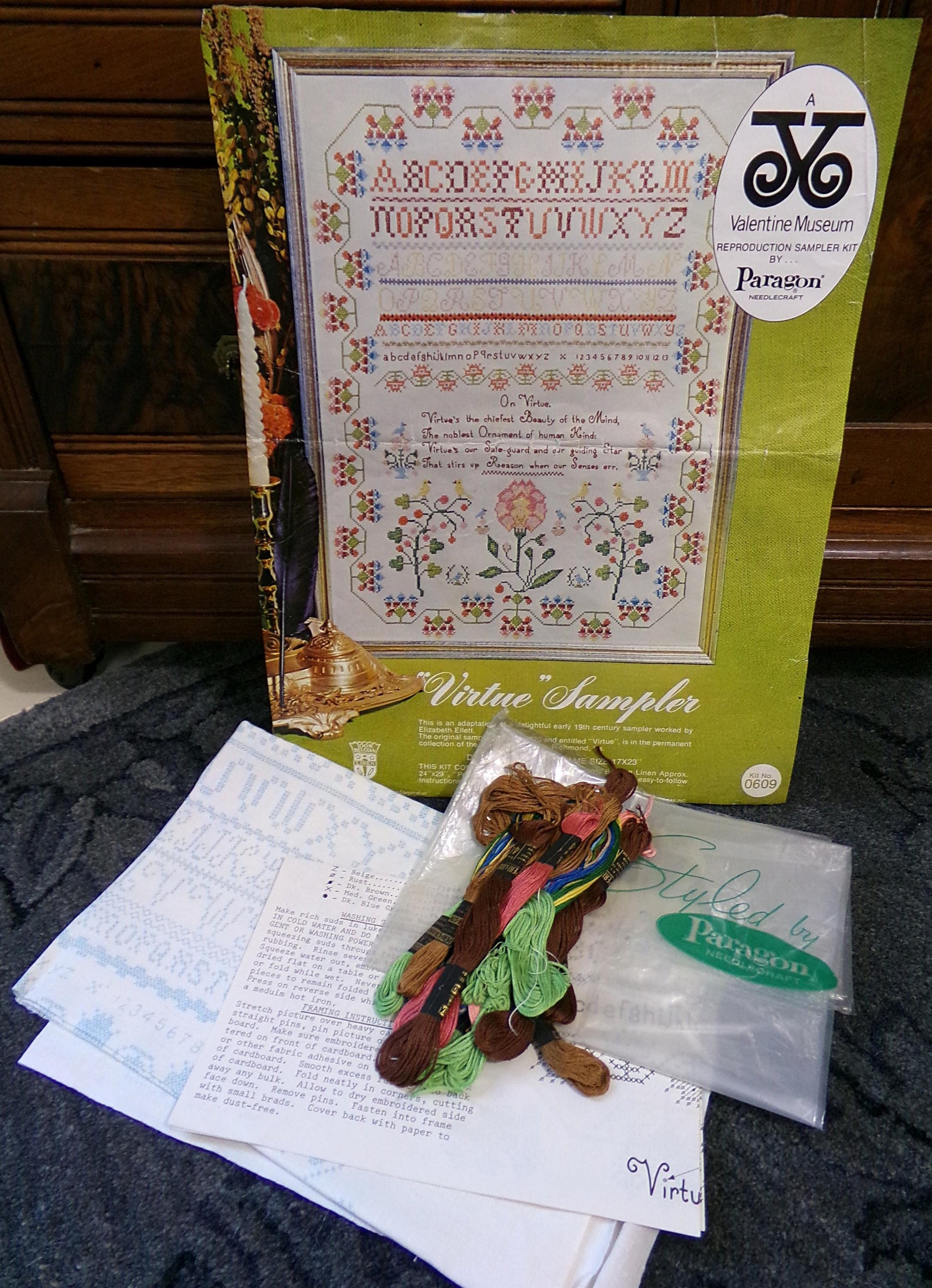 "Virtue" Cross Stitch Embroidery Sampler: "This is an adaptation of a delightful early 19th century sampler worked by Elizabeth Ellett. The original sampler made in 1820 and entitled "Virtue", is in the permanent collection of the Valentine Museum, Richmond, Va."-Paragon Needlecraft Embroidery Kit #0609