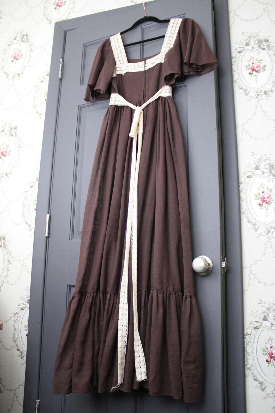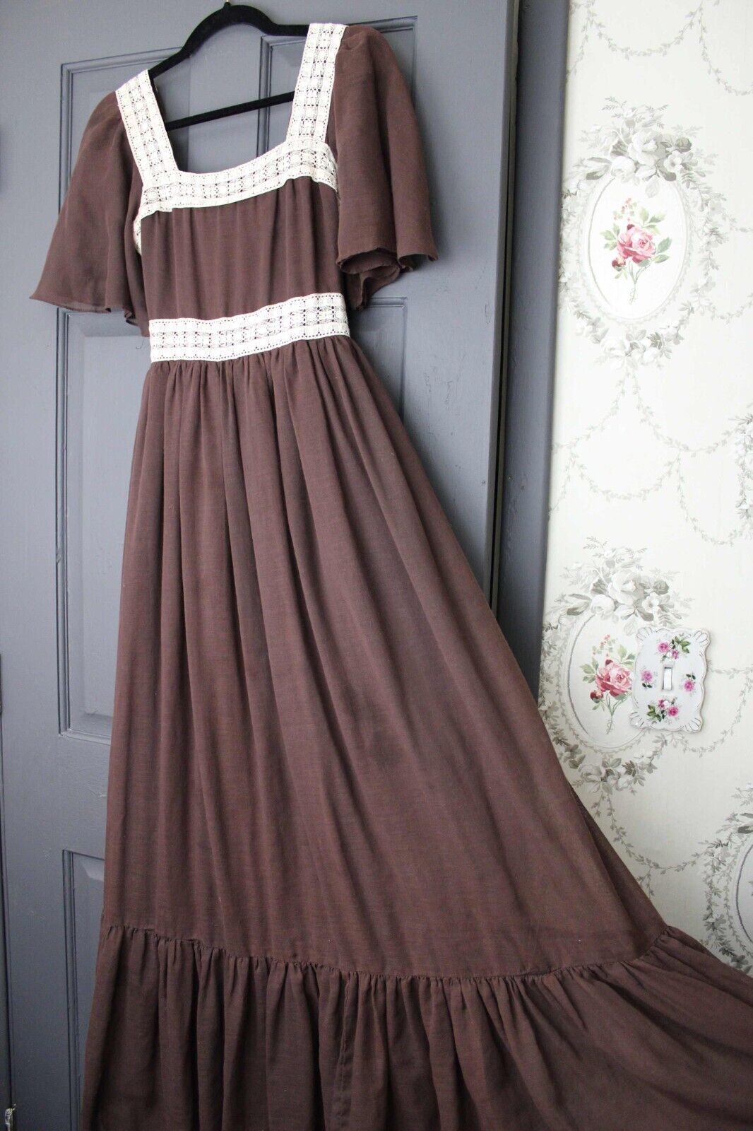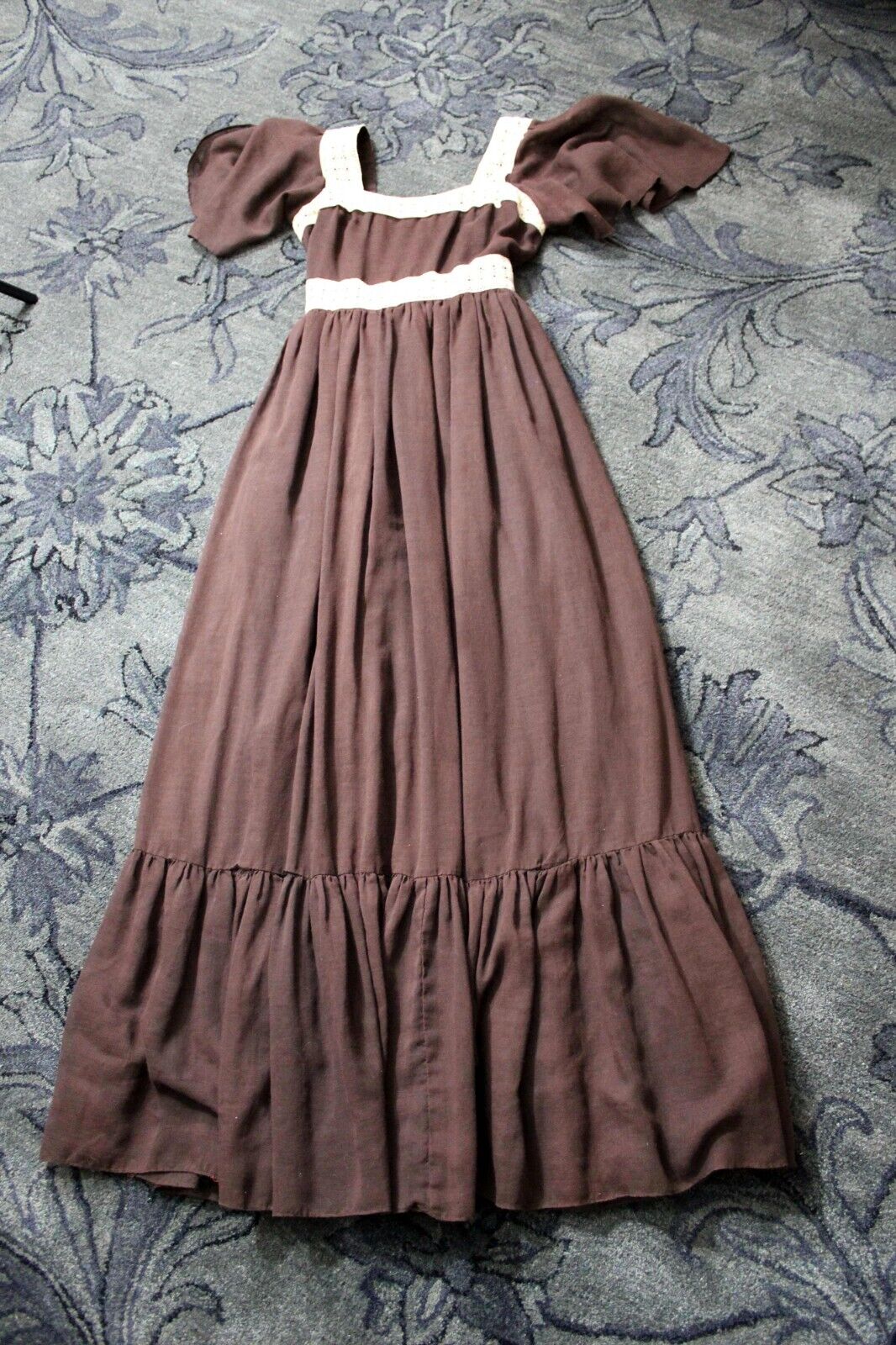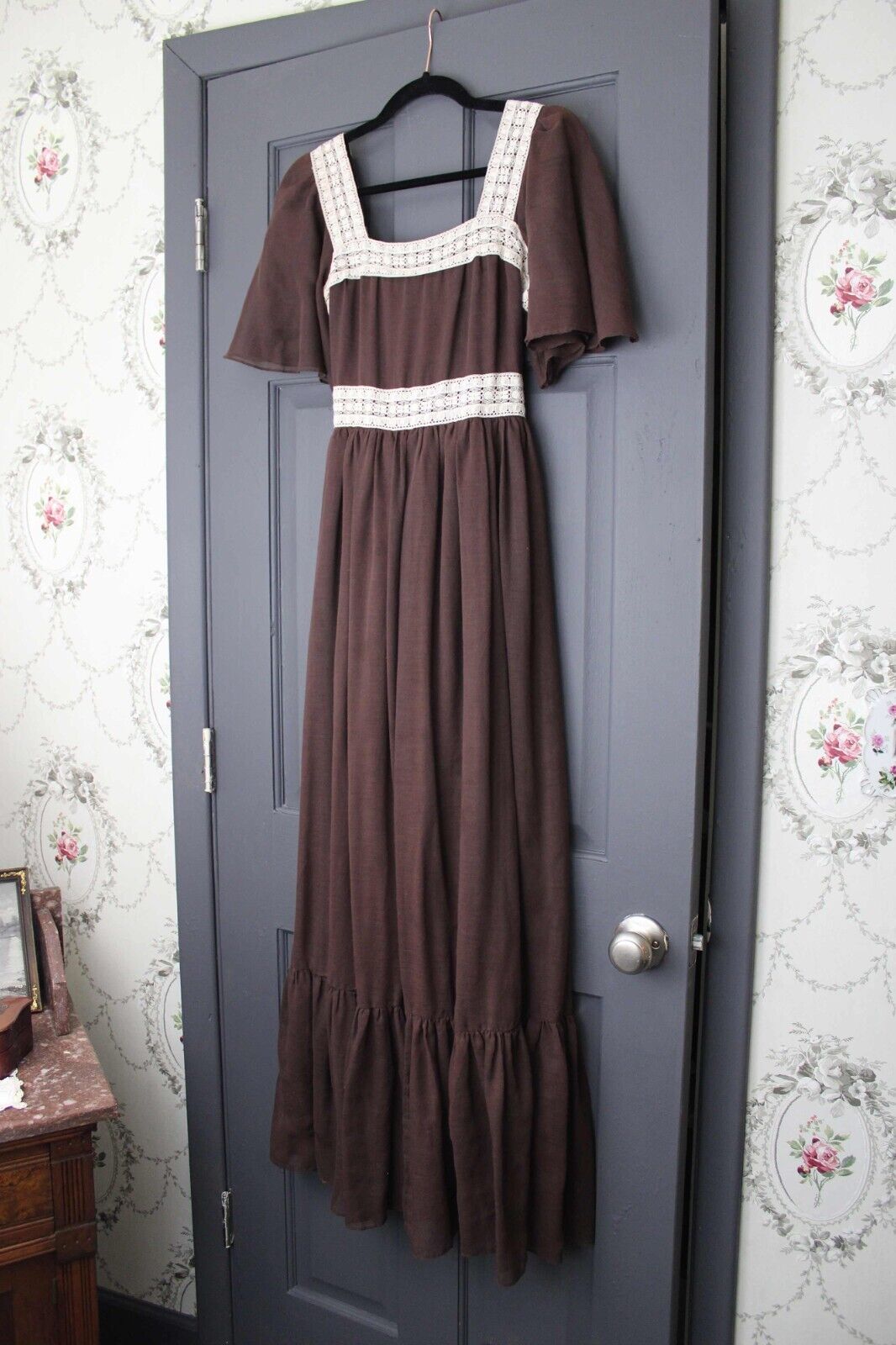 Love the deep, earthy mama brown color of this vintage prairie dress. This maxi dress is original to the 1970s era and features short angel flutter sleeves, a nice ruffle hemline, and cream crochet style lace trim and back ties.Original Act I tag is intact and states size 11 (which is vintage Junior's sizing equivalent to a modern XXS, based on msmts below).