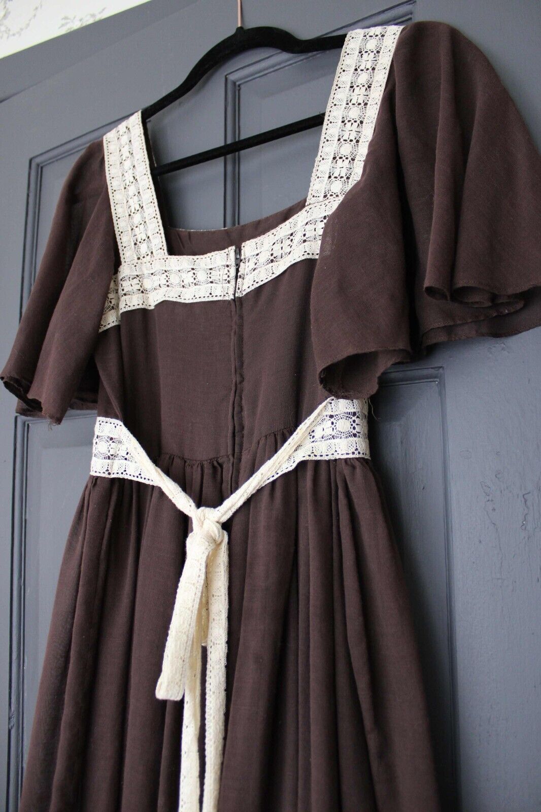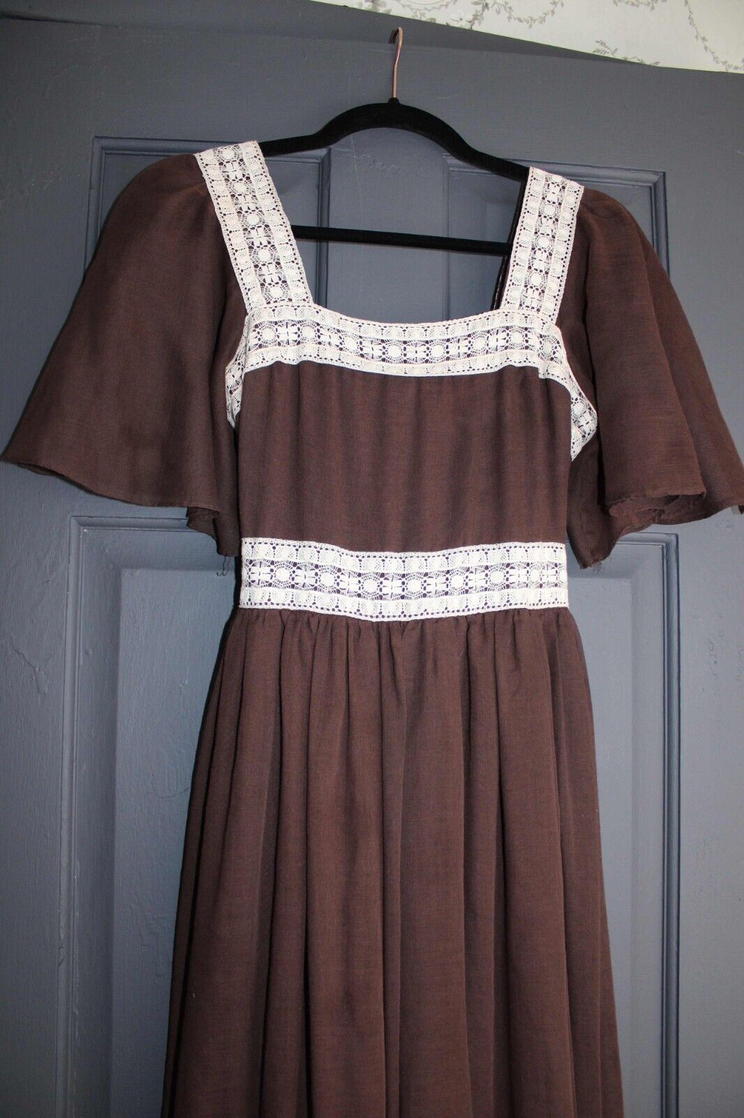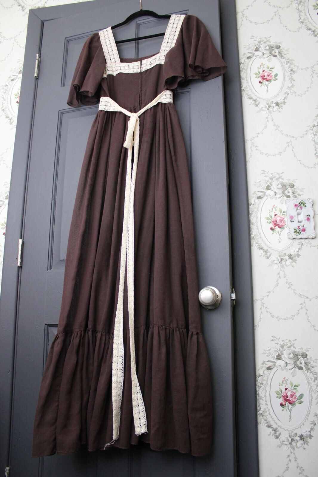 Love the deep, earthy mama brown color of this vintage prairie dress. This maxi dress is original to the 1970s era and features short angel flutter sleeves, a nice ruffle hemline, and cream crochet style lace trim and back ties.Original Act I tag is intact and states size 11 (which is vintage Junior's sizing equivalent to a modern XXS, based on msmts below).