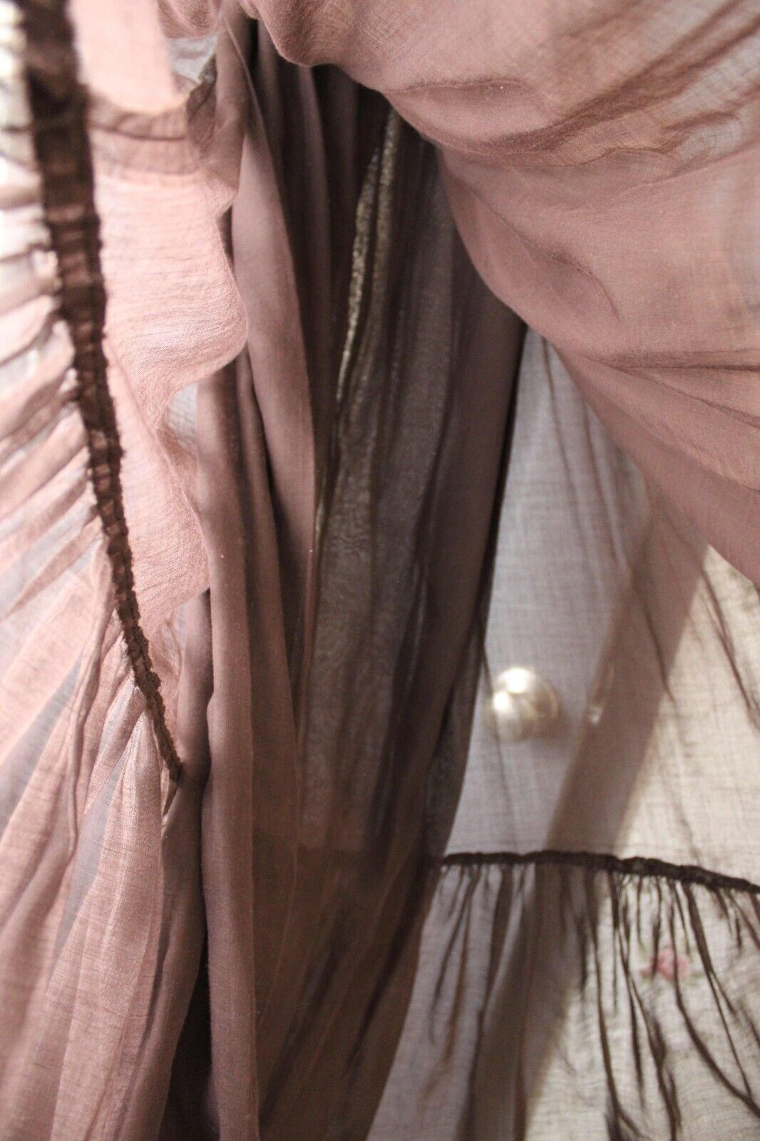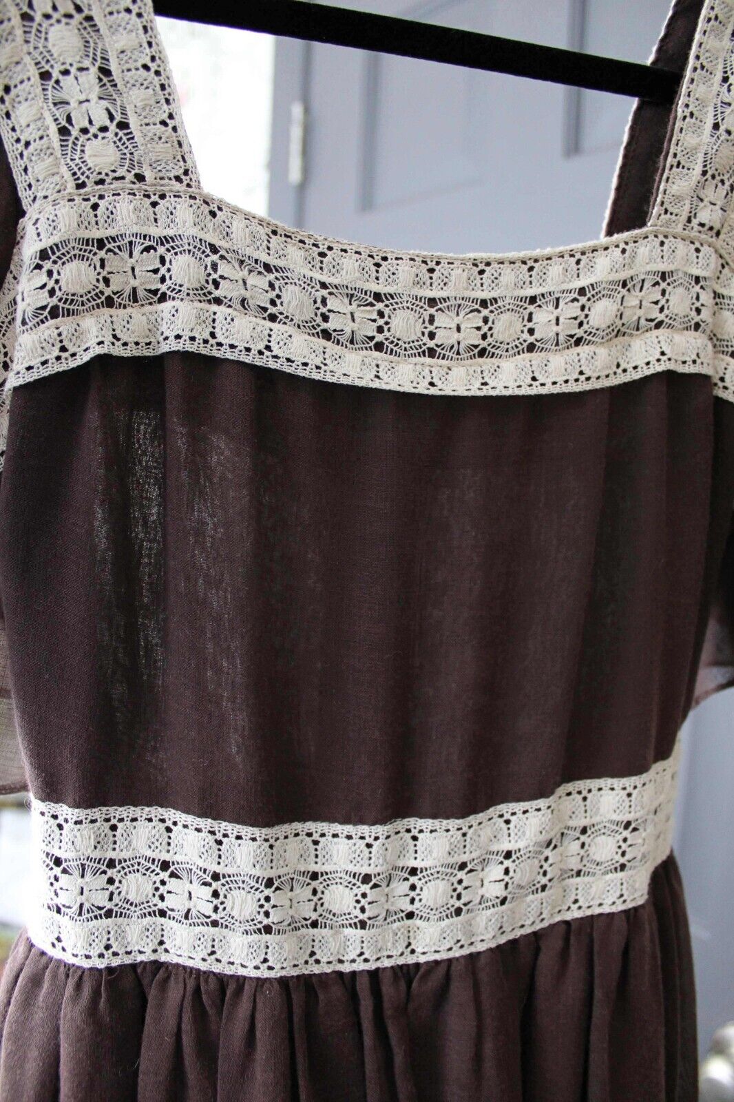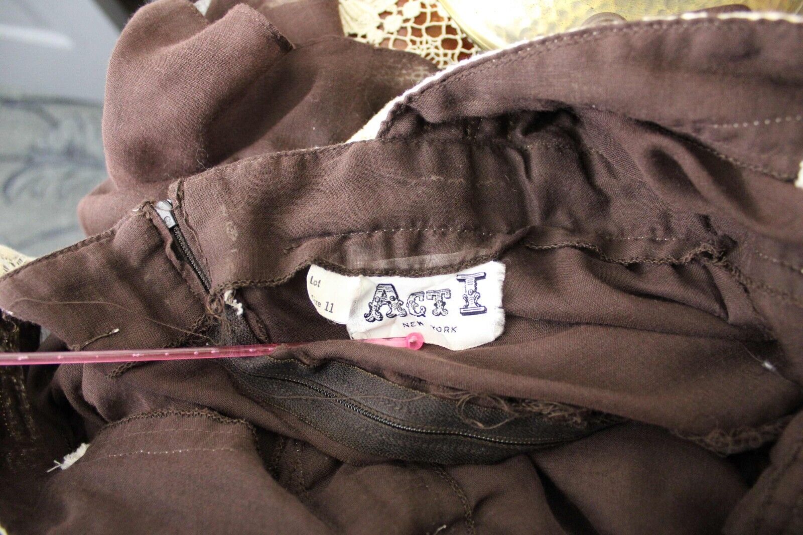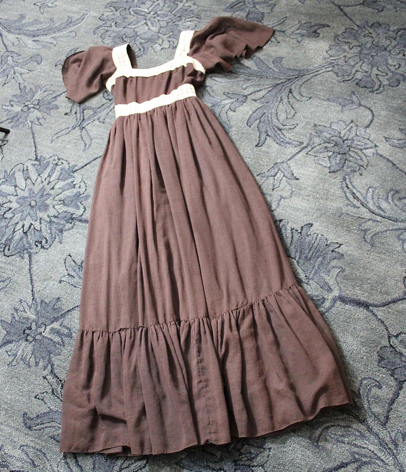 Love the deep, earthy mama brown color of this vintage prairie dress. This maxi dress is original to the 1970s era and features short angel flutter sleeves, a nice ruffle hemline, and cream crochet style lace trim and back ties.Original Act I tag is intact and states size 11 (which is vintage Junior's sizing equivalent to a modern XXS, based on msmts below).