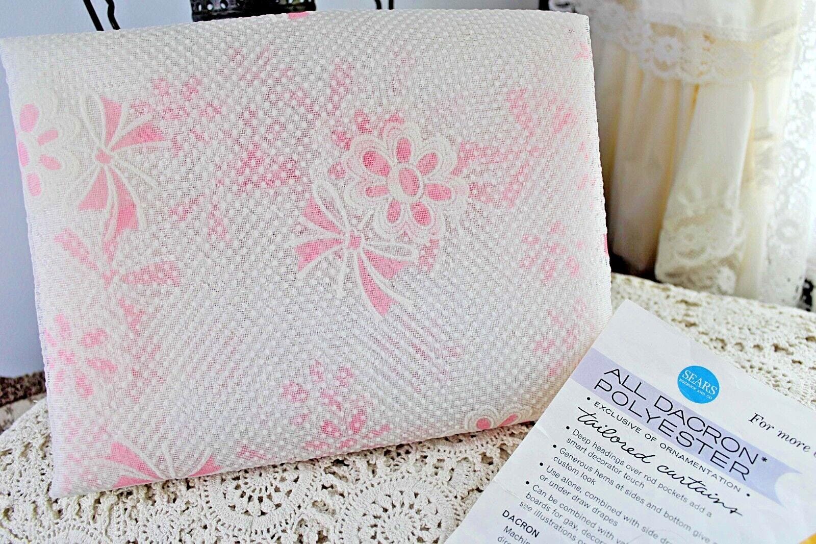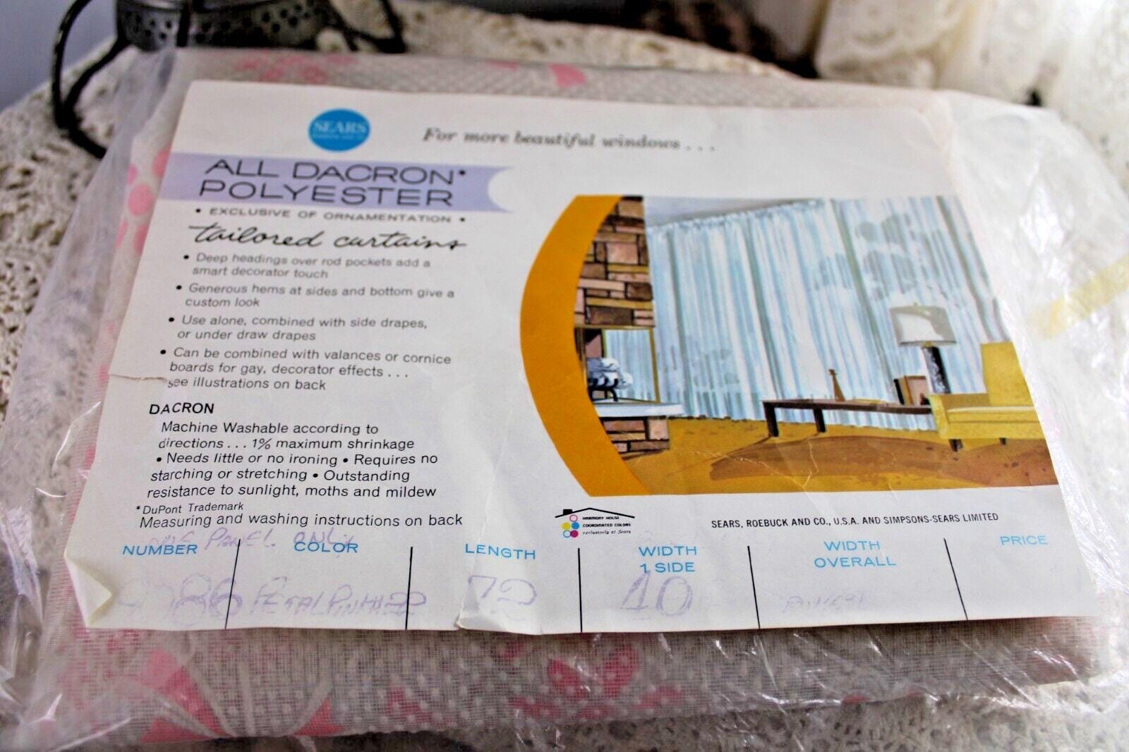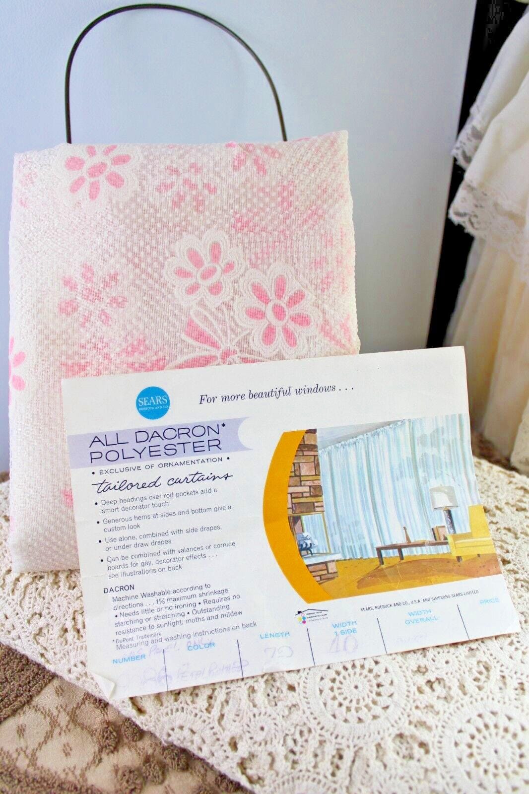 Cottagecore vintage sheer SINGLE curtain panel (not a pair), featuring precious single & double daisy flowers, tied with little bows. Tiny dots scattered across the sheer panel add a touch of whimsy. In cottage classic white & petal pinkNOS, likely from the 1960s era. Package opened but curtain panel appears unused. Measures 72"L x 40"W according to pkg. Additional panels available - choose qty at checkout- in pre-loved vintage condition, always expect attributes of age such as storage scents, small marks, etc.- combined shipping available; overages over $1 refunded