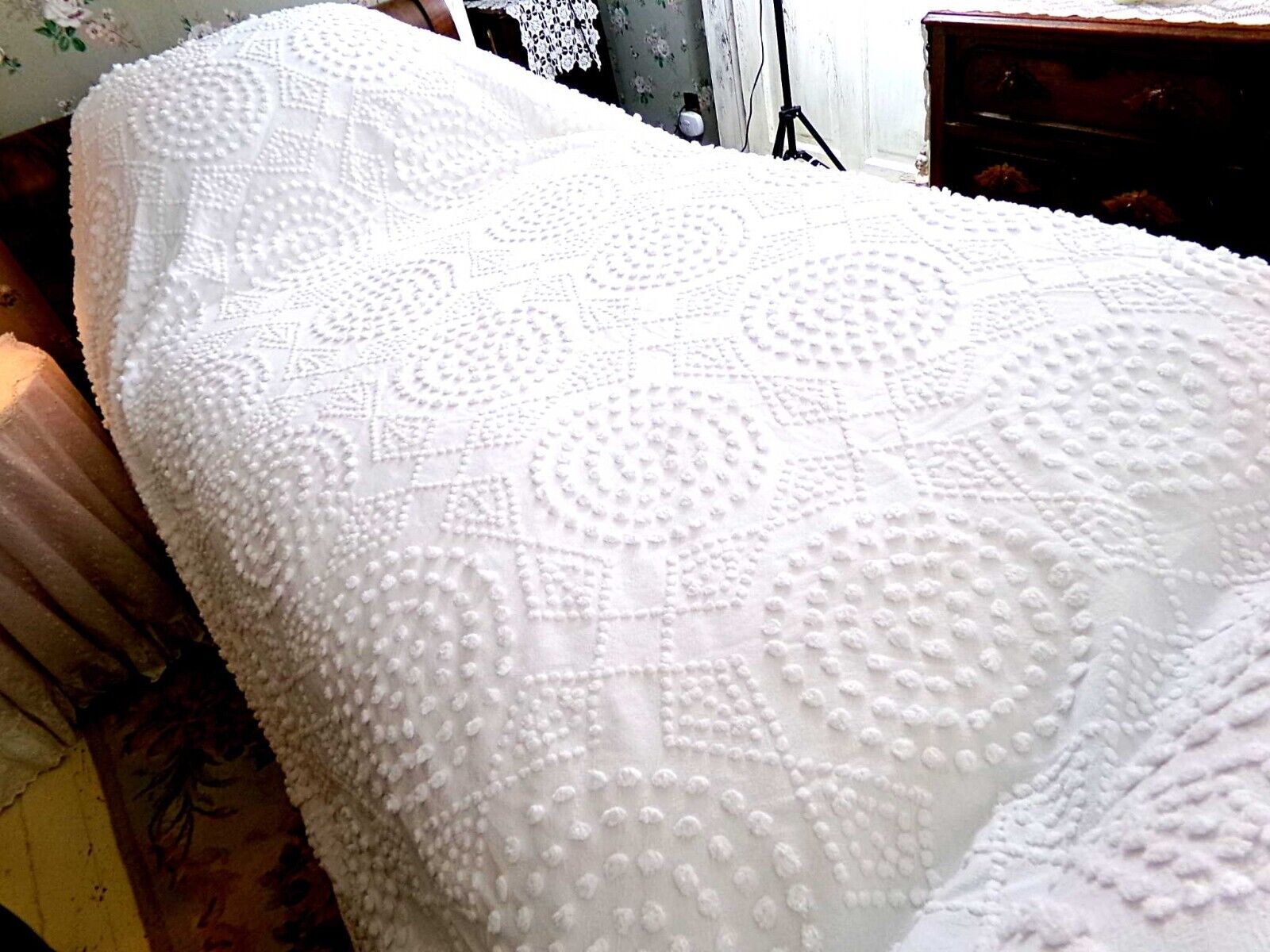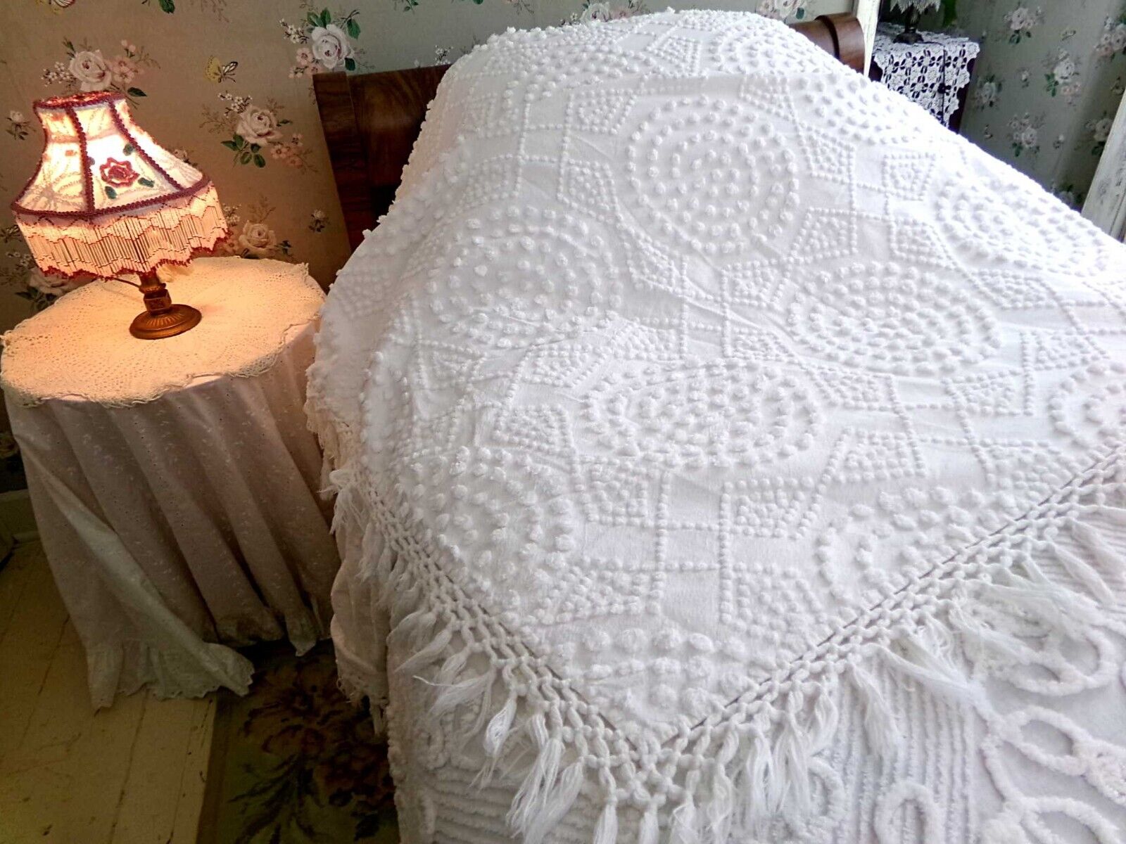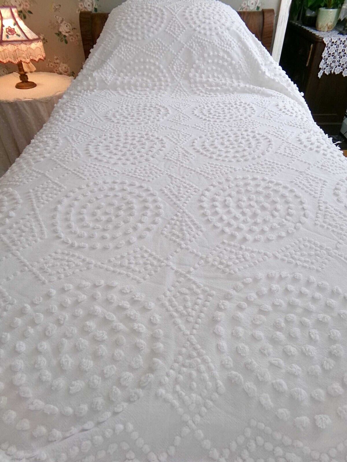 CONDITION: A few minor age marks, tousled fringe. Remember that this is handmade, so various "imperfections" are a given. Unless otherwise stated, our chenille bedspreads are pre-loved, original vintage/antique, and at least 50 years old. All vintage linens show attributes such as small age spots, mends, pinholes & fabric separations, color variations, etc. Virtually all have will have a scent of some type, i.e. from storage, fabric detergents, etc.
