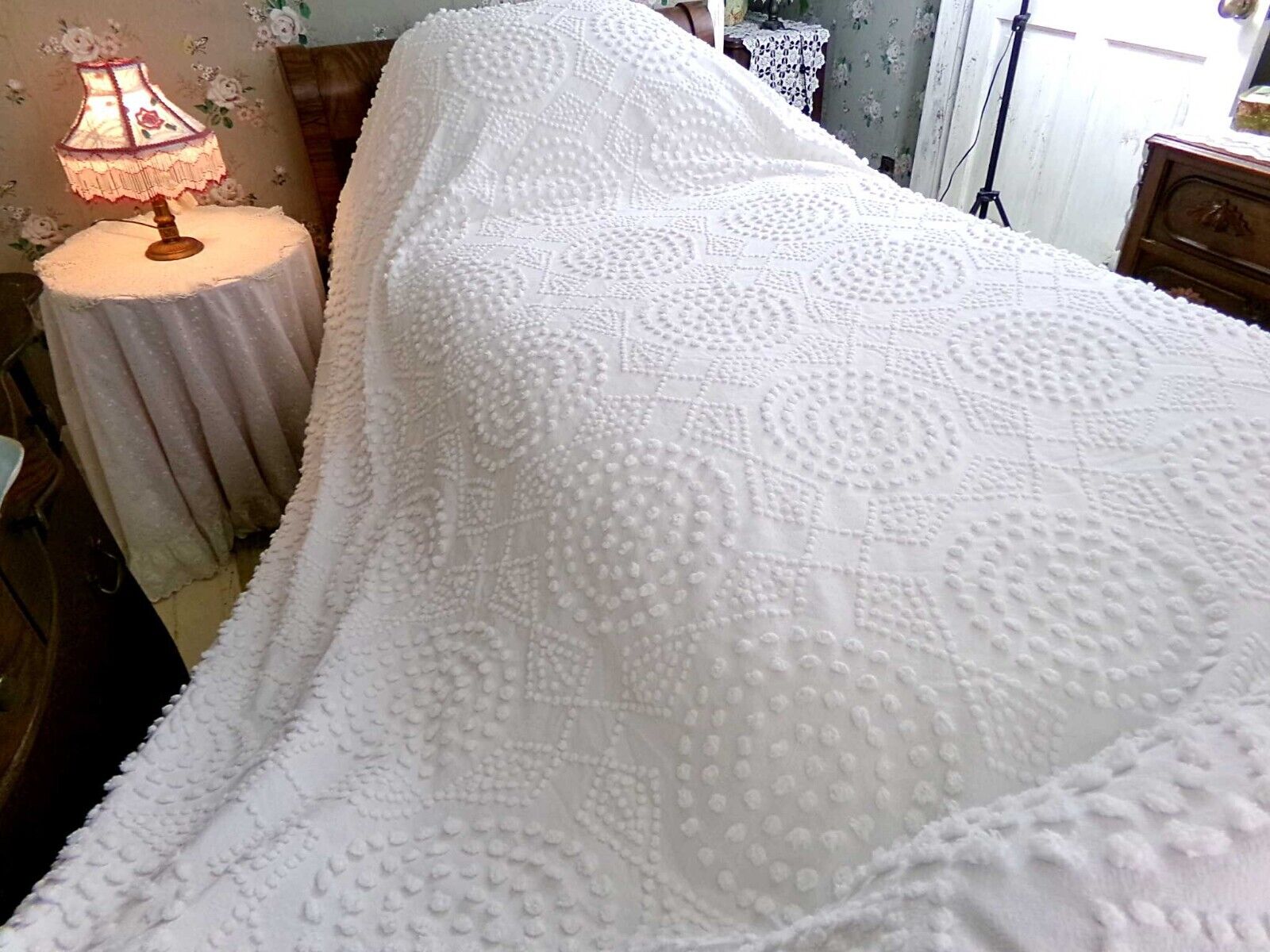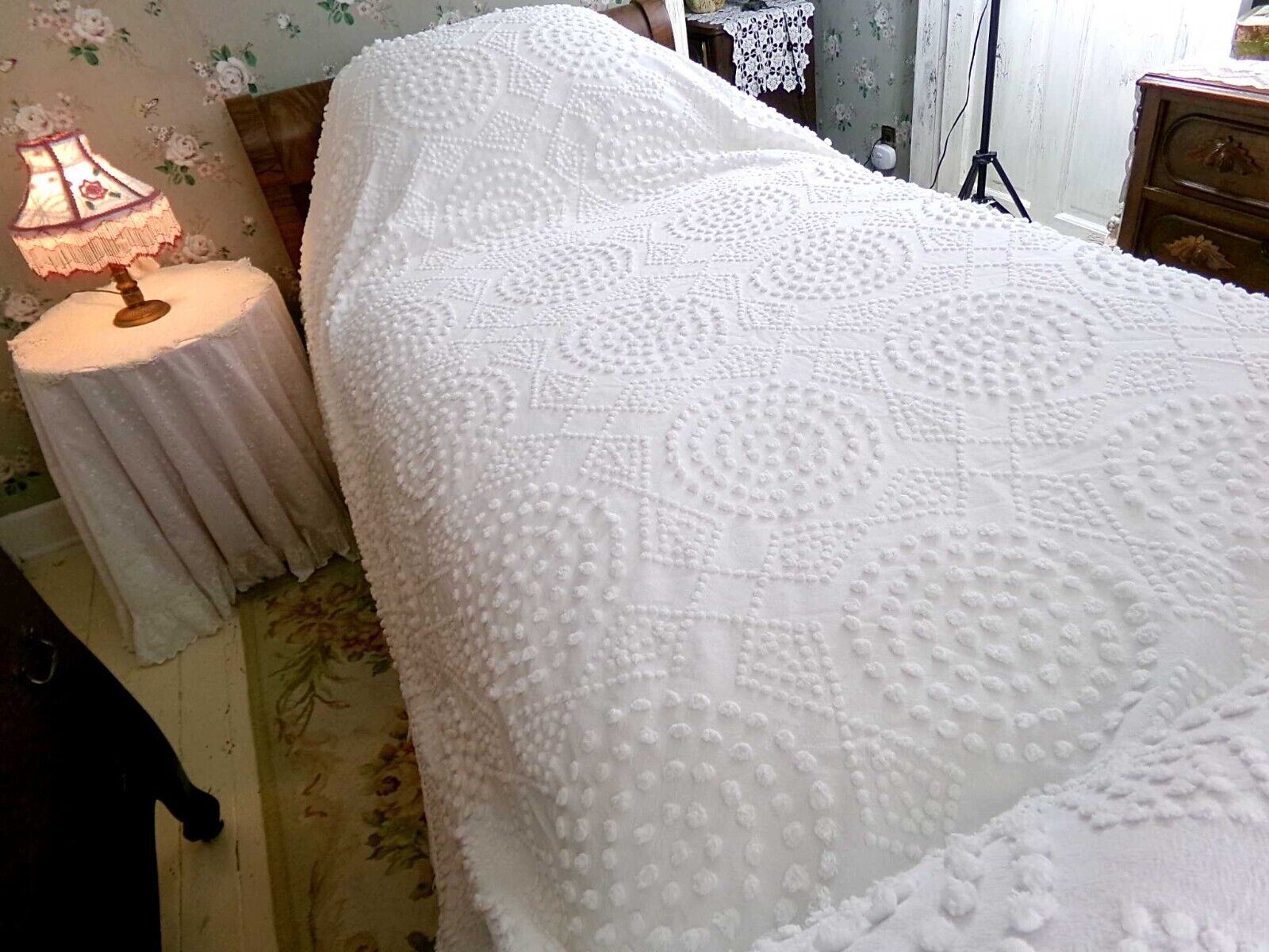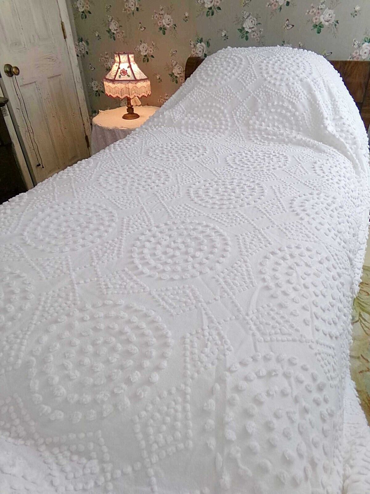 CONDITION: A few minor age marks, tousled fringe. Remember that this is handmade, so various "imperfections" are a given. Unless otherwise stated, our chenille bedspreads are pre-loved, original vintage/antique, and at least 50 years old. All vintage linens show attributes such as small age spots, mends, pinholes & fabric separations, color variations, etc. Virtually all have will have a scent of some type, i.e. from storage, fabric detergents, etc.