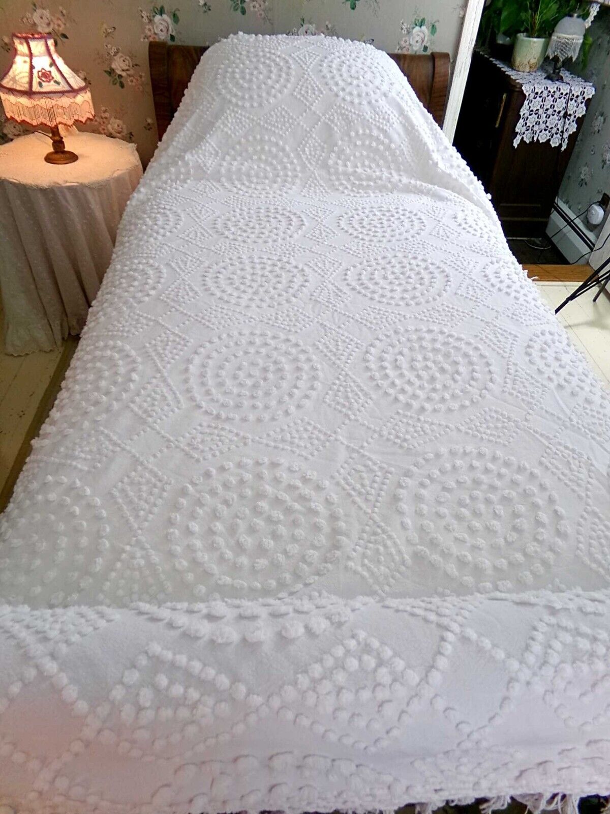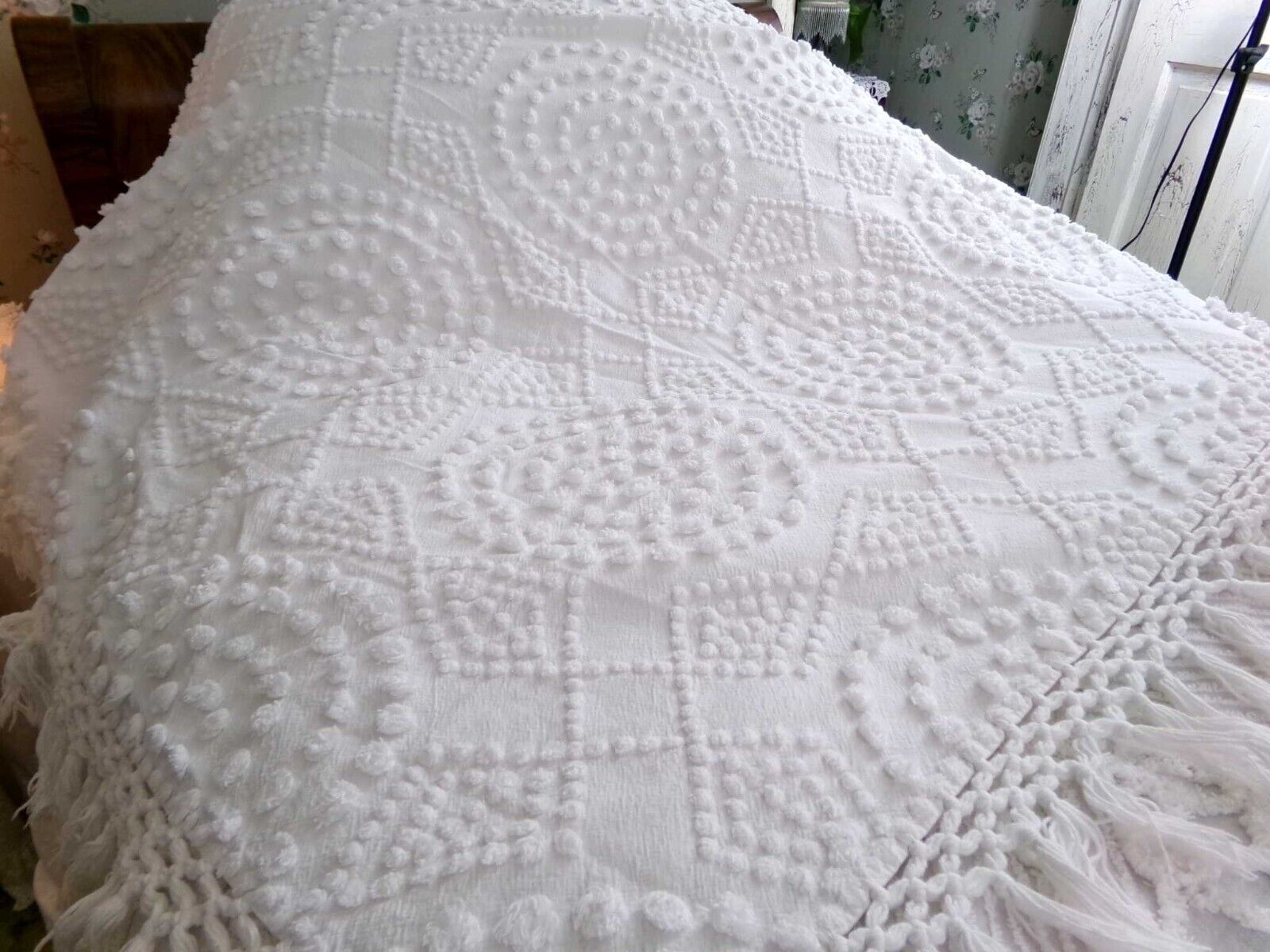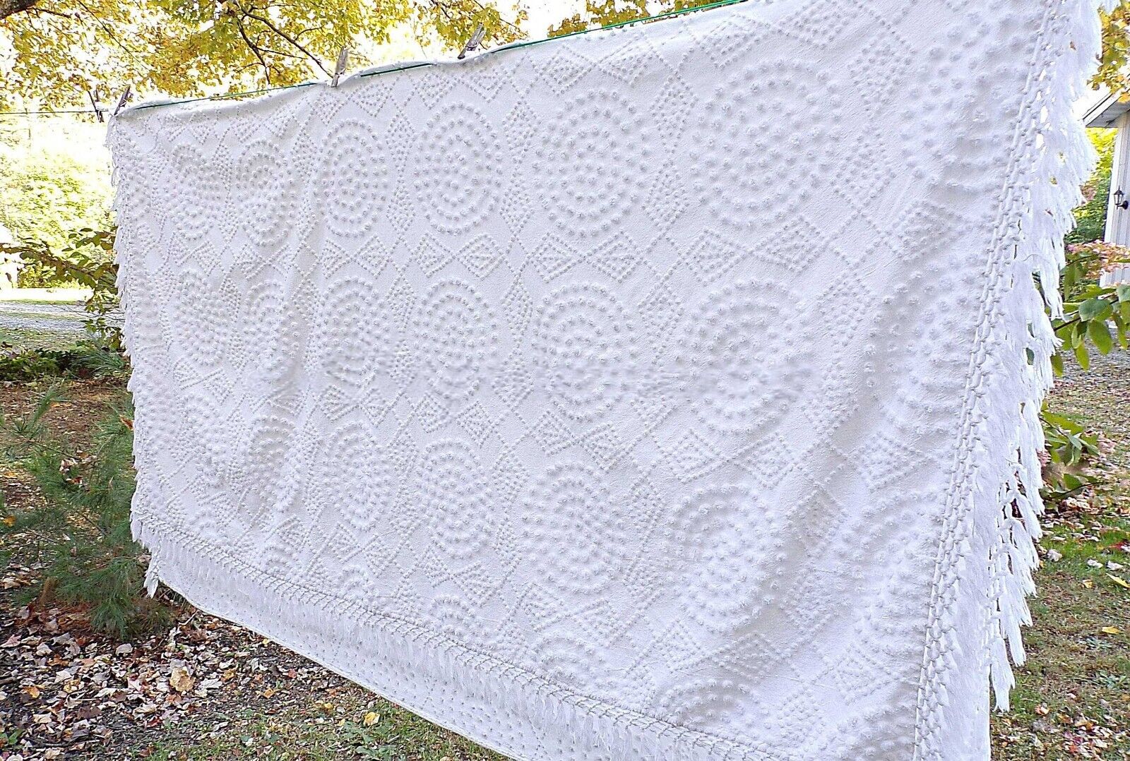 This lovely antique 1930s chenille bedspread offers a remarkably detailed design featuring circular moon shapes surrounded by diamond dot wedges. A memorable pattern, set on classic white cotton and accented with ornate shawl type fringe.Handtufted, this is a beautiful piece of American textile history - think of all the time someone put into this work of art.