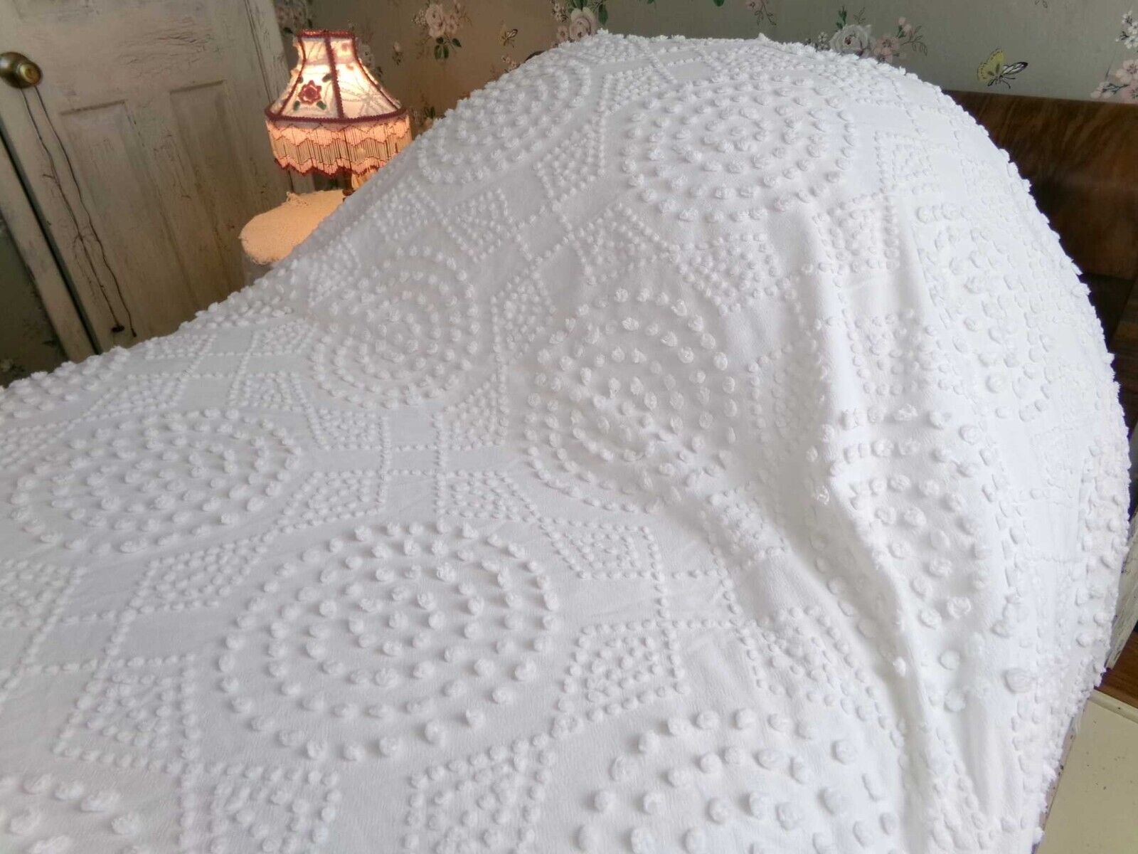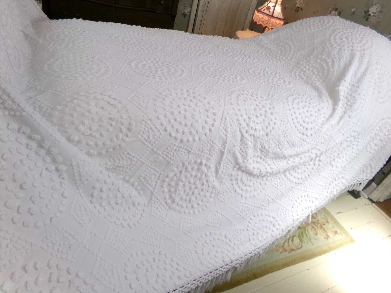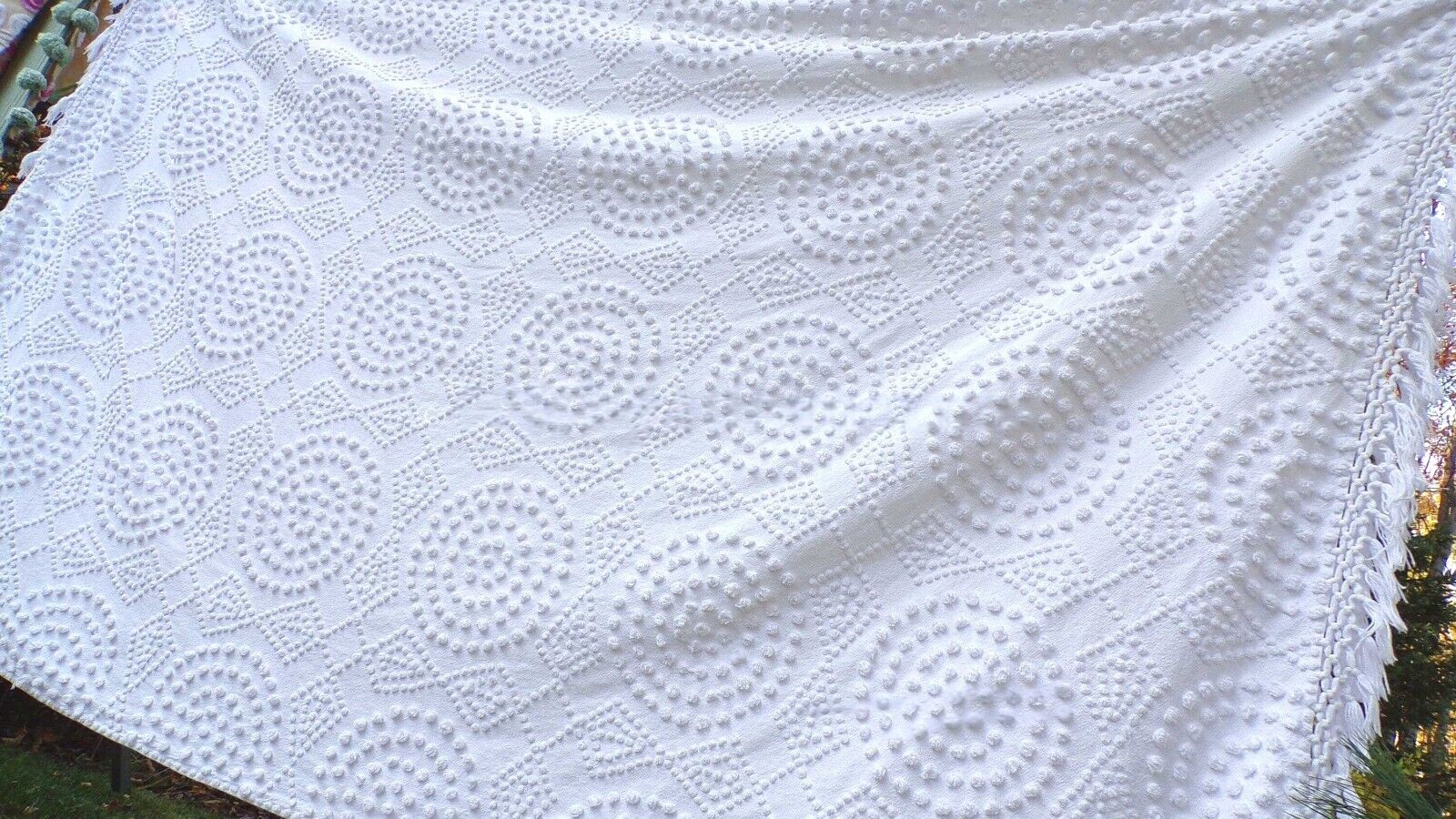 This lovely antique 1930s chenille bedspread offers a remarkably detailed design featuring circular moon shapes surrounded by diamond dot wedges. A memorable pattern, set on classic white cotton and accented with ornate shawl type fringe.Handtufted, this is a beautiful piece of American textile history - think of all the time someone put into this work of art.