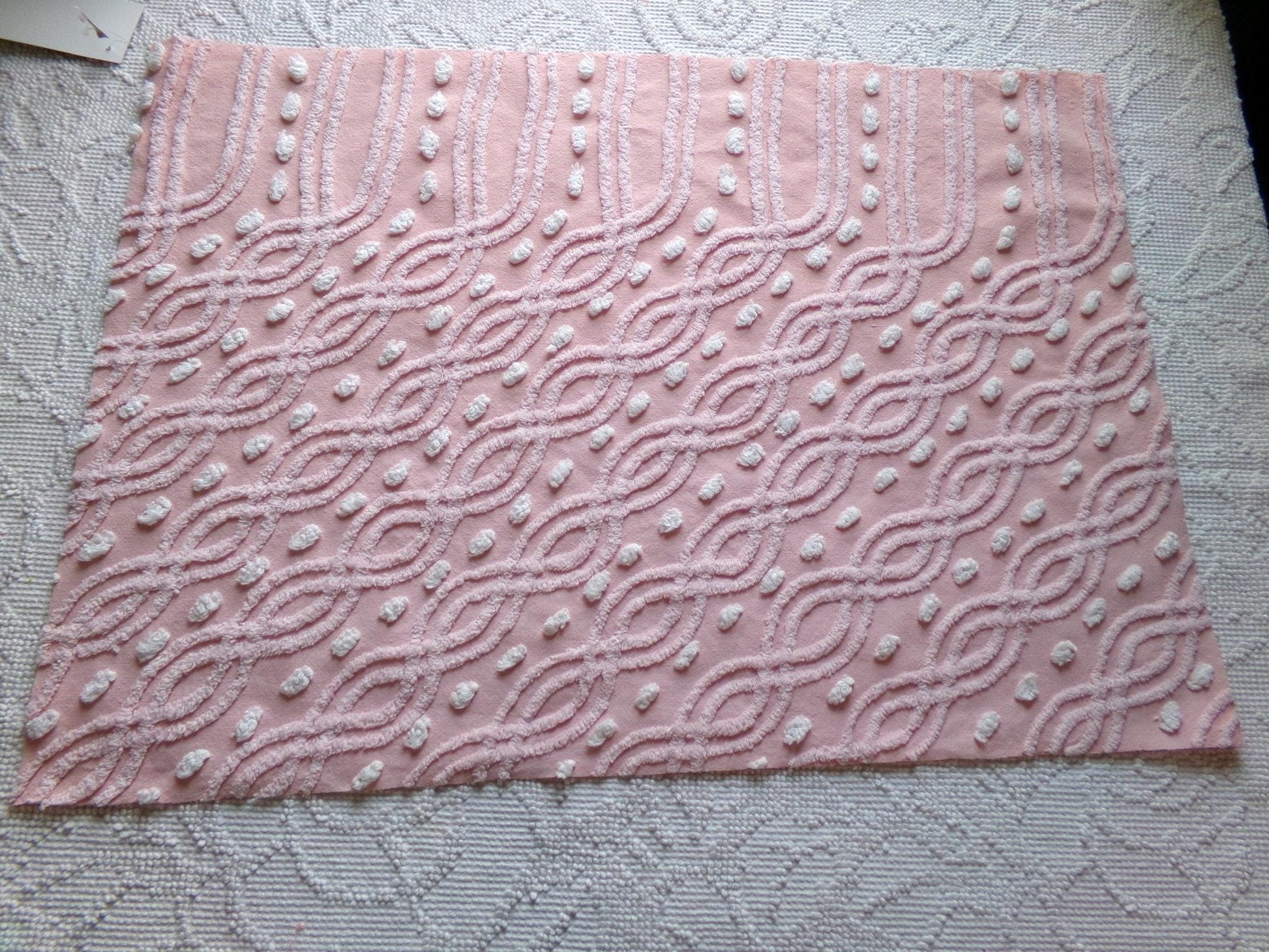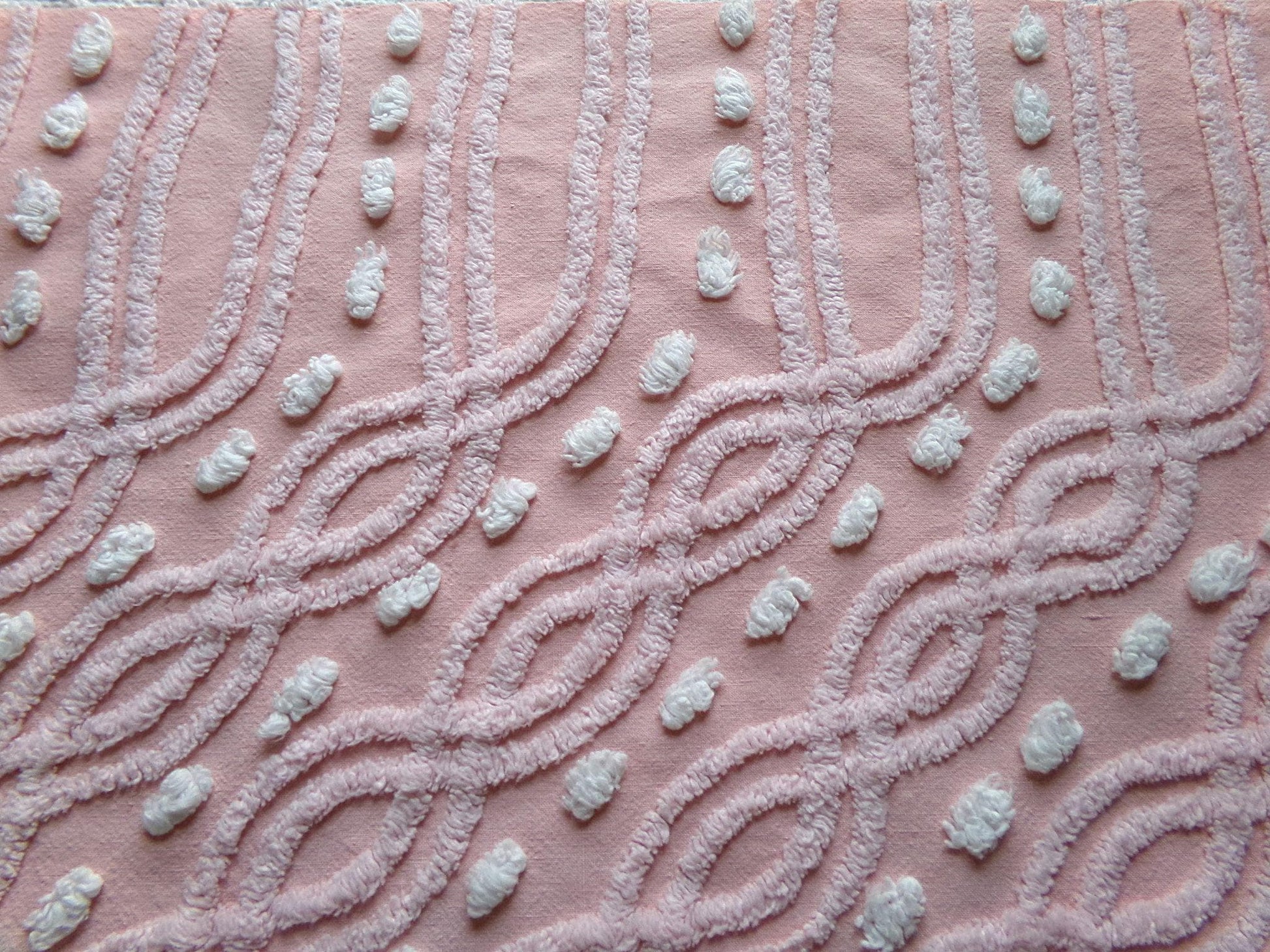 Wandering pink eternity links travel along, interspersed by contrast white dots on this gorgeous piece of vintage chenille fabric. This unusual pattern makes an excellent visual presentation in any project and has a decidedly feminine essence.Approx 17" x 25" inch piece. 100% cotton. Lighter weight bkgd; color is very adaptive to light.