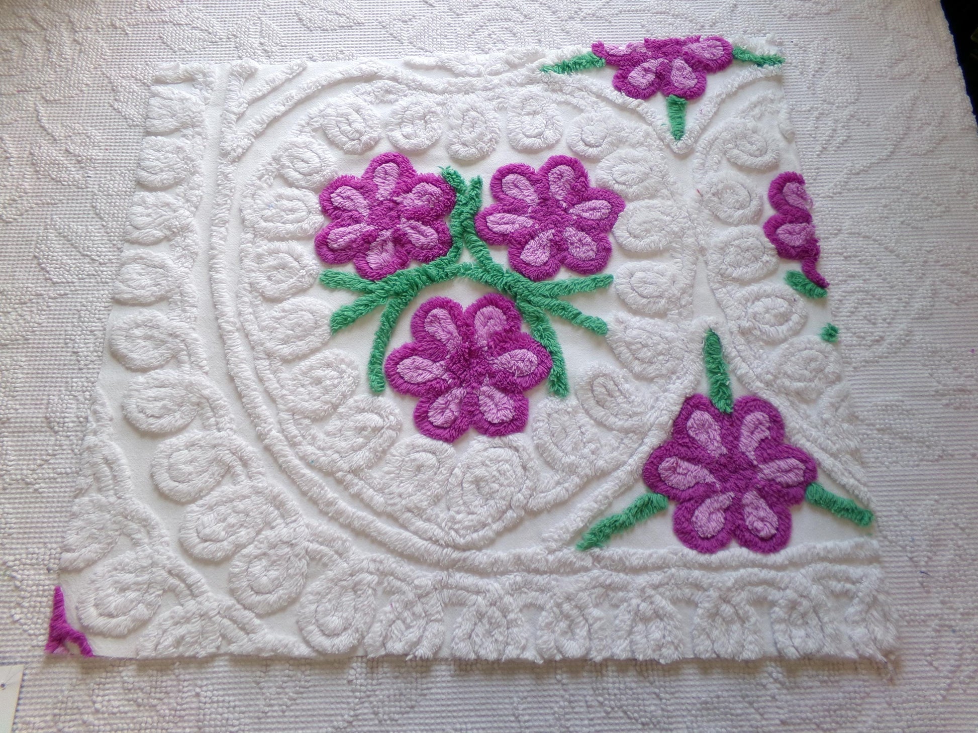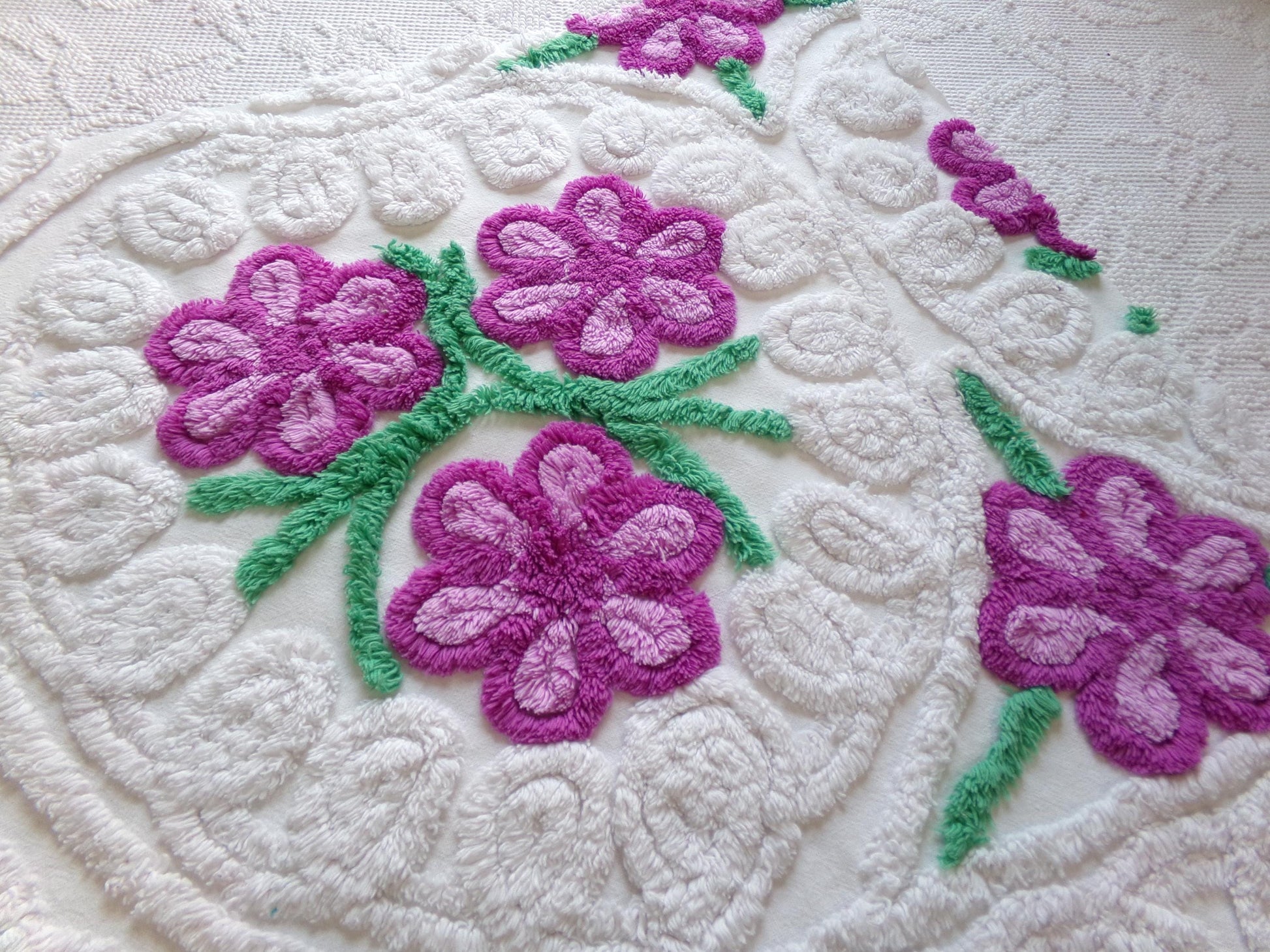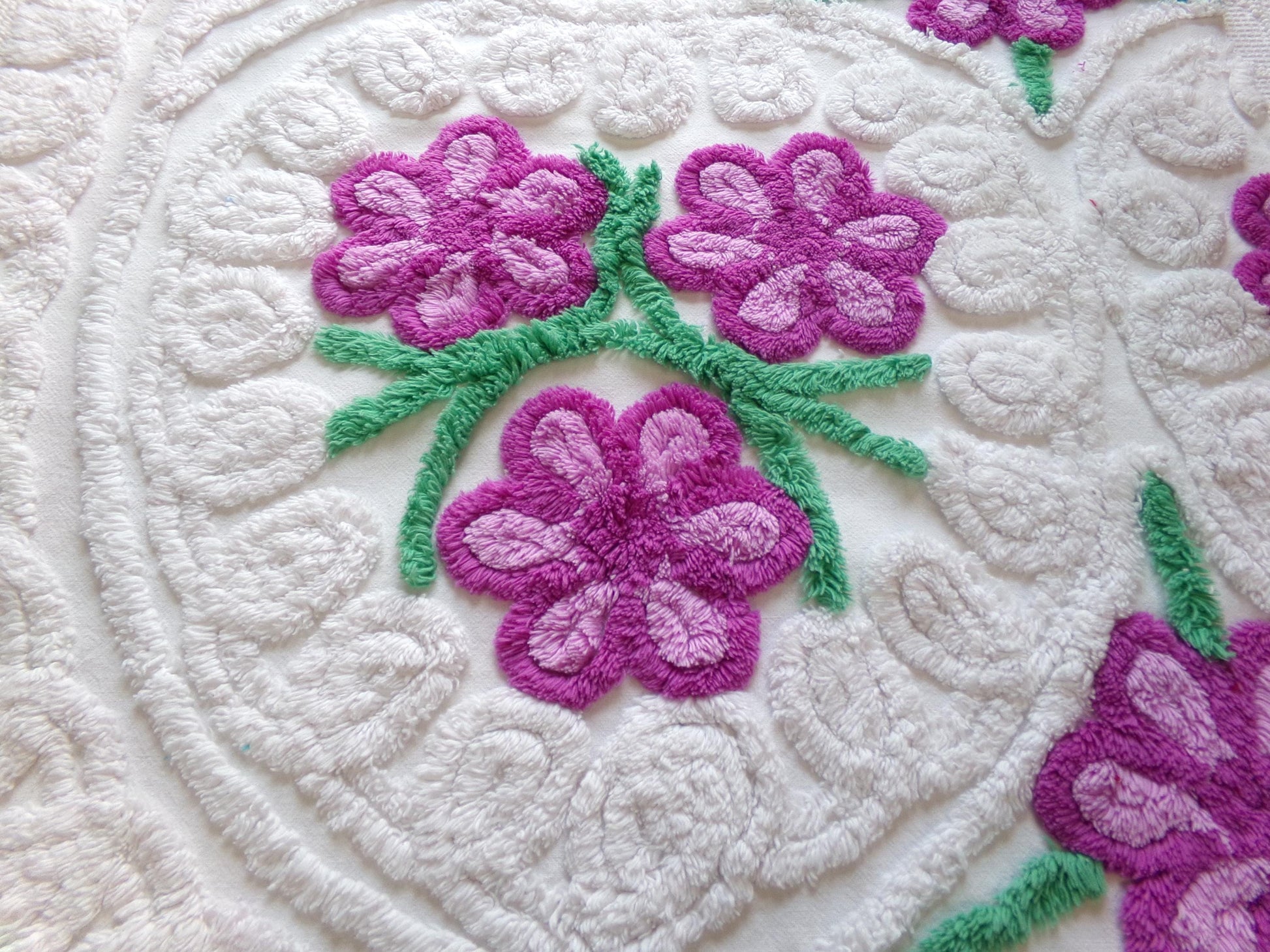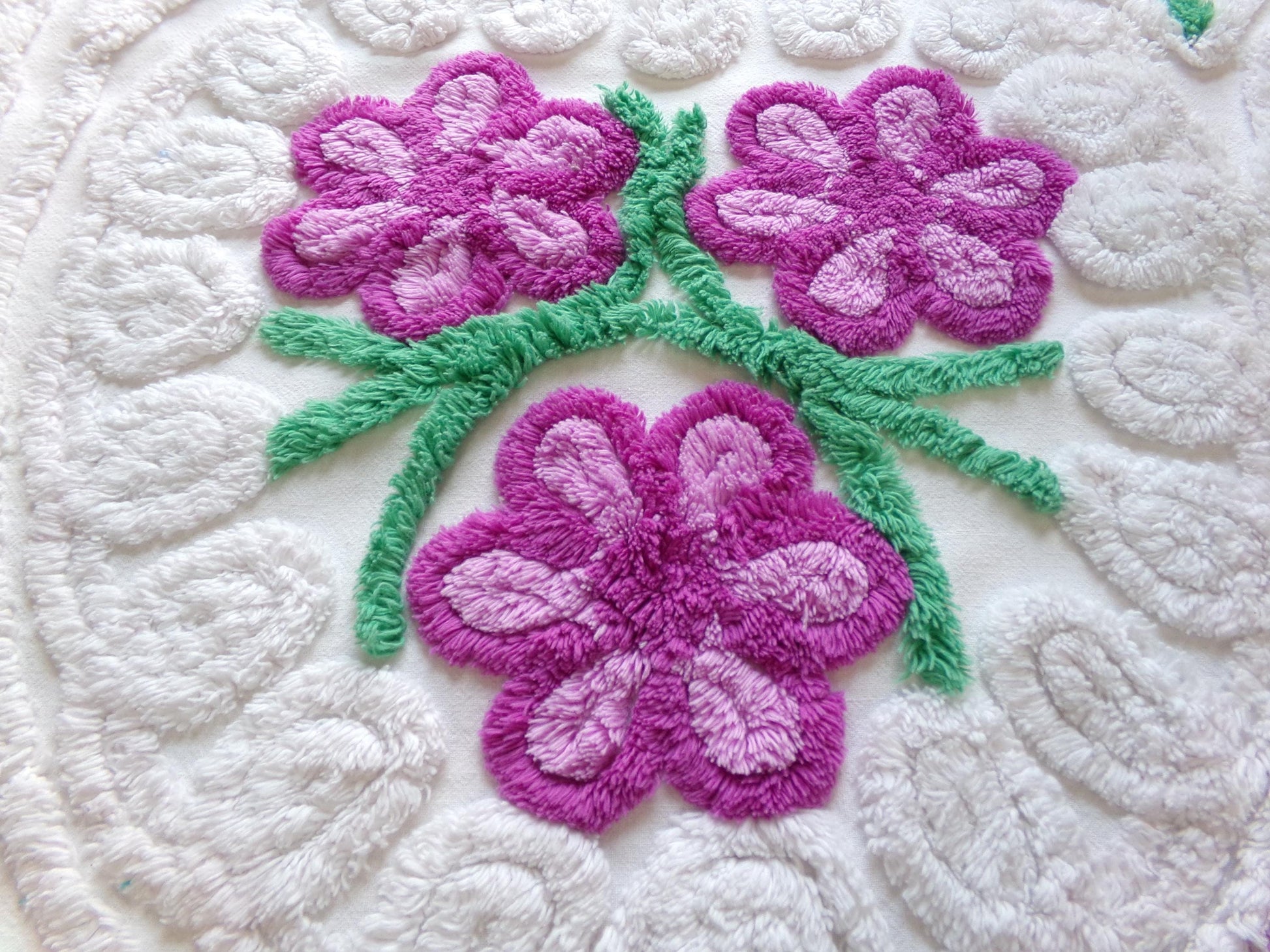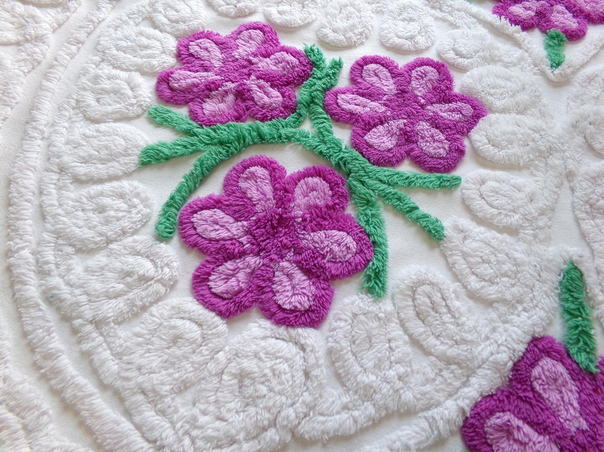 see more, cottagedivine.comIsn't this such pretty vintage chenille fabric? I love the contrast between the plush white bkgd and the lovely tufted violets. A wonderful fabric to upcycle into a DIY accent pillow...or for anything else you can dream of creating🪻