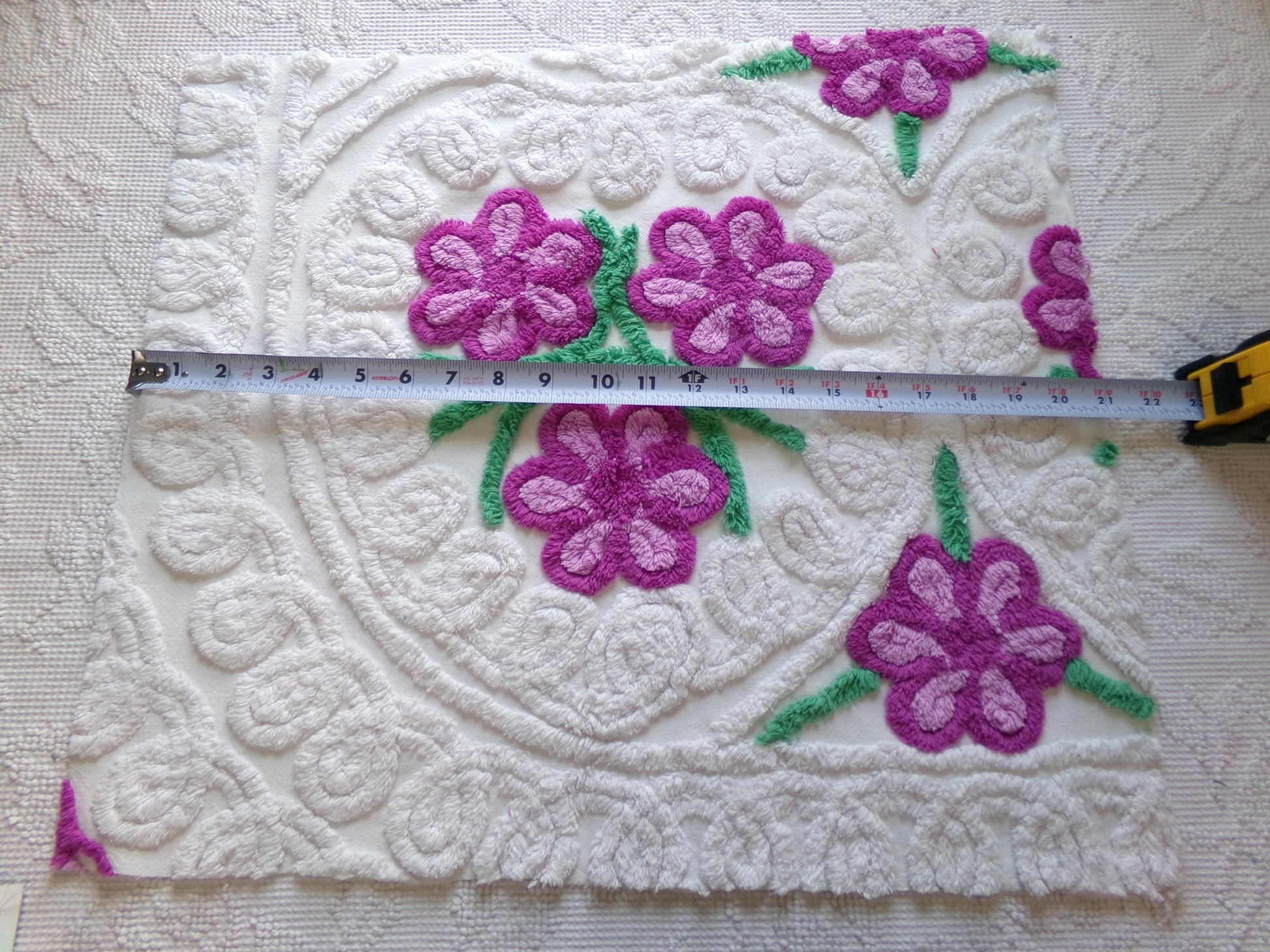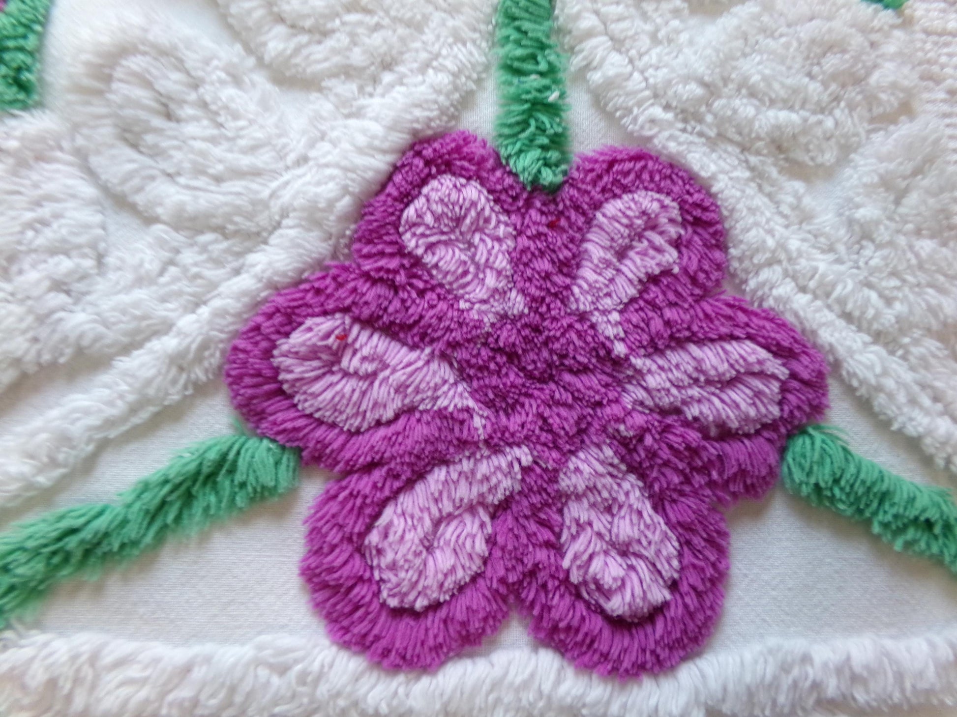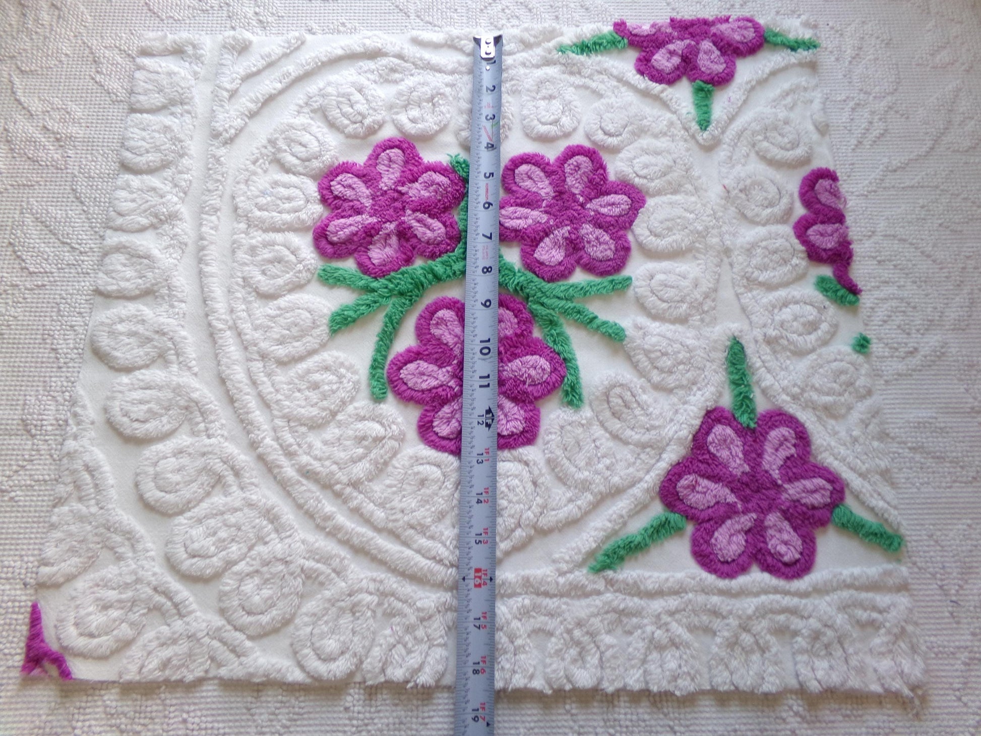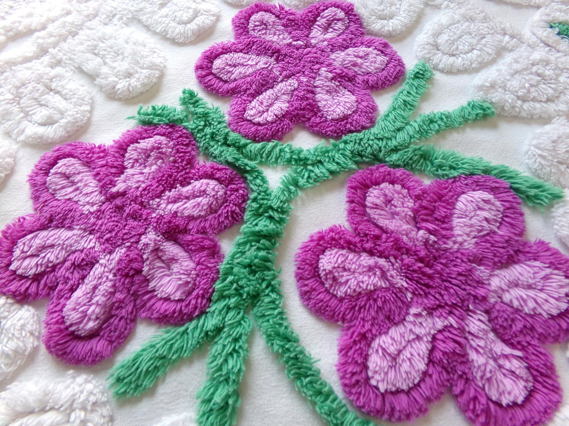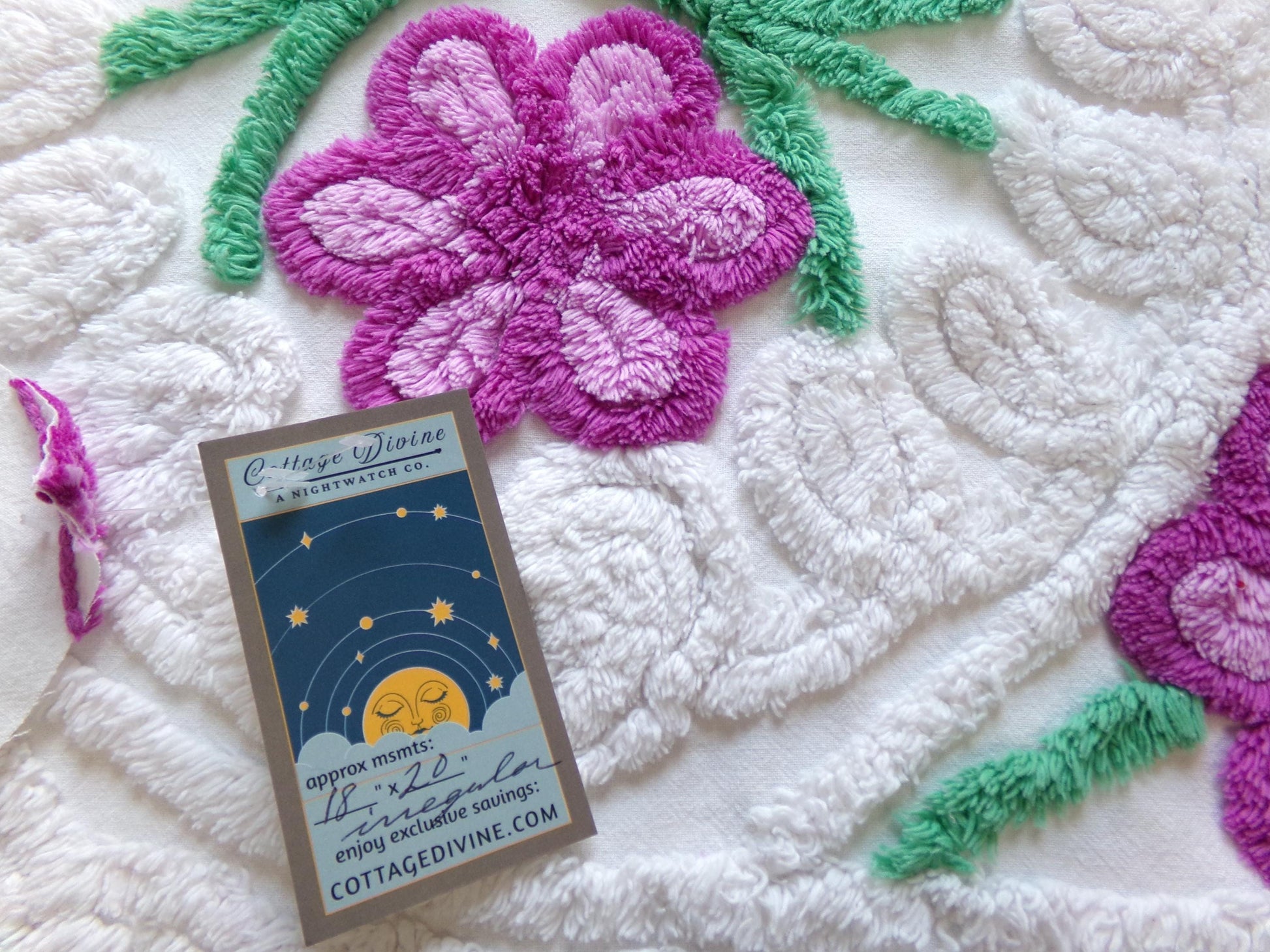 see more, cottagedivine.comIsn't this such pretty vintage chenille fabric? I love the contrast between the plush white bkgd and the lovely tufted violets. A wonderful fabric to upcycle into a DIY accent pillow...or for anything else you can dream of creating🪻