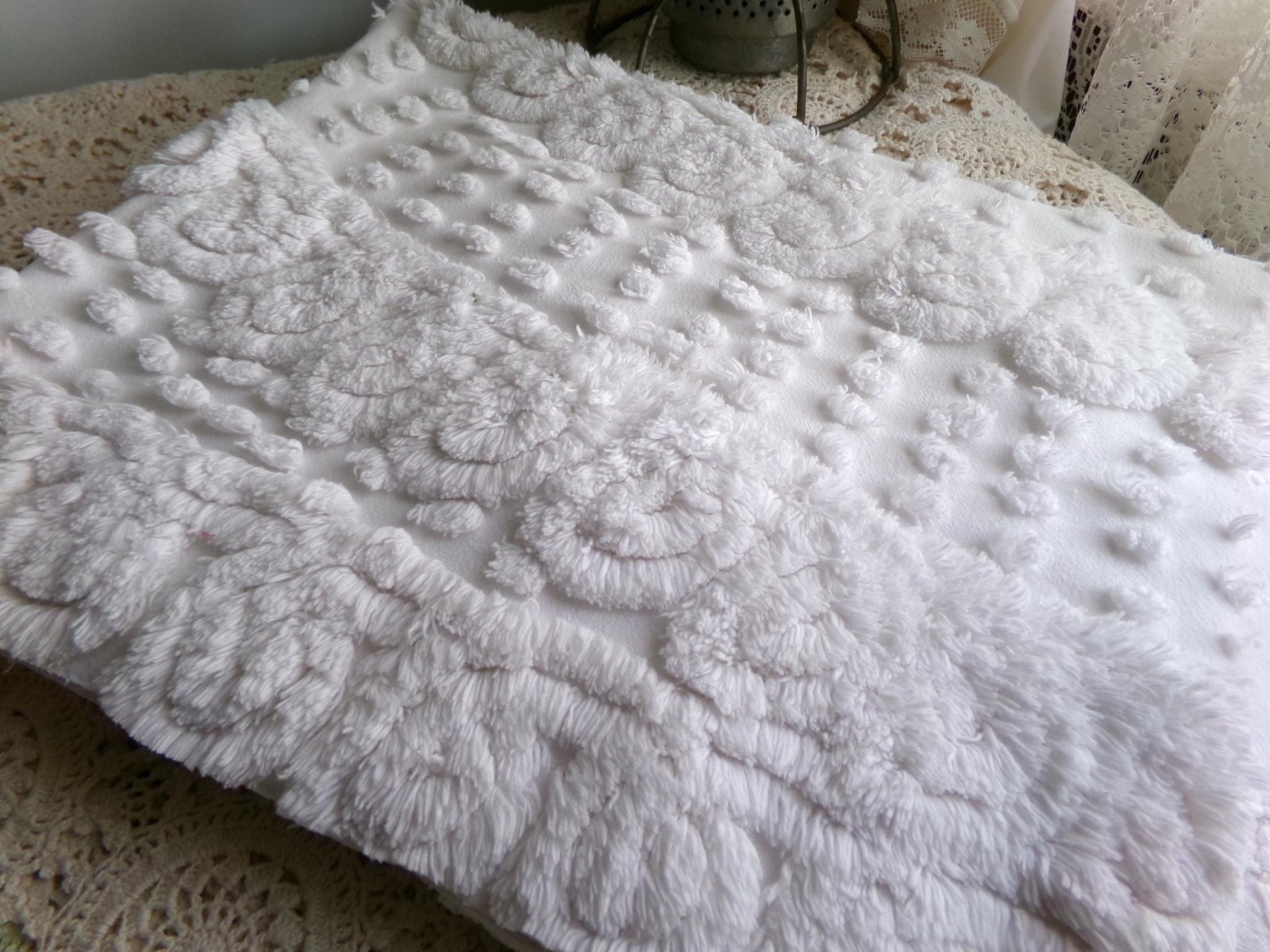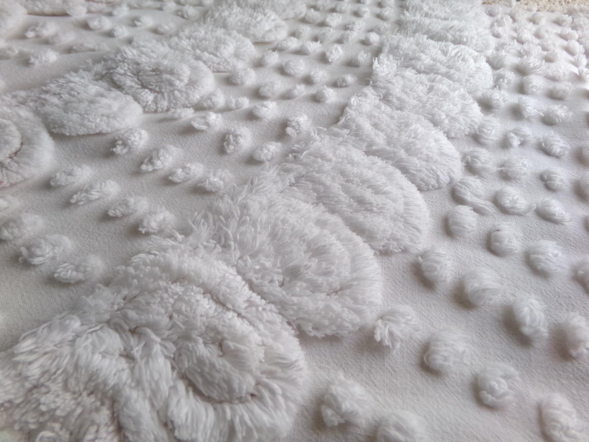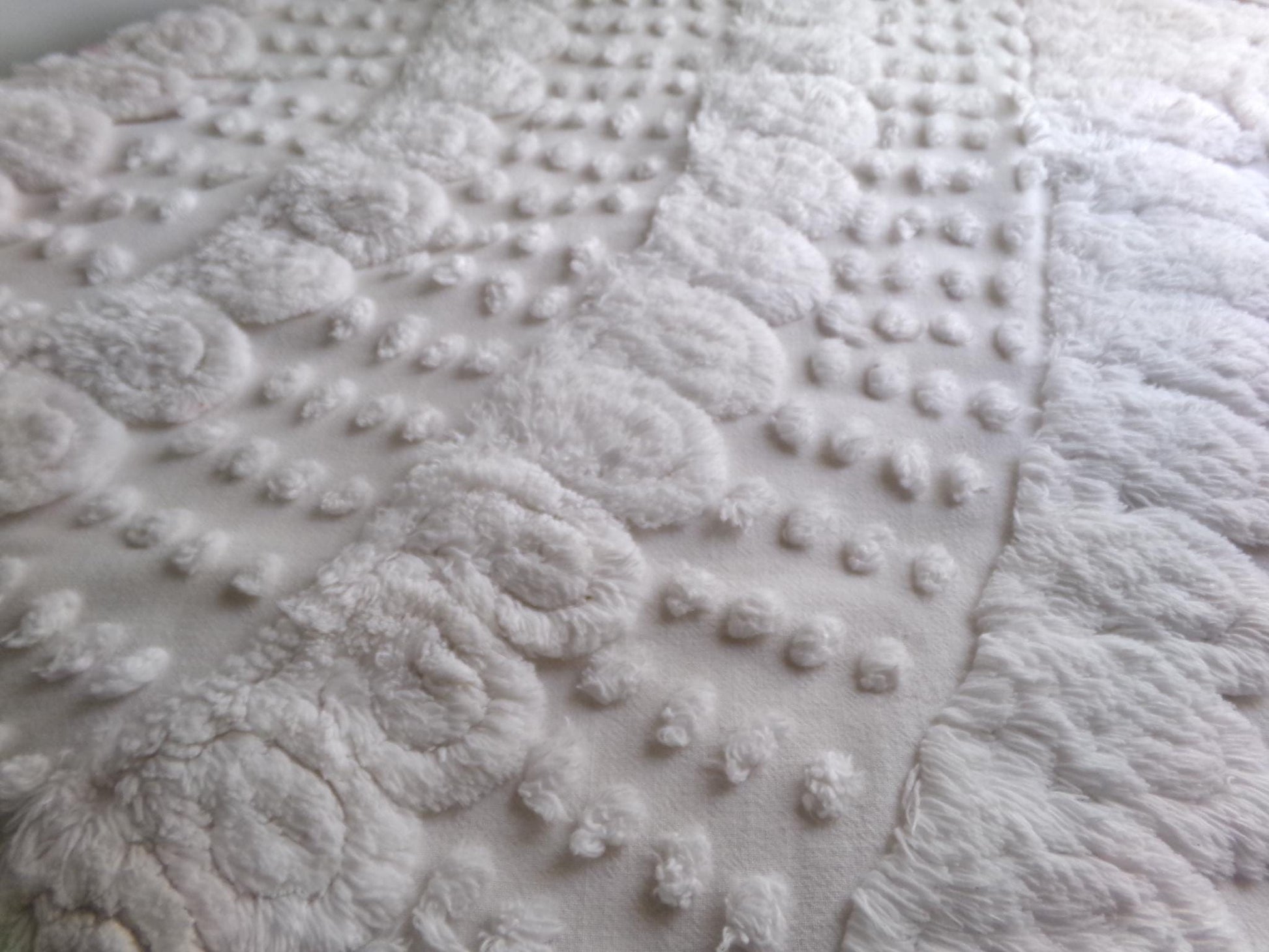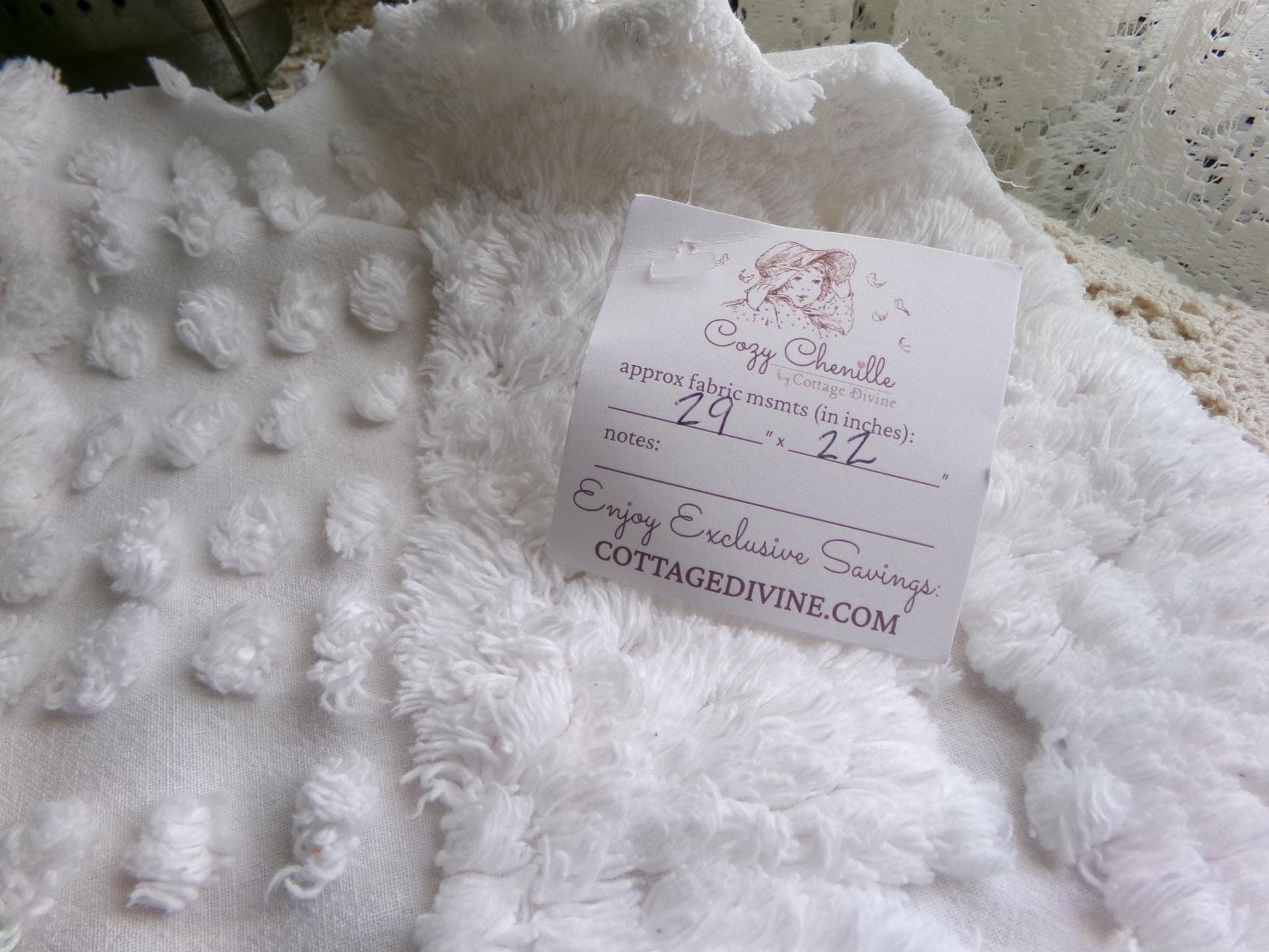 If your creative design calls for timeless elegance and grace in a striking presentation, you'll enjoy this stunning piece of vintage chenille fabric. It features an optic swirl dot design in whisper white, with plush curlicues that are separated by curved rows of puff dots.100% plush tuft cotton. Piece measures about 29" x 22" inches. Small age spot on back which didn't photograph & seems obscured by tufts on the front.