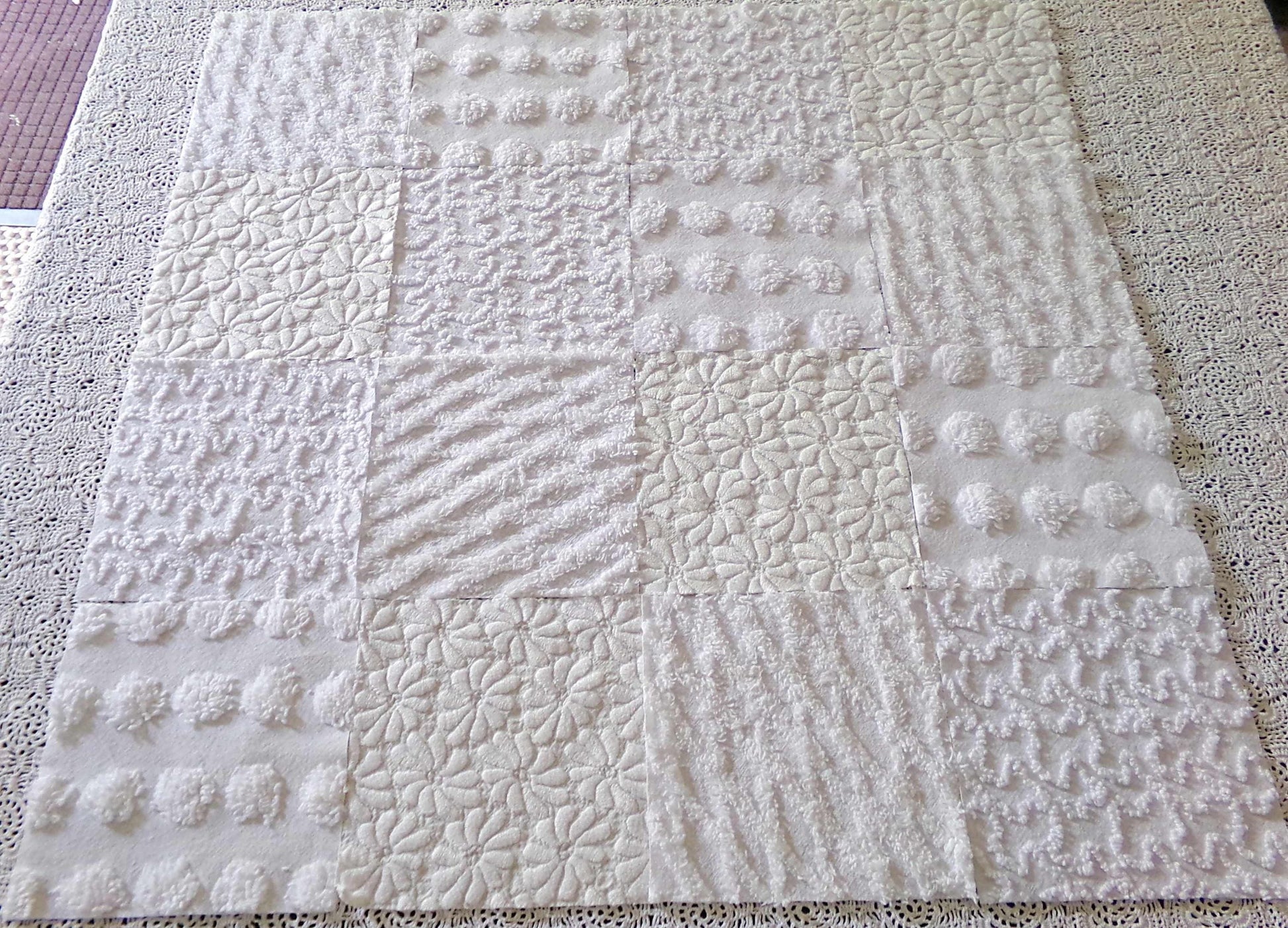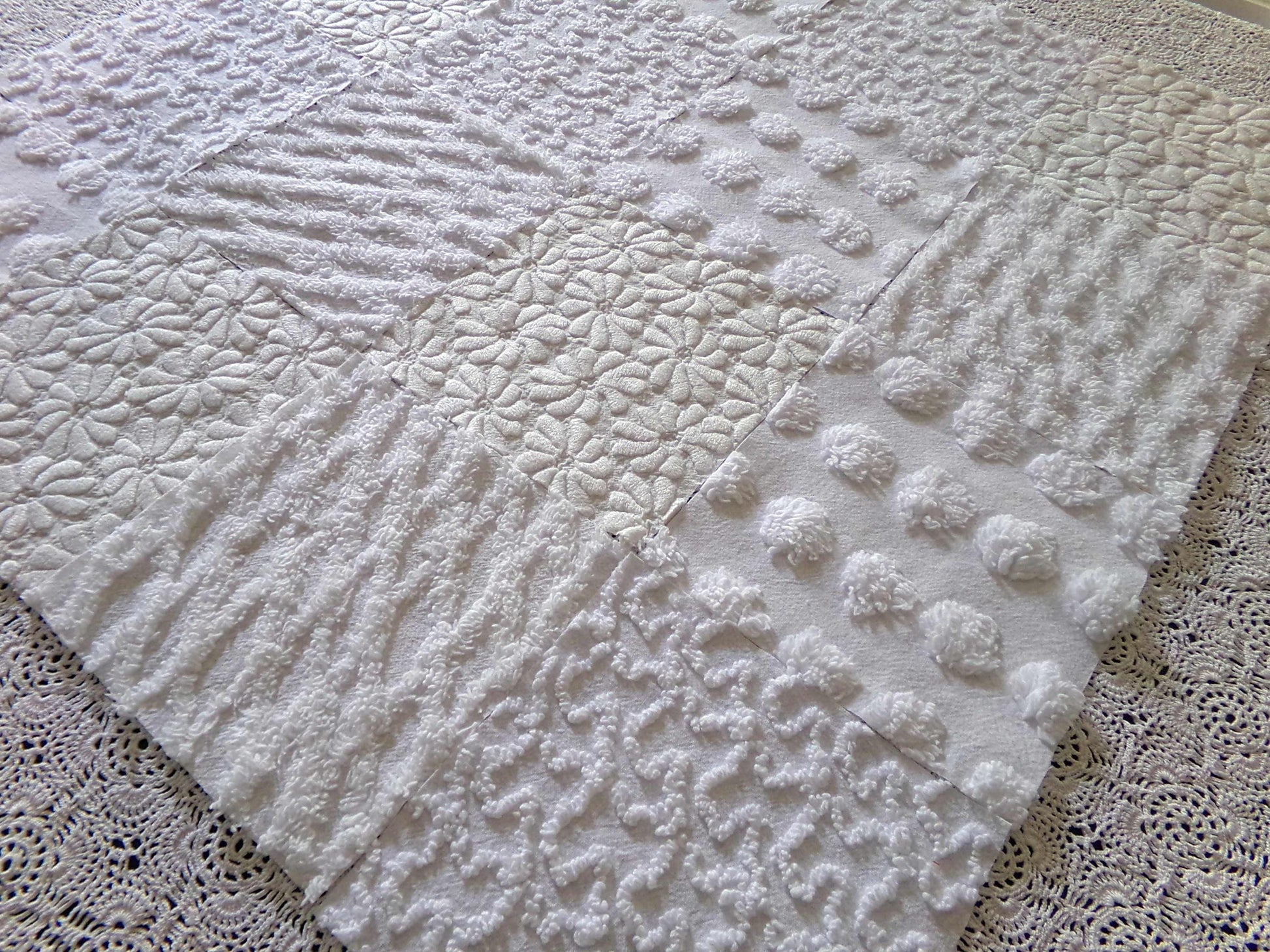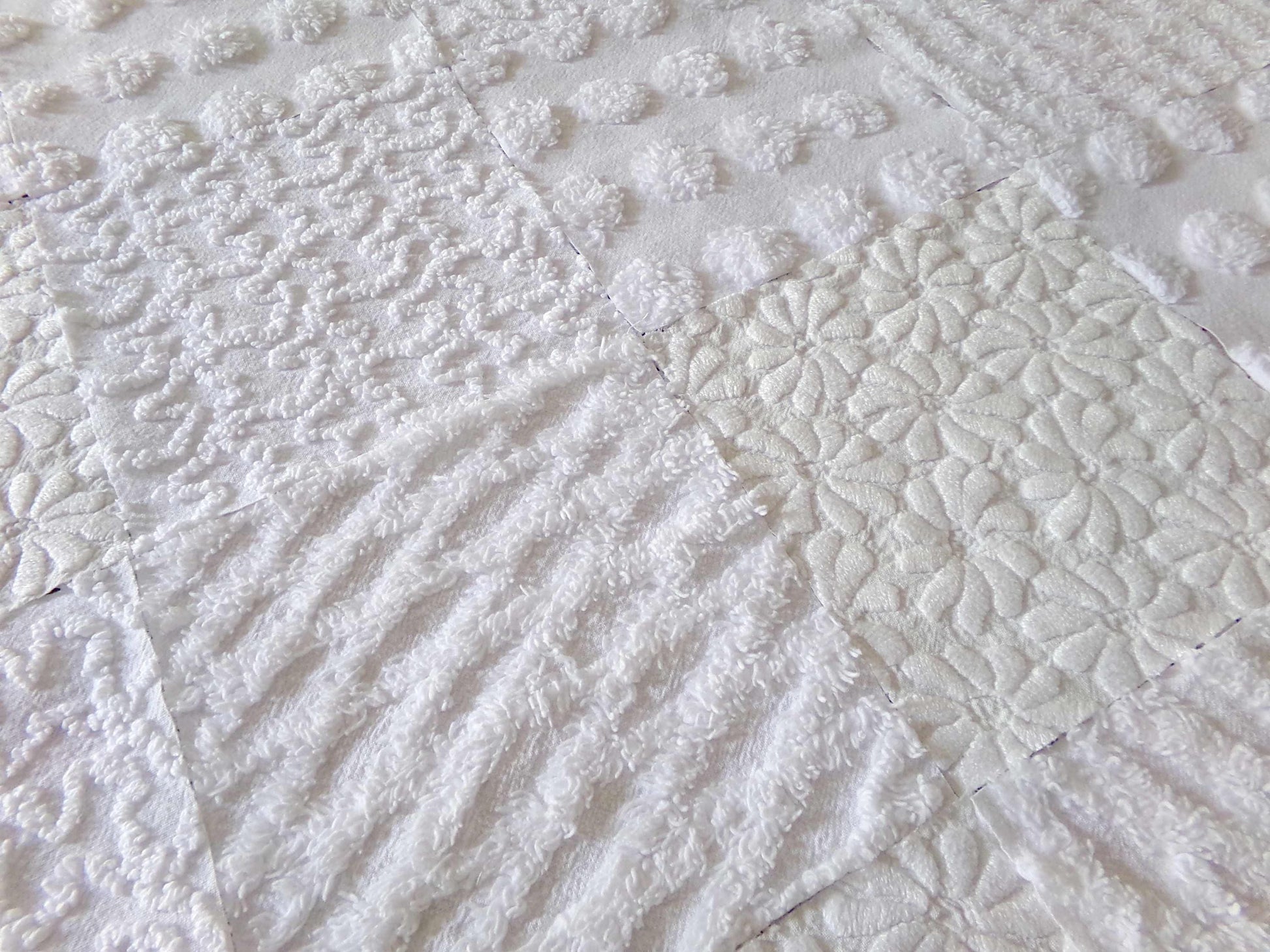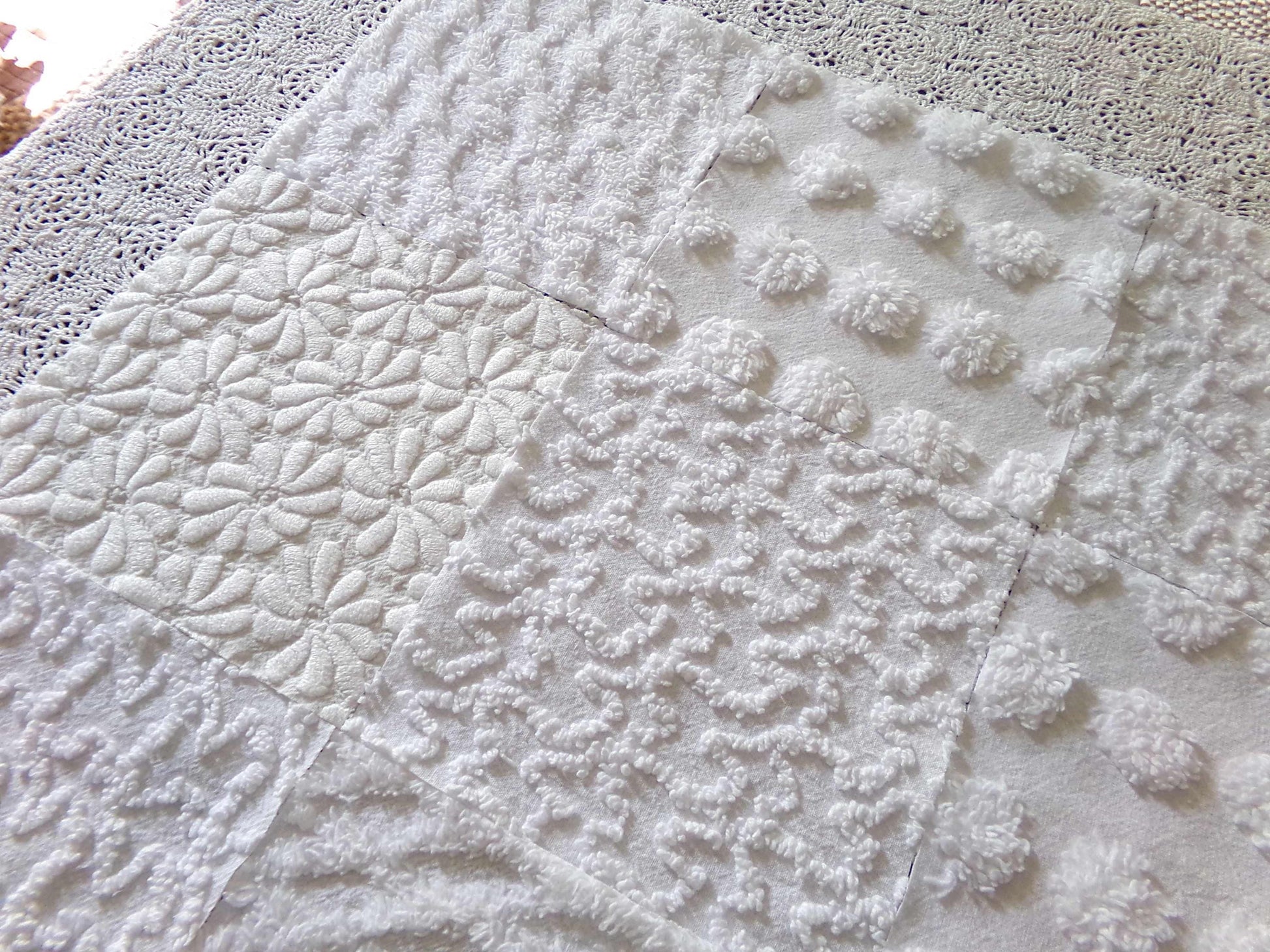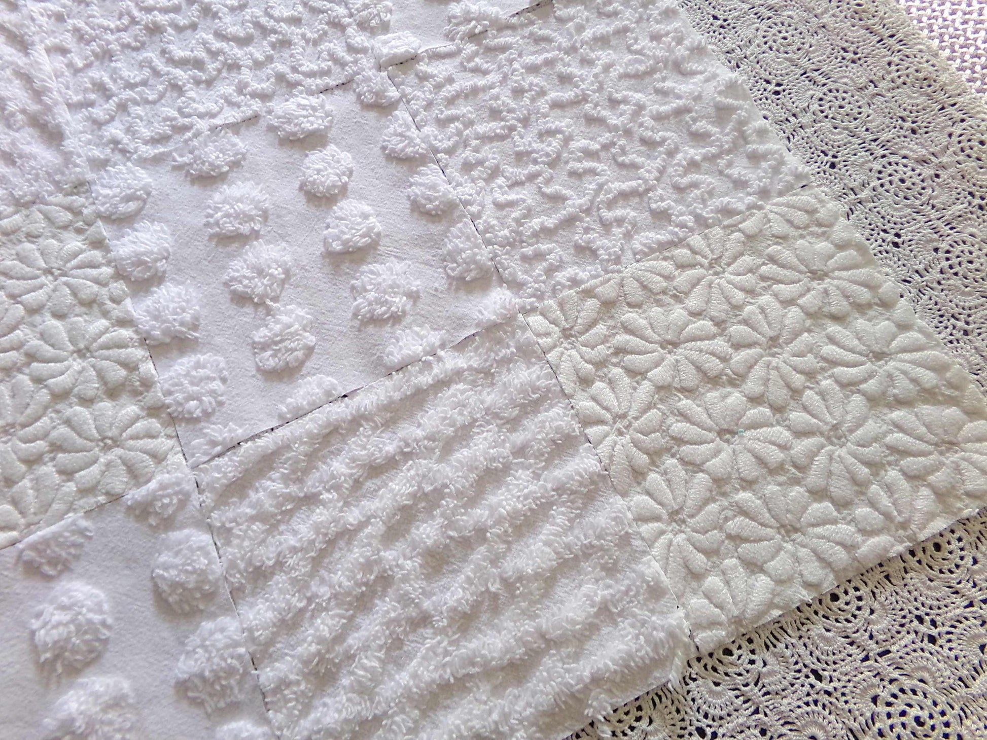 *Daisies in Snow* Inspire or enhance your next quilt or craft project with this classic set of vintage chenille fabric squares in shades of white. You'll receive 4 each of the following patterns: coin pop, diamond lattice, squiggles & woven daisies, which show more of an aged white cast, creating a nice contrast to the other fluffier, brighter white tone. All blocks lovingly selected & cut from original vintage chenille bedspreads.::total qty: 16 chenille fabric quilt squares