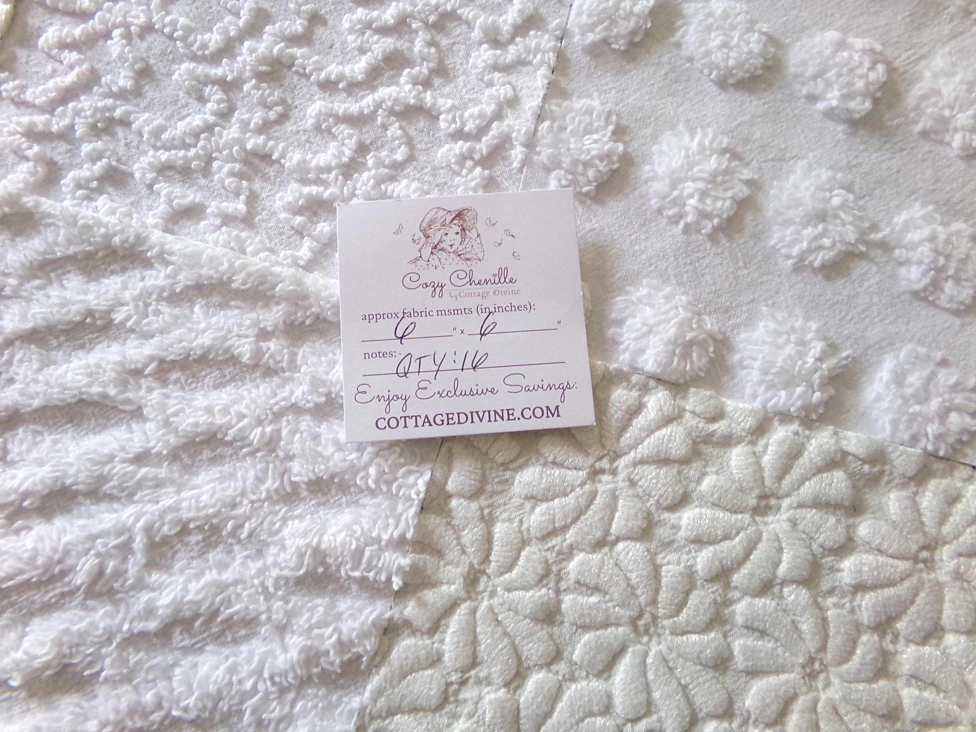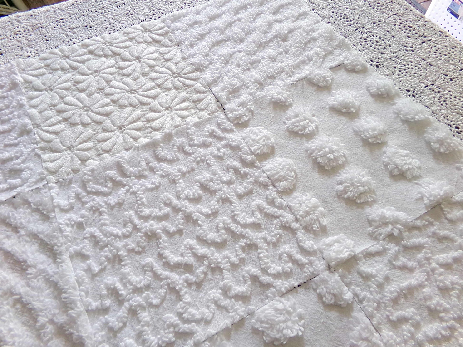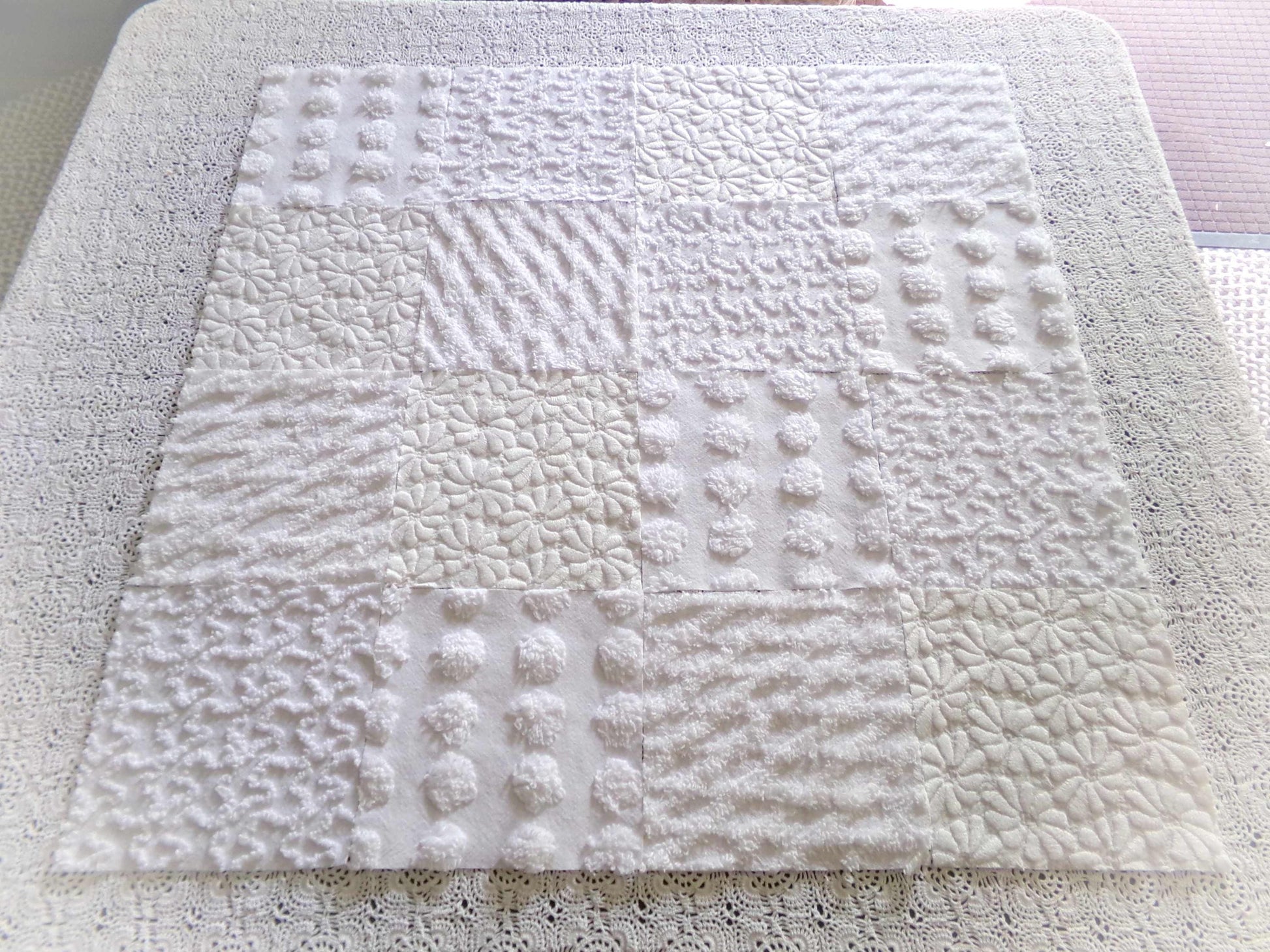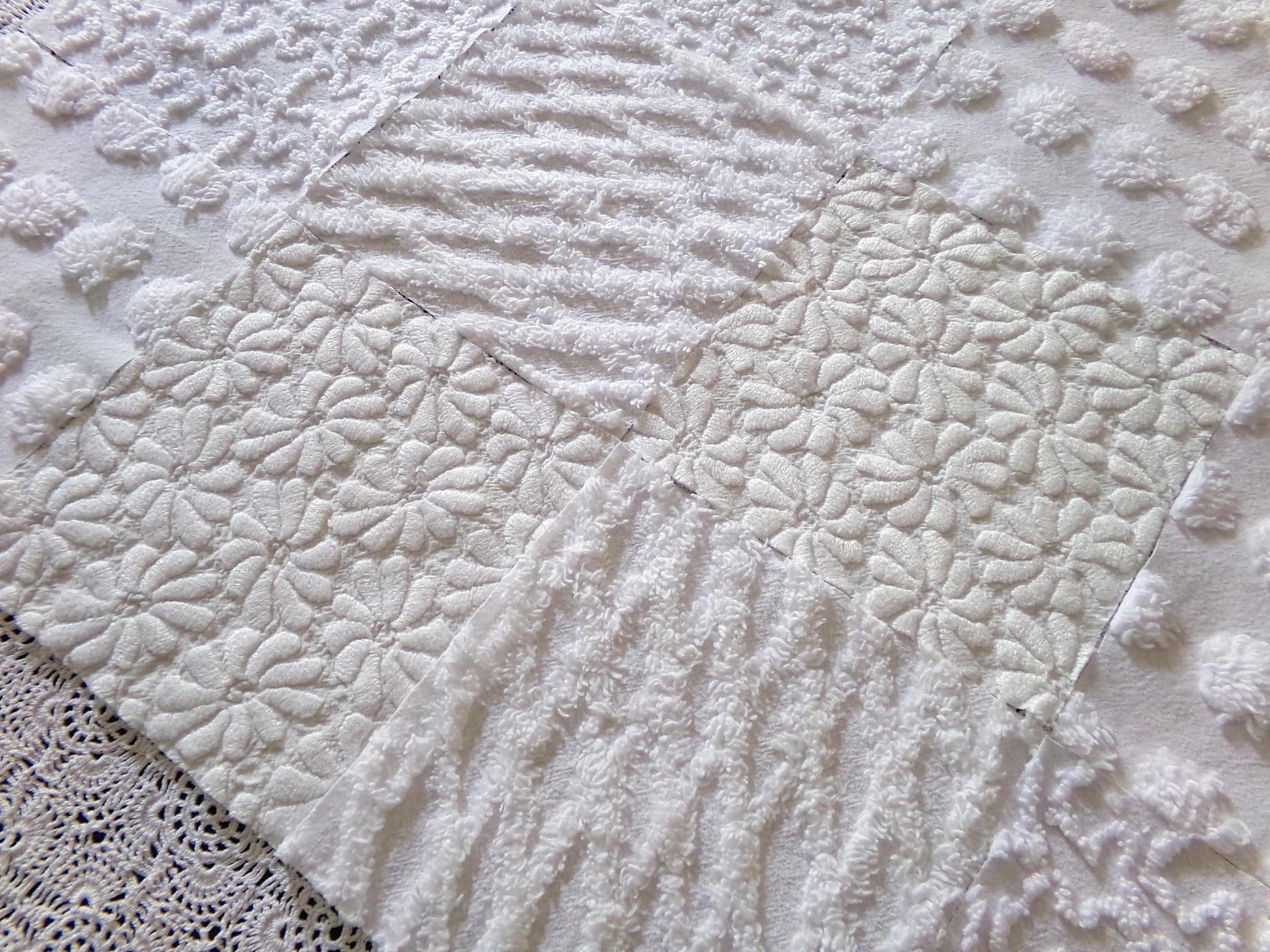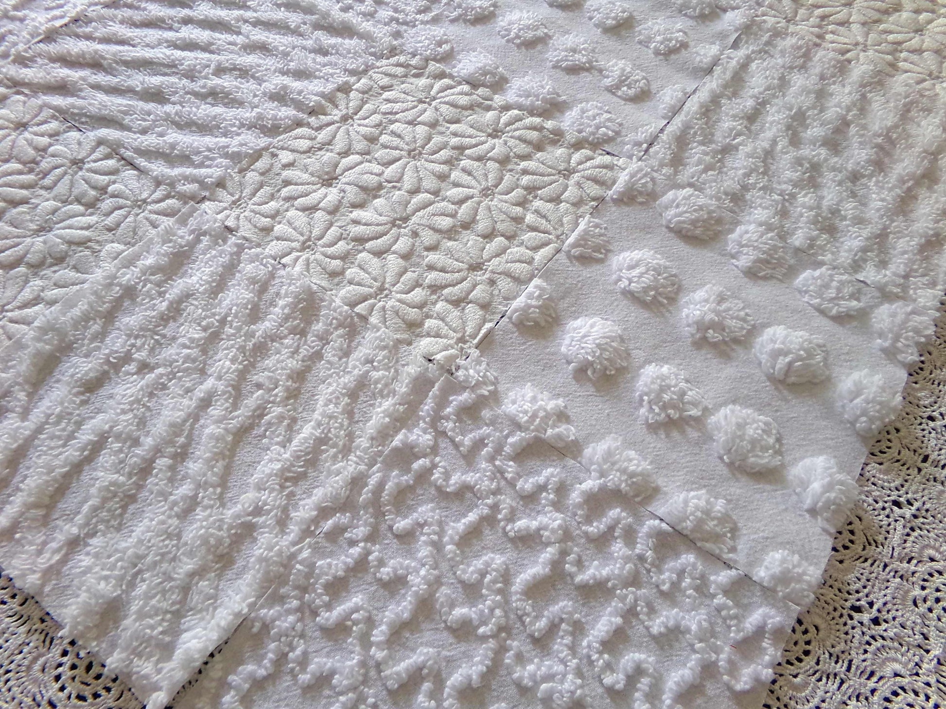 *Daisies in Snow* Inspire or enhance your next quilt or craft project with this classic set of vintage chenille fabric squares in shades of white. You'll receive 4 each of the following patterns: coin pop, diamond lattice, squiggles & woven daisies, which show more of an aged white cast, creating a nice contrast to the other fluffier, brighter white tone. All blocks lovingly selected & cut from original vintage chenille bedspreads.::total qty: 16 chenille fabric quilt squares