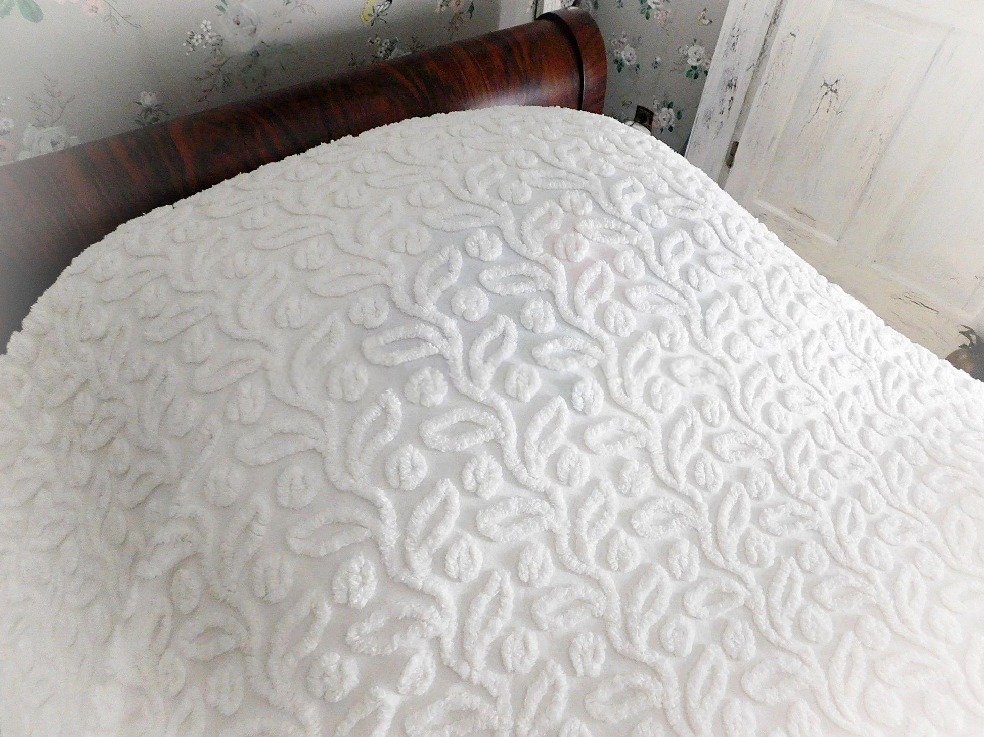This is an exquisite example of the fine craftsmanship of a very popular vintage chenille manufacturer - W. Hofmann Textiles. This gorgeous full size antique chenille bedspread features an elusive ivy & berries pattern in a white on white colorway. It is accented by beautiful quality fringe along the drop sides. Original cloth tag frayed somewhat, but remains present.Typical to all Hofmann's, lightweight 100% cotton base cloth adorned with intricate chenille tuft work. A few minor spots such as seen; upper hemline intact but may show a bit of even, light age related discoloration (see both examples in final image).
