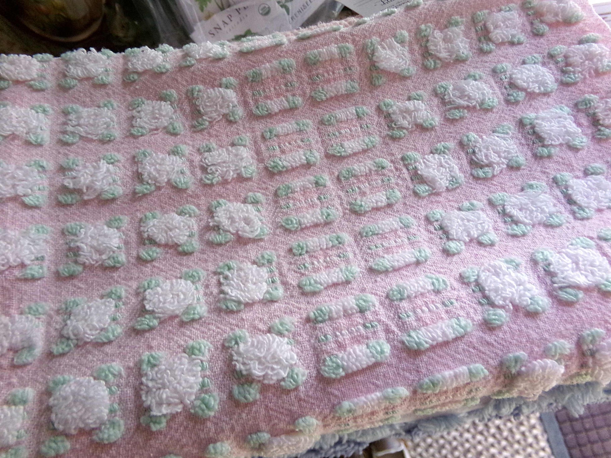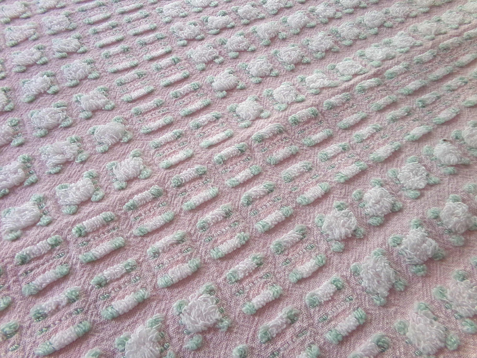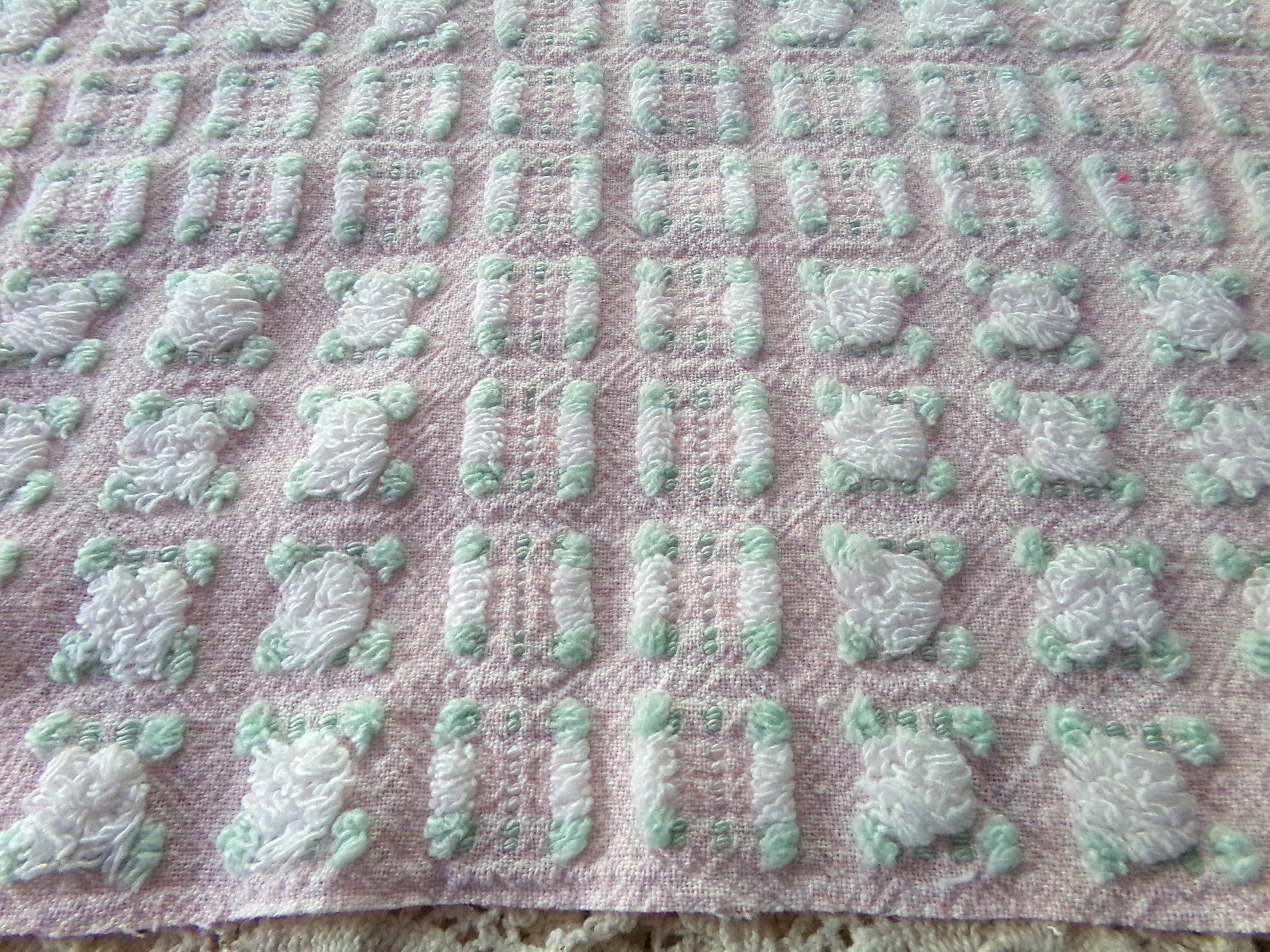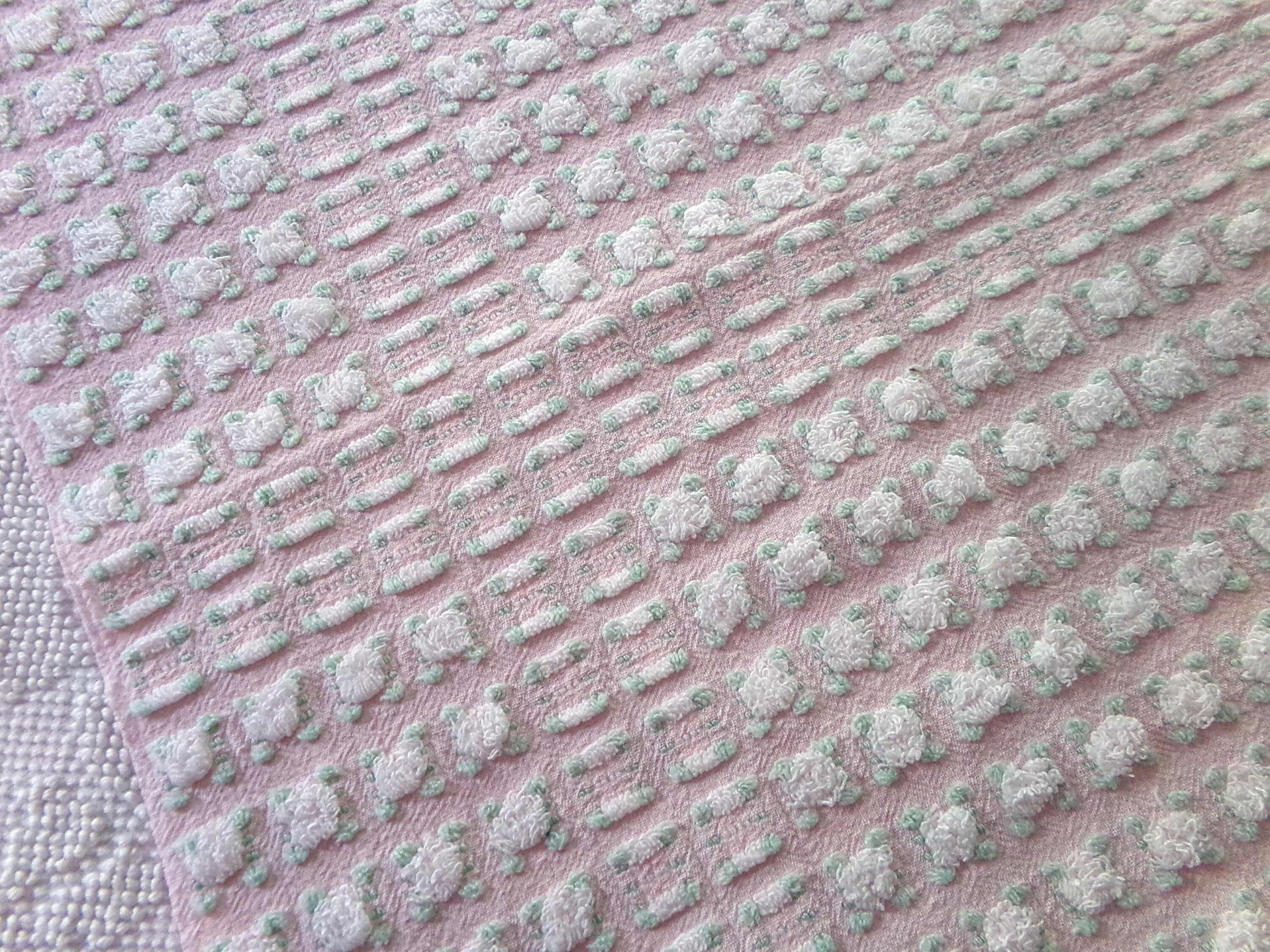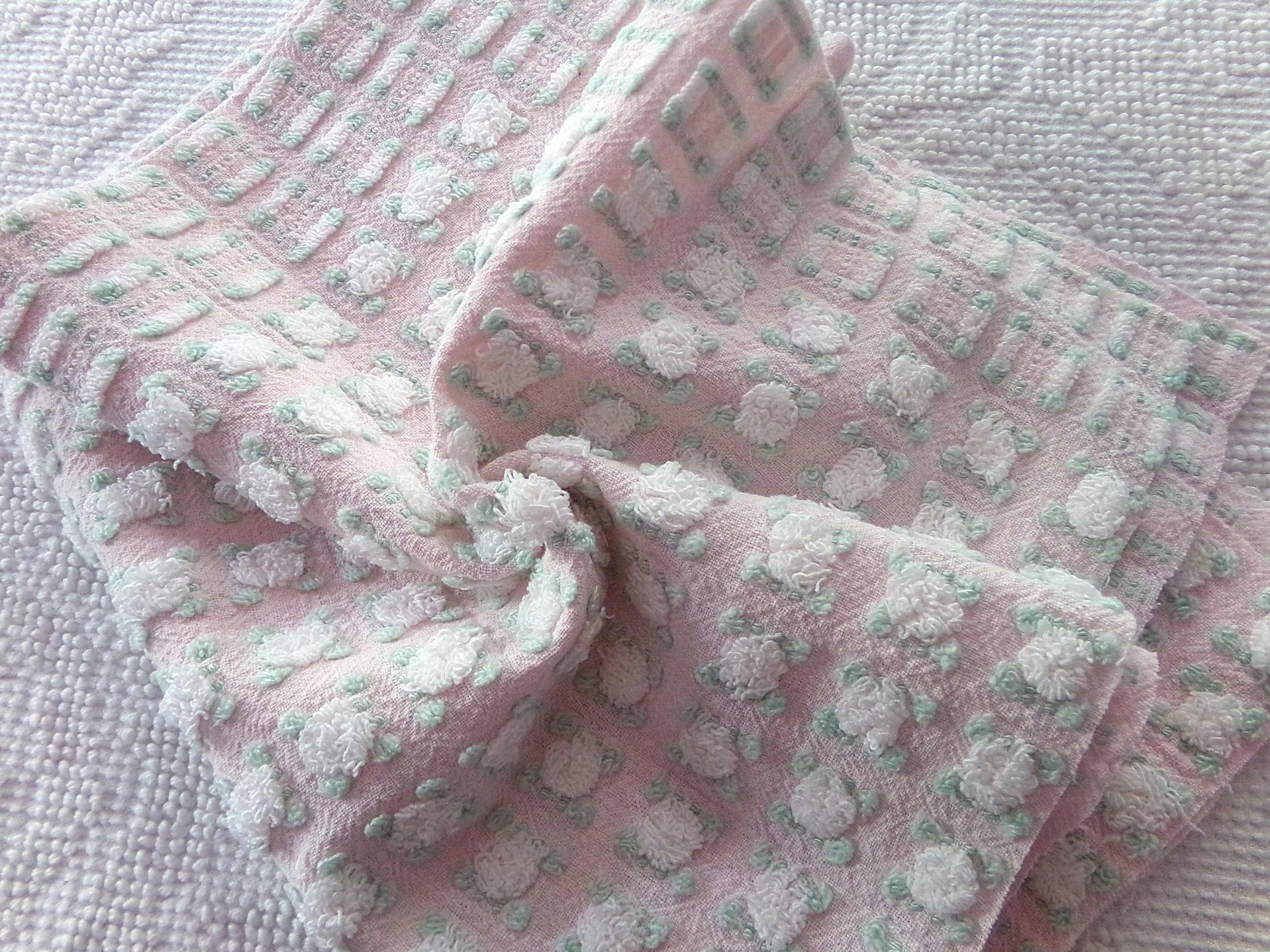 Simply so beautiful, this vintage chenille fabric features lovely white rosebuds set on a pretty pink bkgd. This is a rare "phantom" rose pattern by Morgan Jones, where rows of "empty" rosebuds contrast with plump roses.