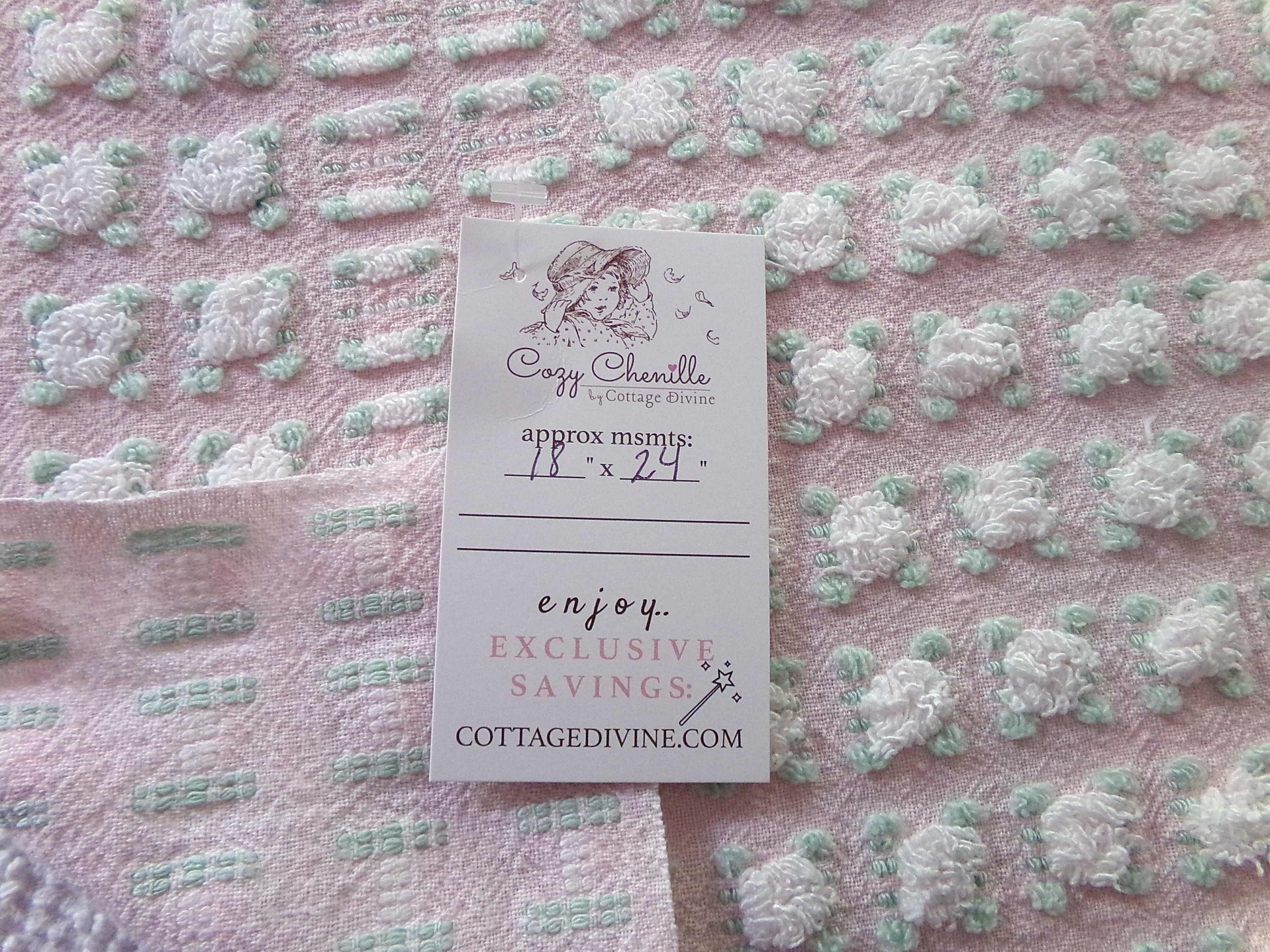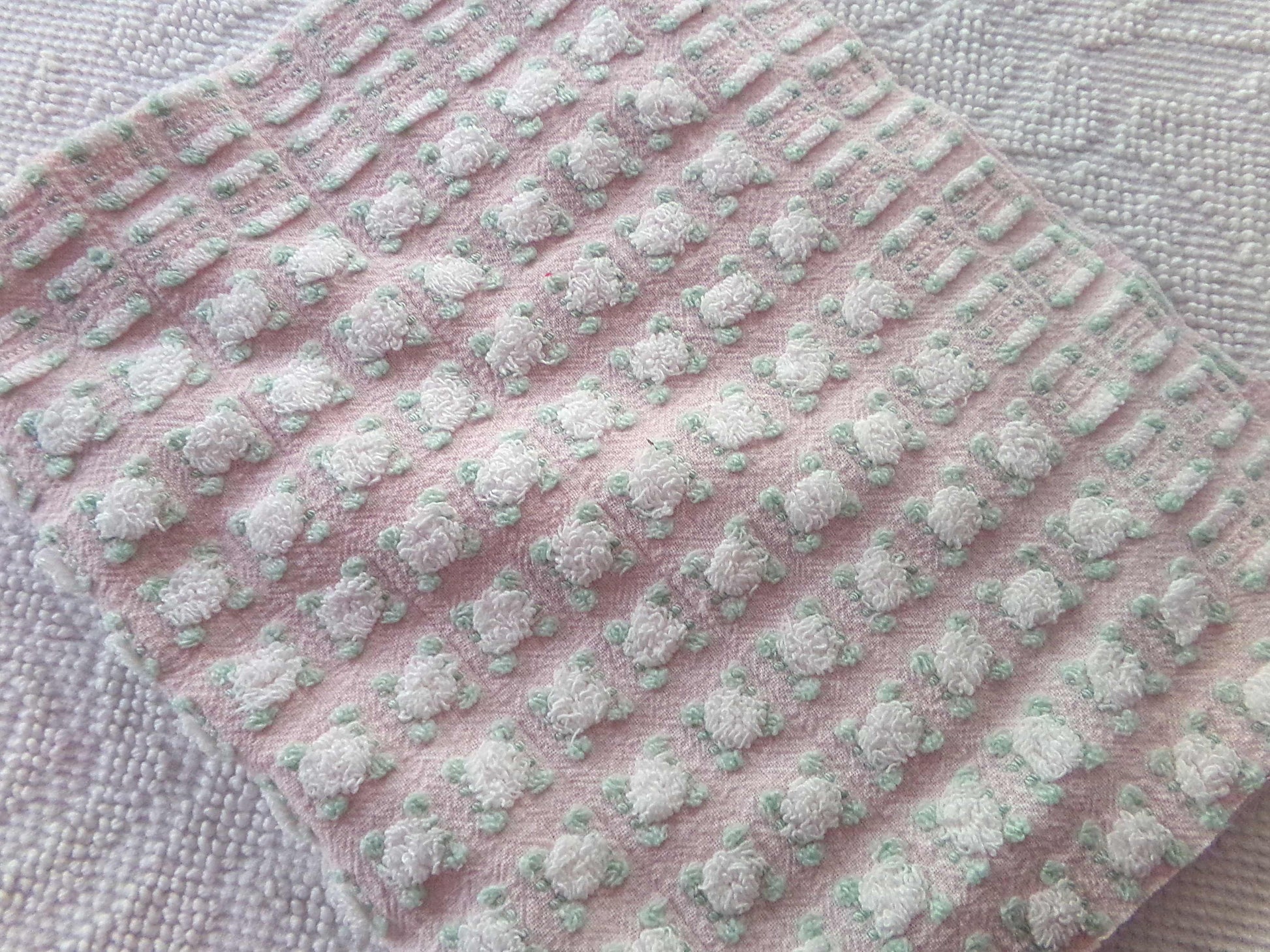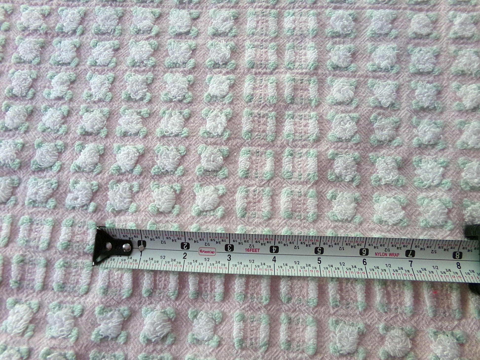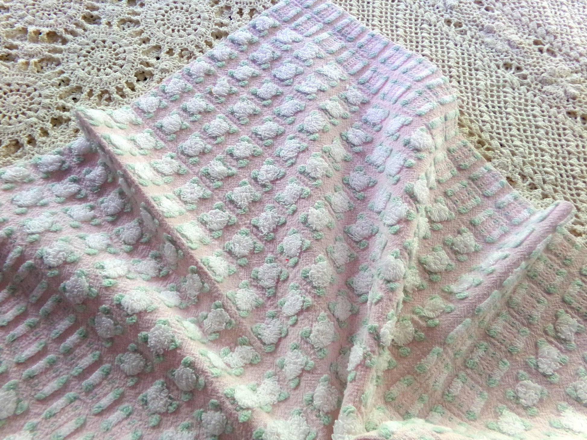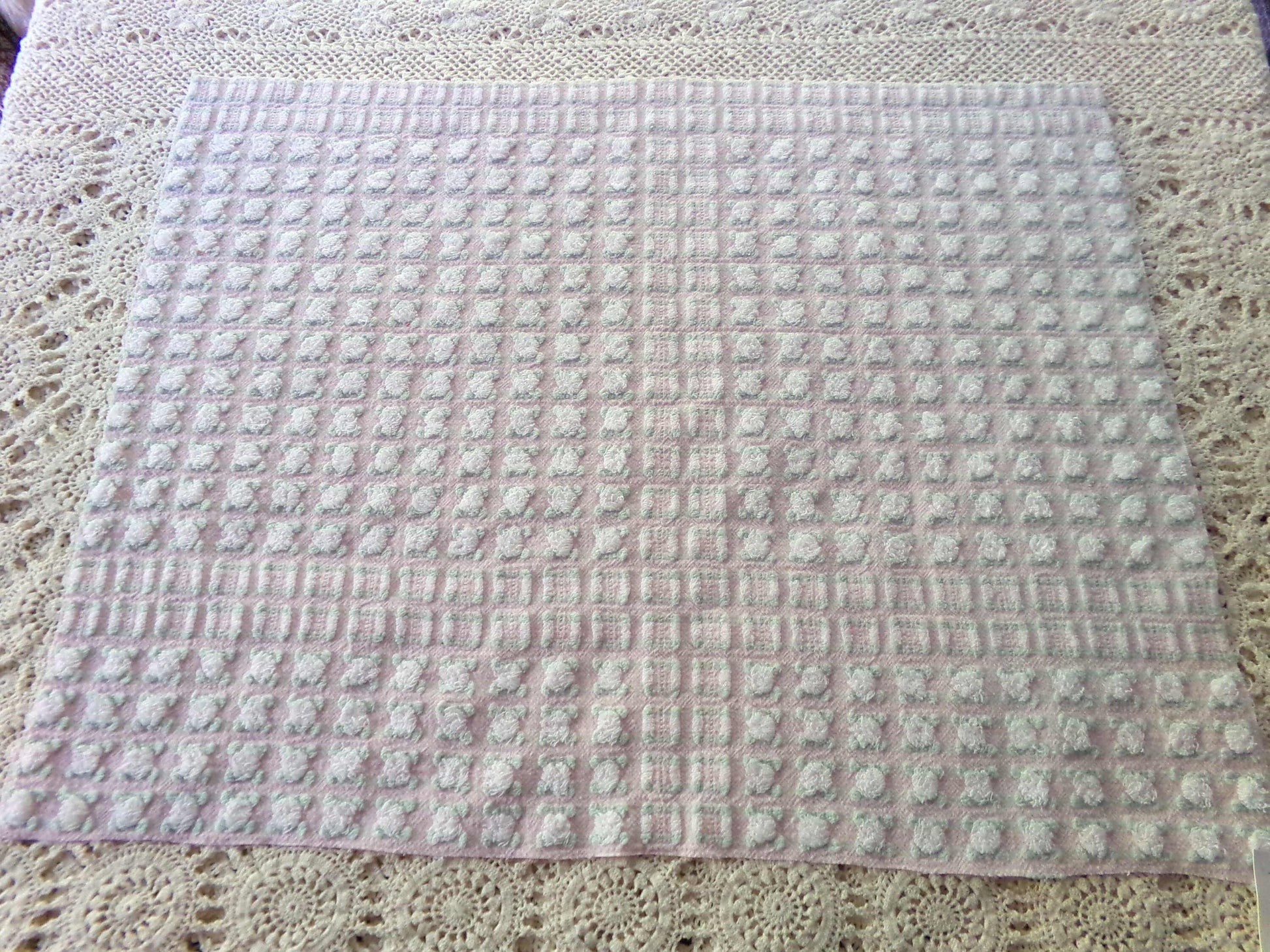 Simply so beautiful, this vintage chenille fabric features lovely white rosebuds set on a pretty pink bkgd. This is a rare "phantom" rose pattern by Morgan Jones, where rows of "empty" rosebuds contrast with plump roses.