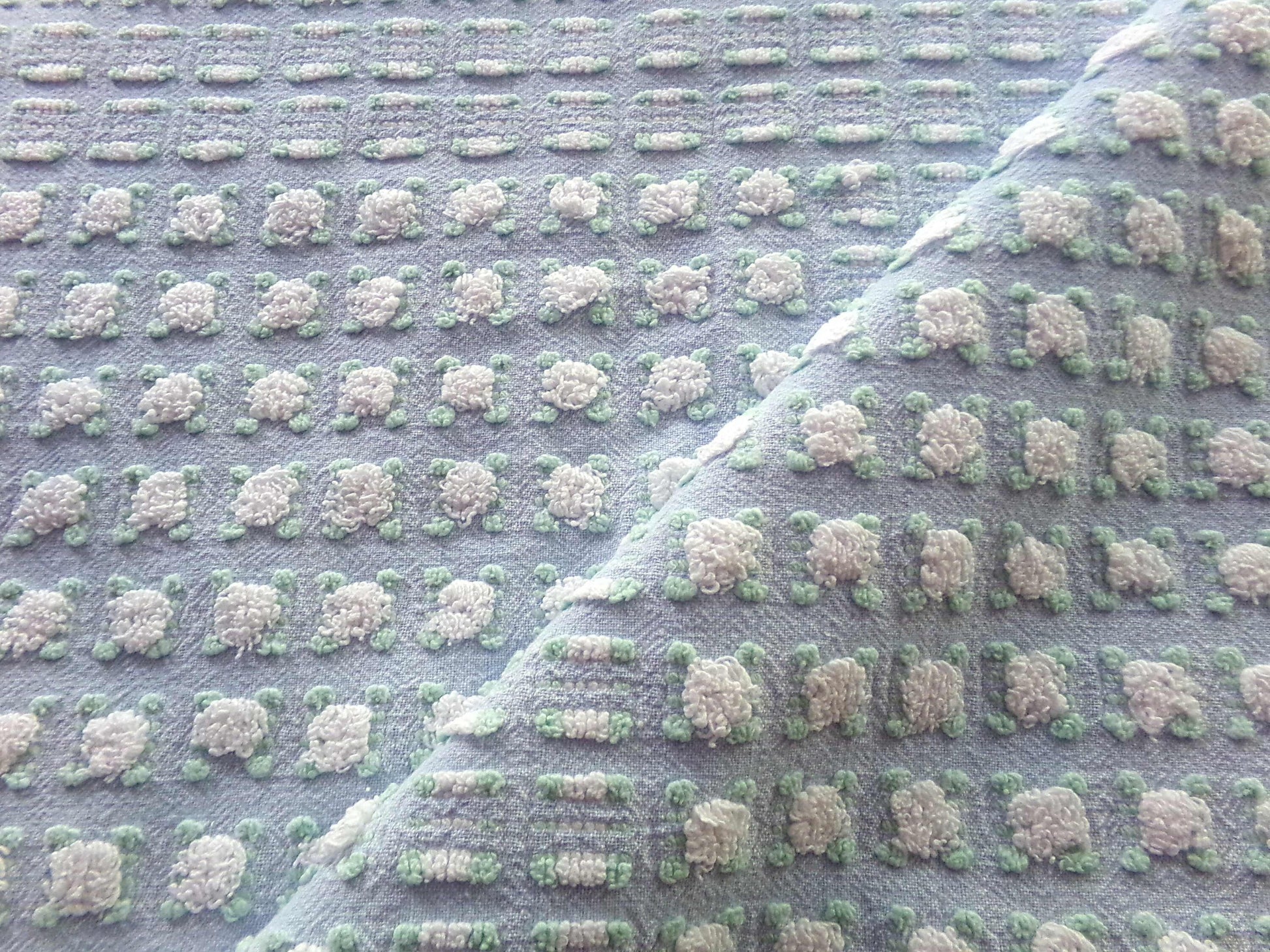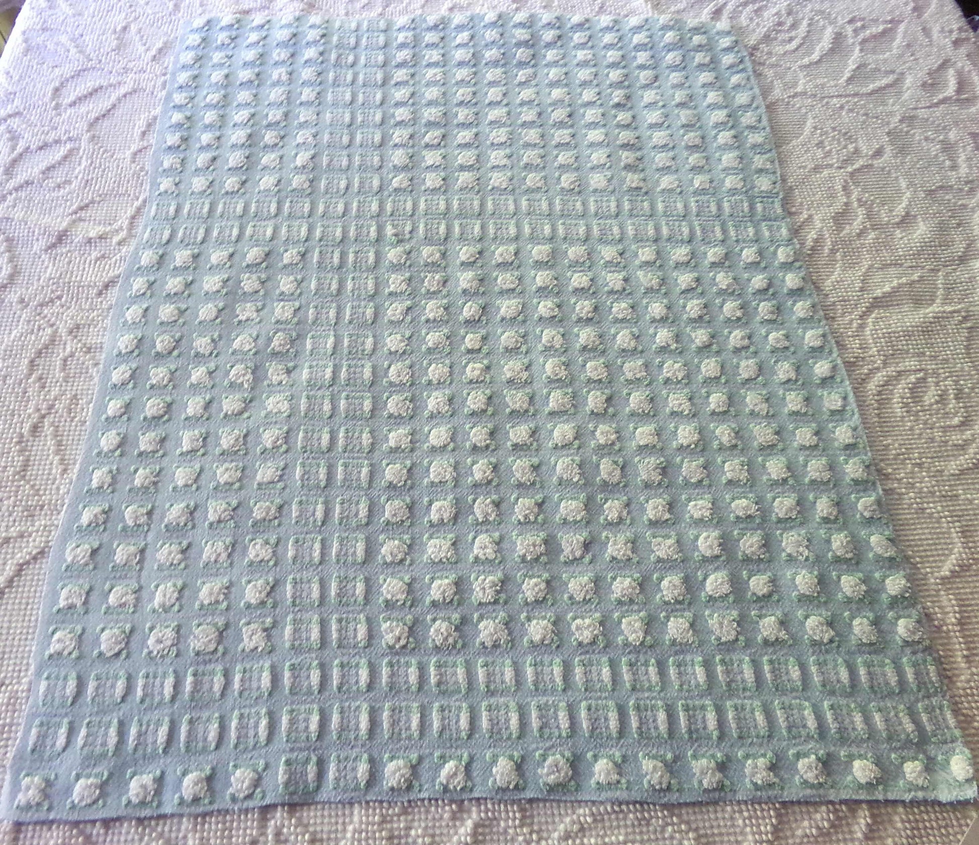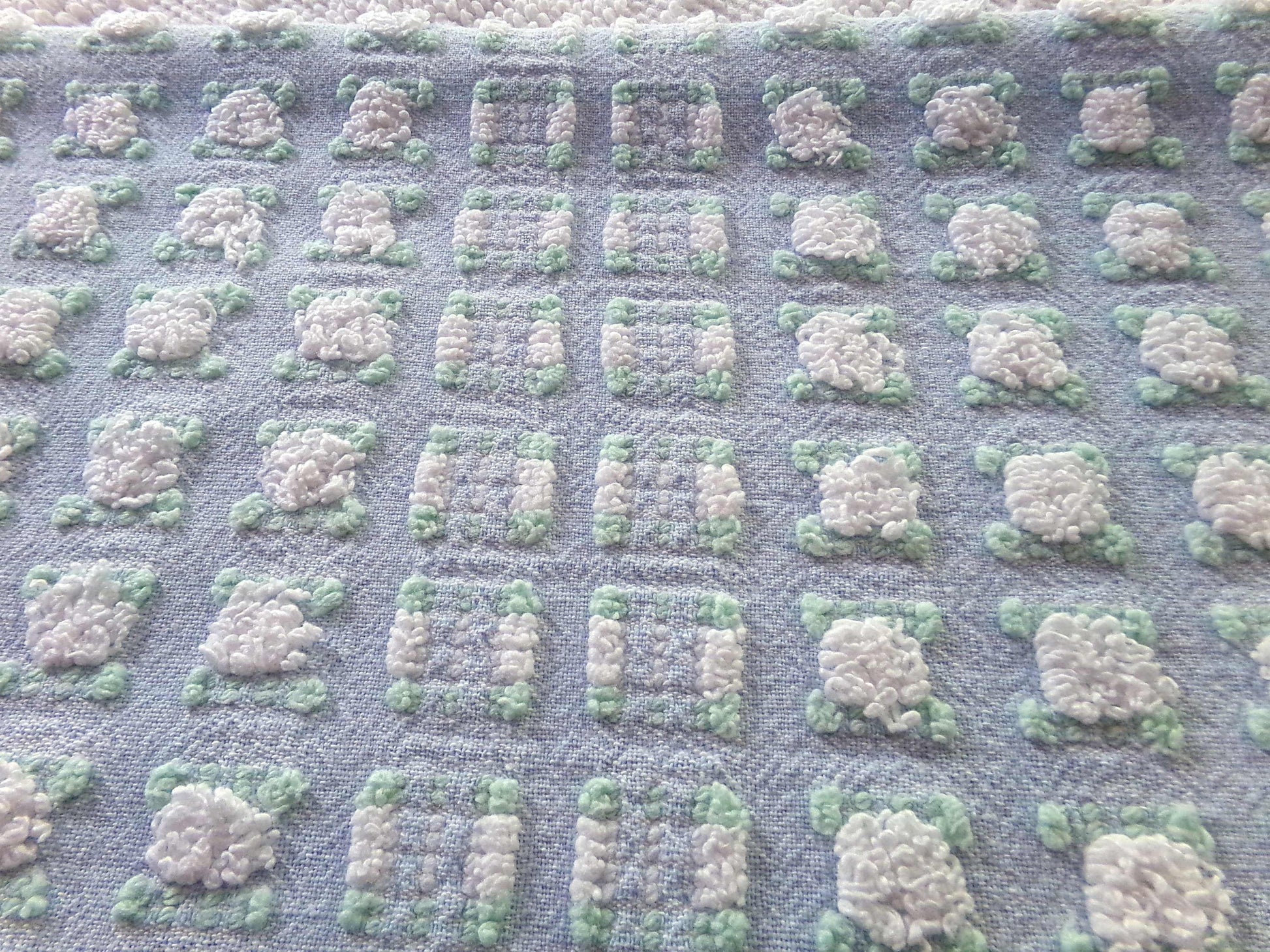Looking for a fabric that exudes classic cottage style...with a unique twist? This rare vintage chenille fabric piece features a dreamy "phantom" blue & white rosebud pattern - a geometric latticework design alternating between plump white rosebuds and their counterparts, empty "ghosts" or "phantoms."Piece measures approx 18.5" x 24" inches. An original 1960s era Morgan Jones design. Soothing, serene colorway that adapts well to light.