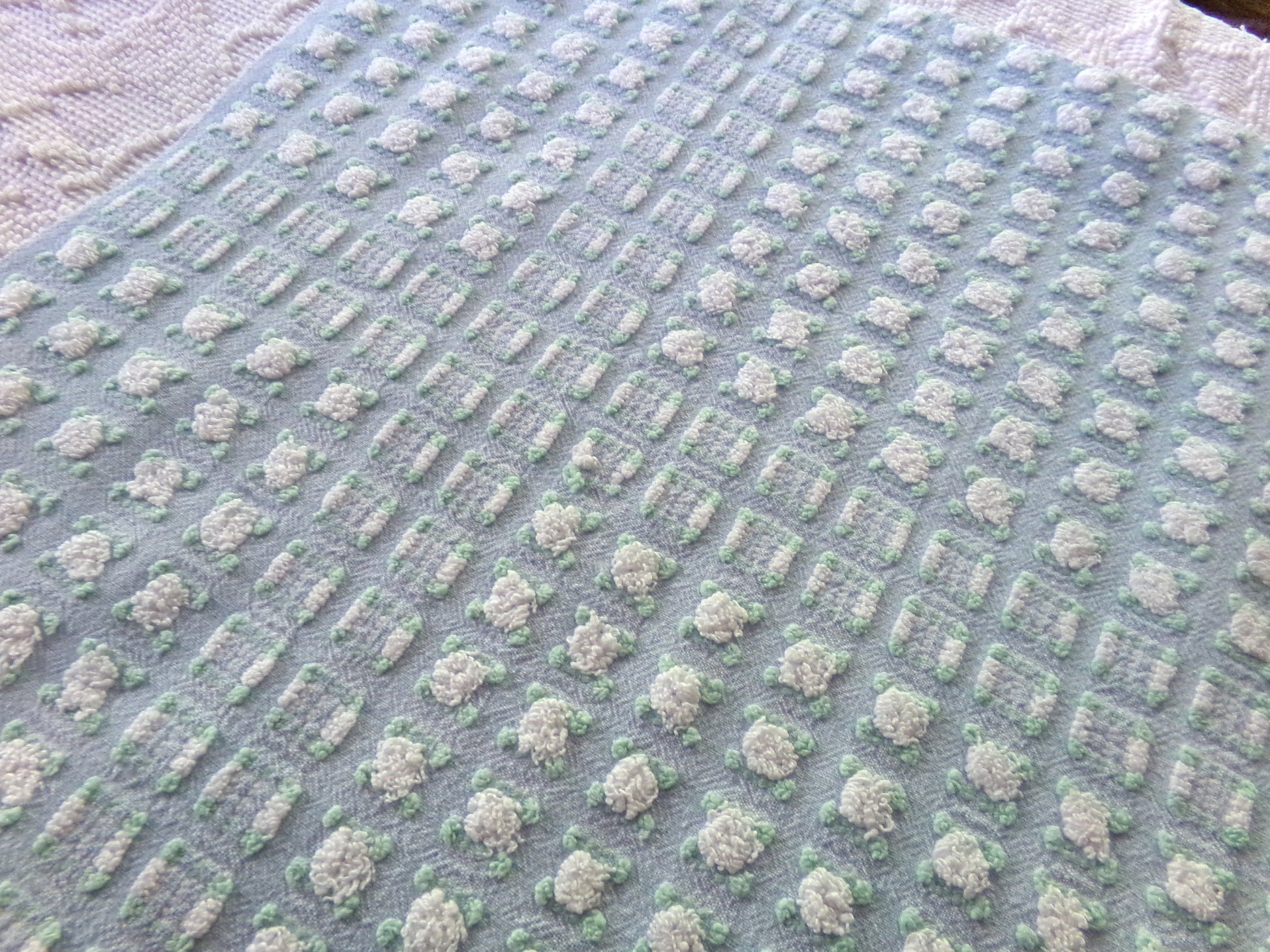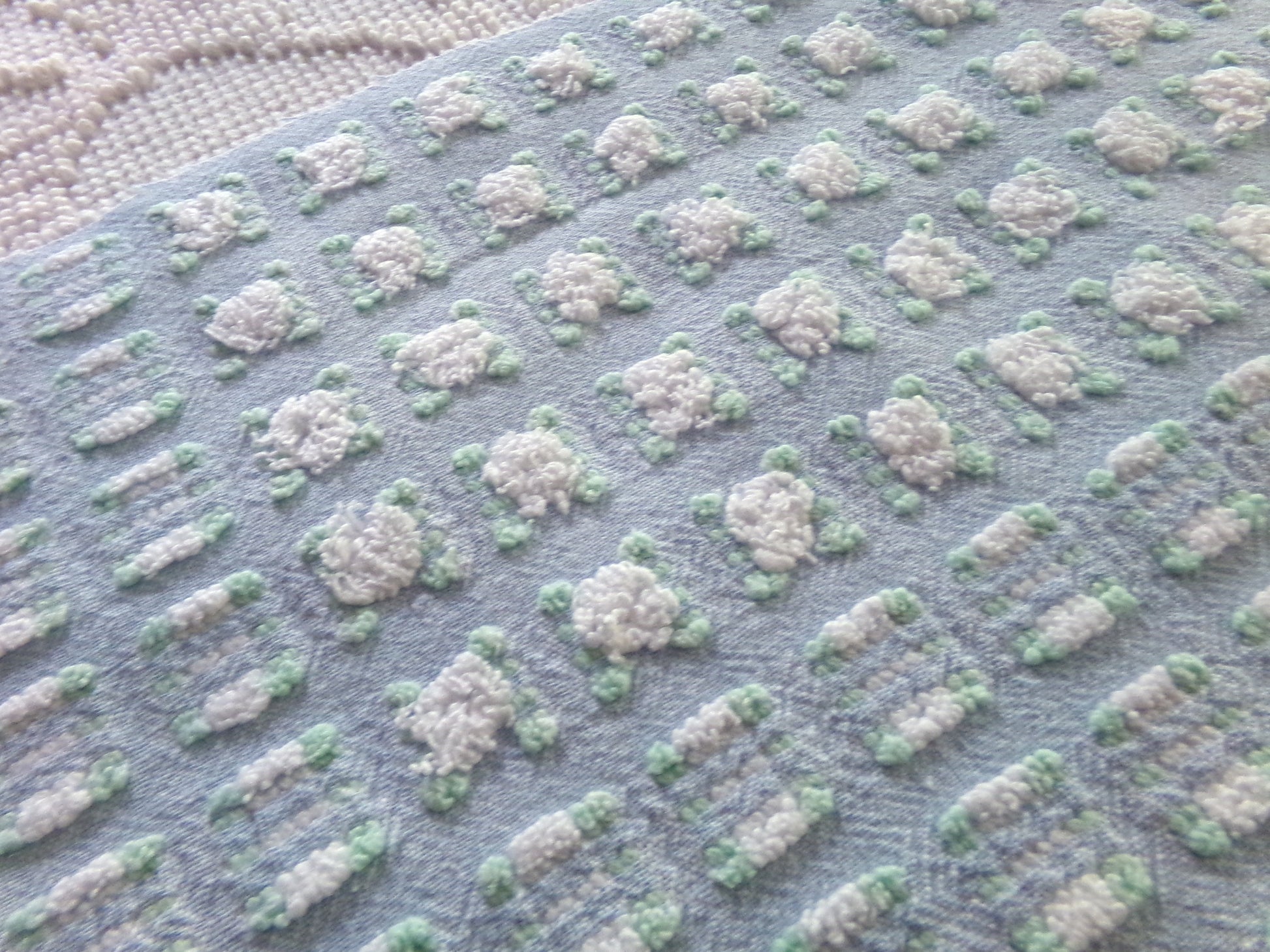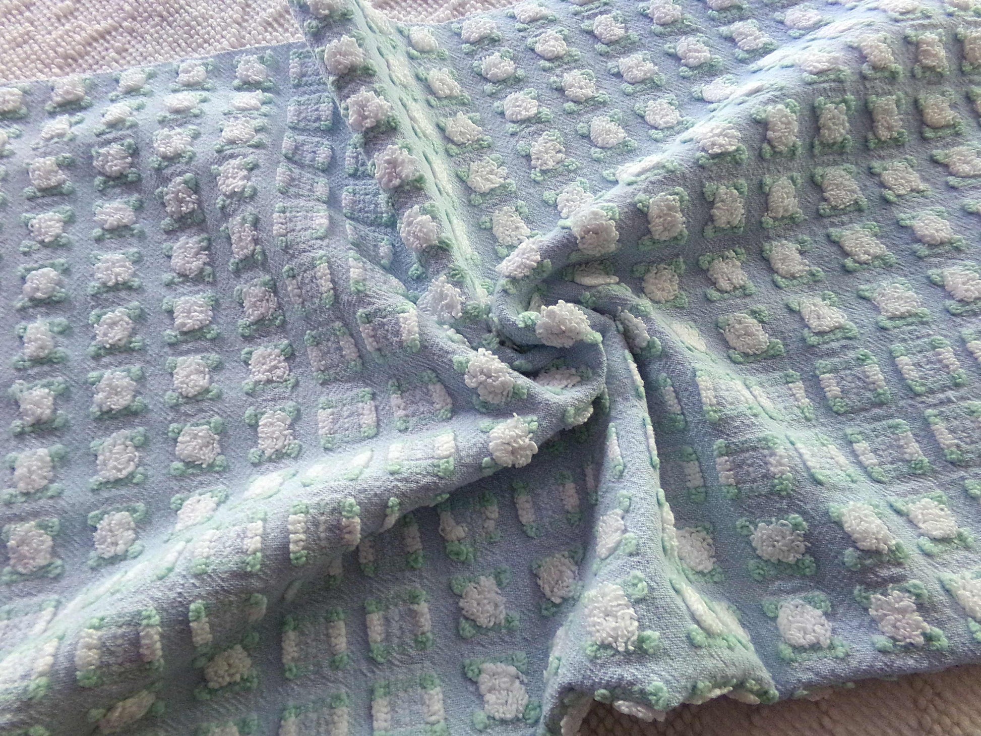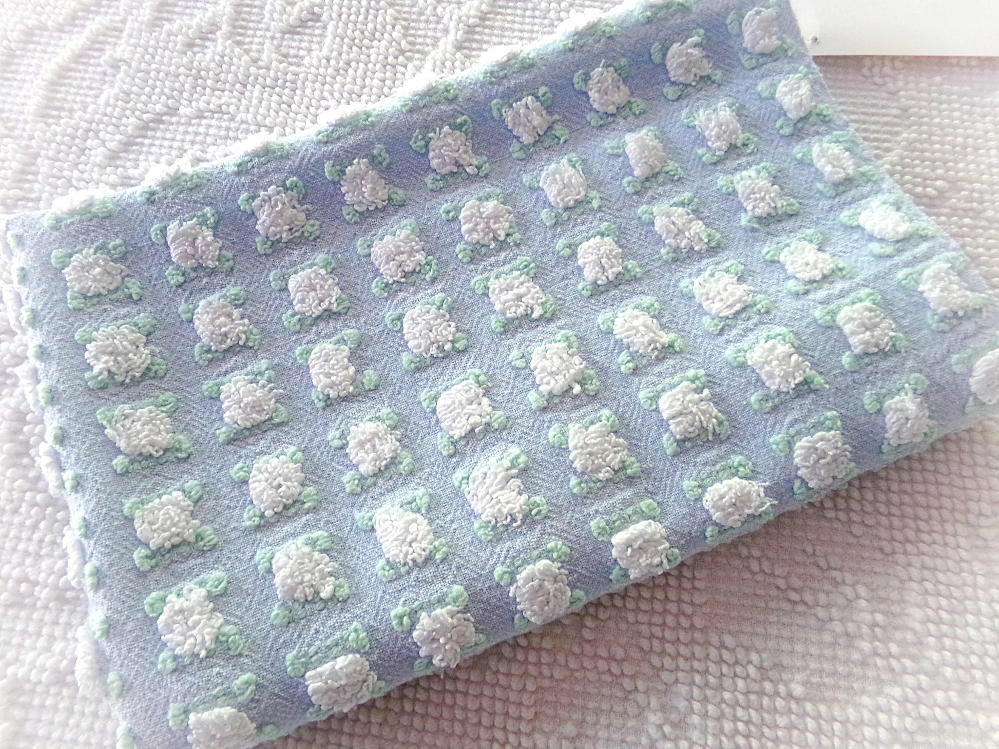 Looking for a fabric that exudes classic cottage style...with a unique twist? This rare vintage chenille fabric piece features a dreamy "phantom" blue & white rosebud pattern - a geometric latticework design alternating between plump white rosebuds and their counterparts, empty "ghosts" or "phantoms."Piece measures approx 18.5" x 24" inches. An original 1960s era Morgan Jones design. Soothing, serene colorway that adapts well to light.