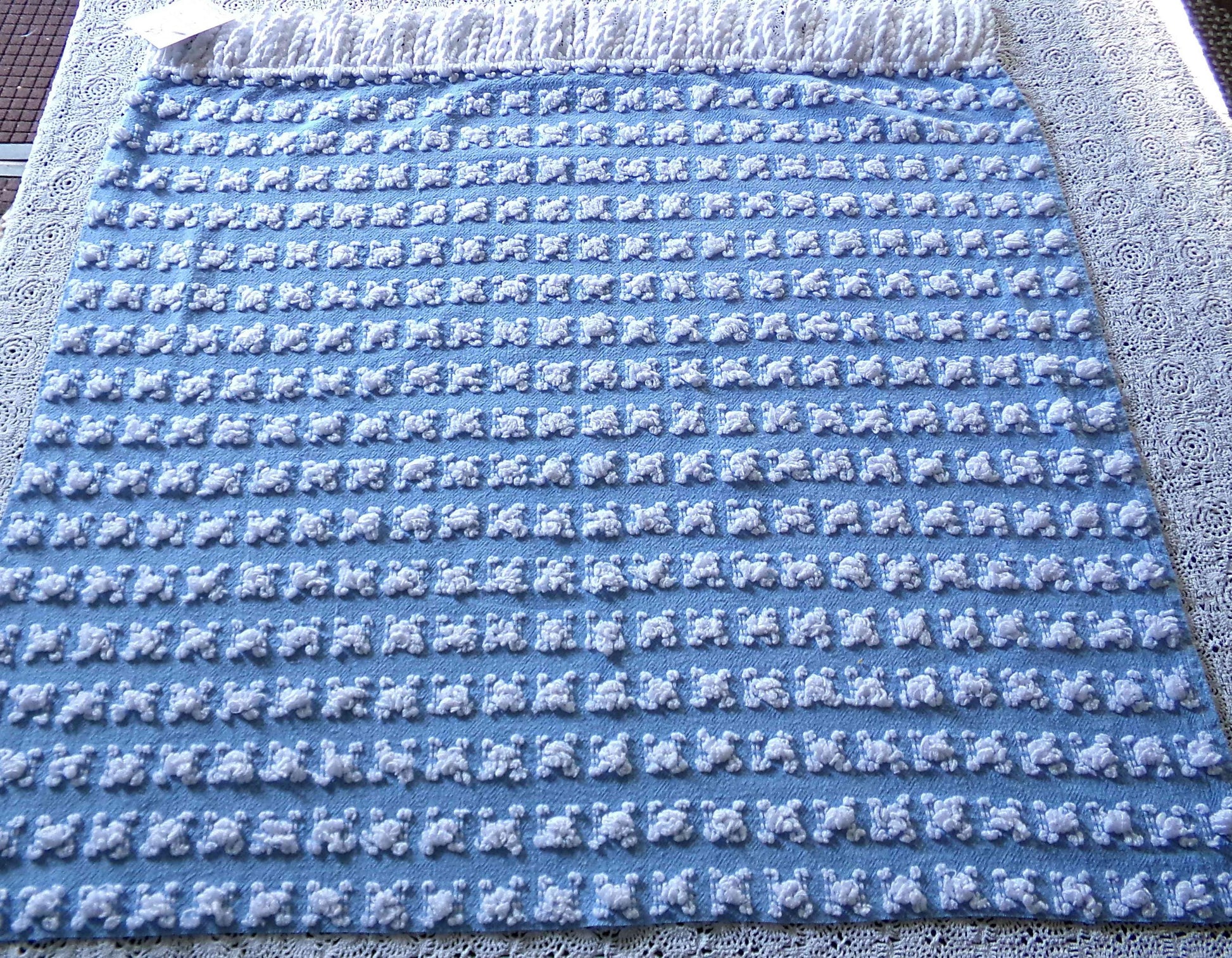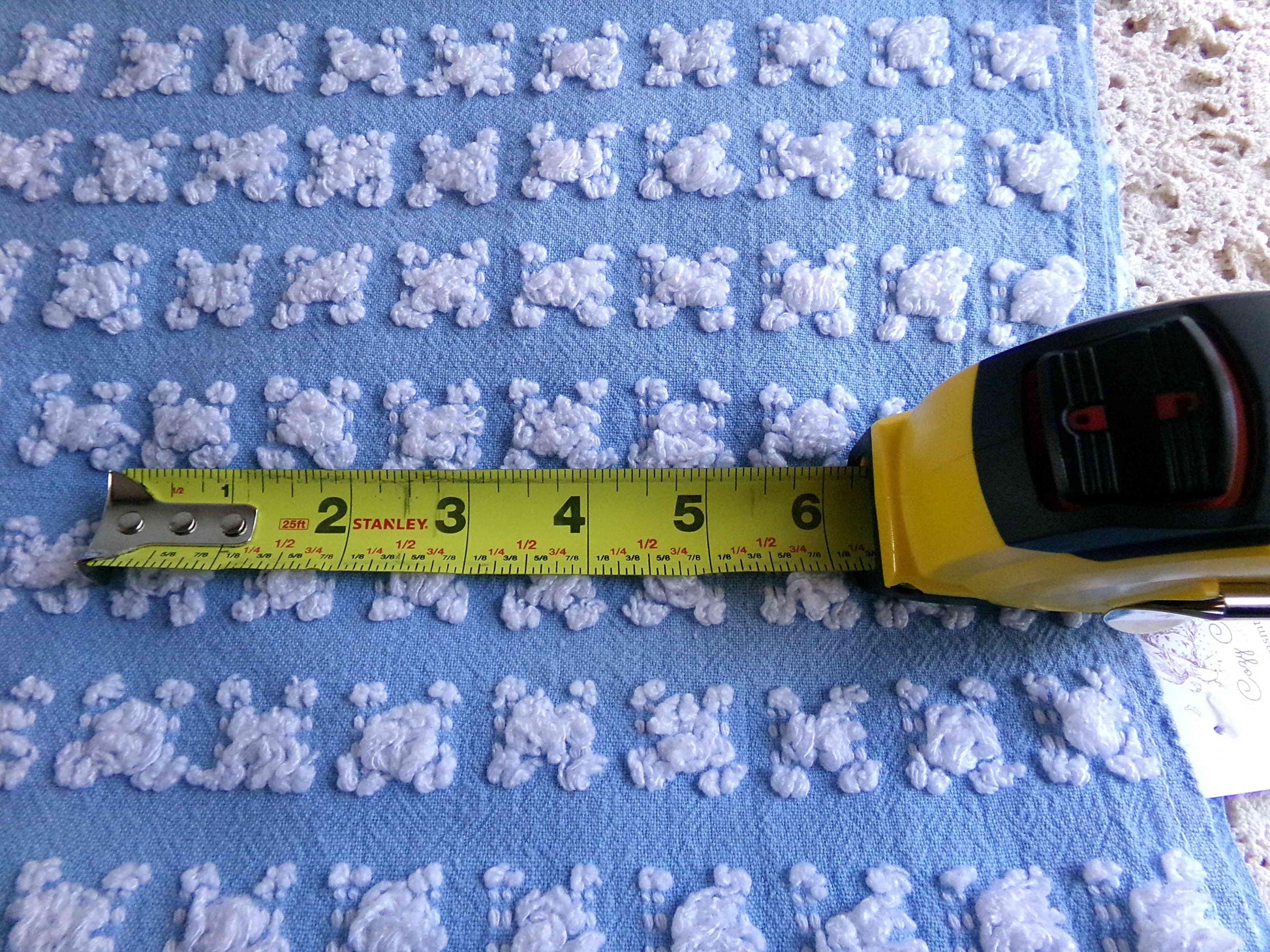 Beyond beautiful blue chenille fabric tufted with white rosebuds is perfect for those heirloom quality projects.If you love rosebuds and are looking for something a bit different from traditional Morgan Jones designs, you'll enjoy this material - the rosebuds have a nubbier texture with a looser formation versus the more common buds.