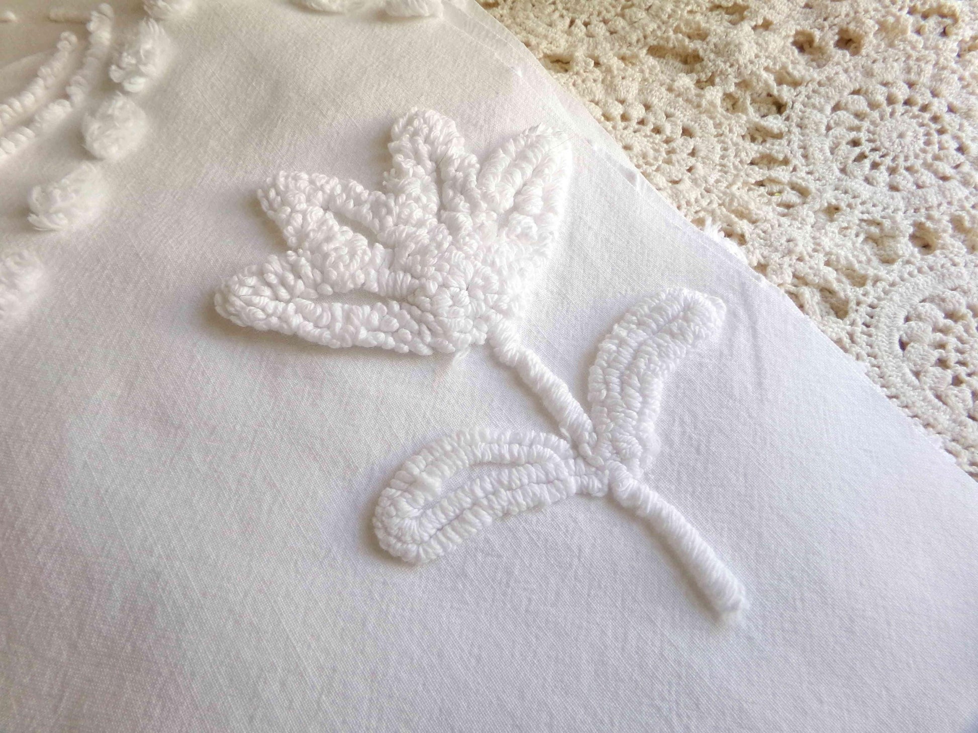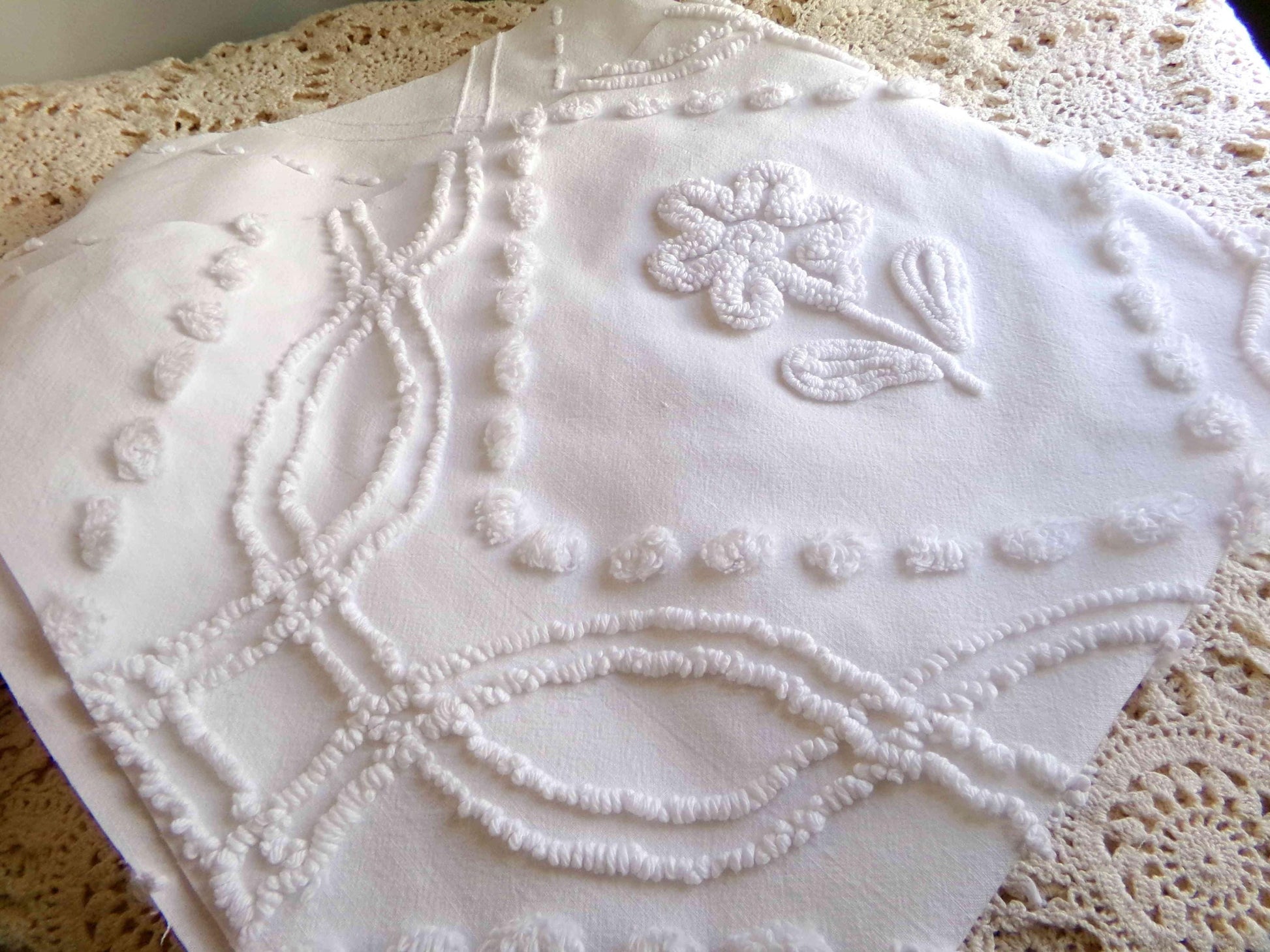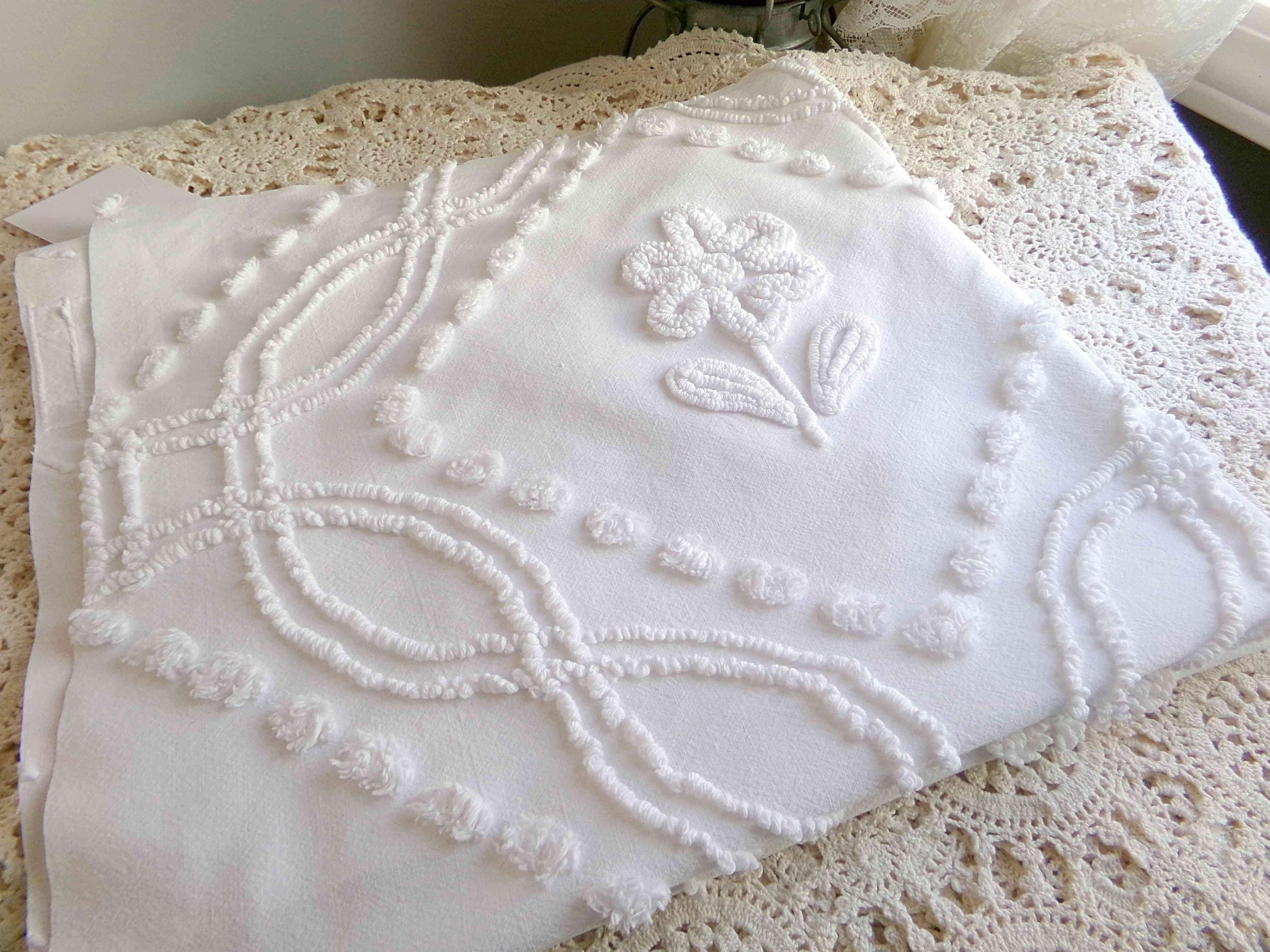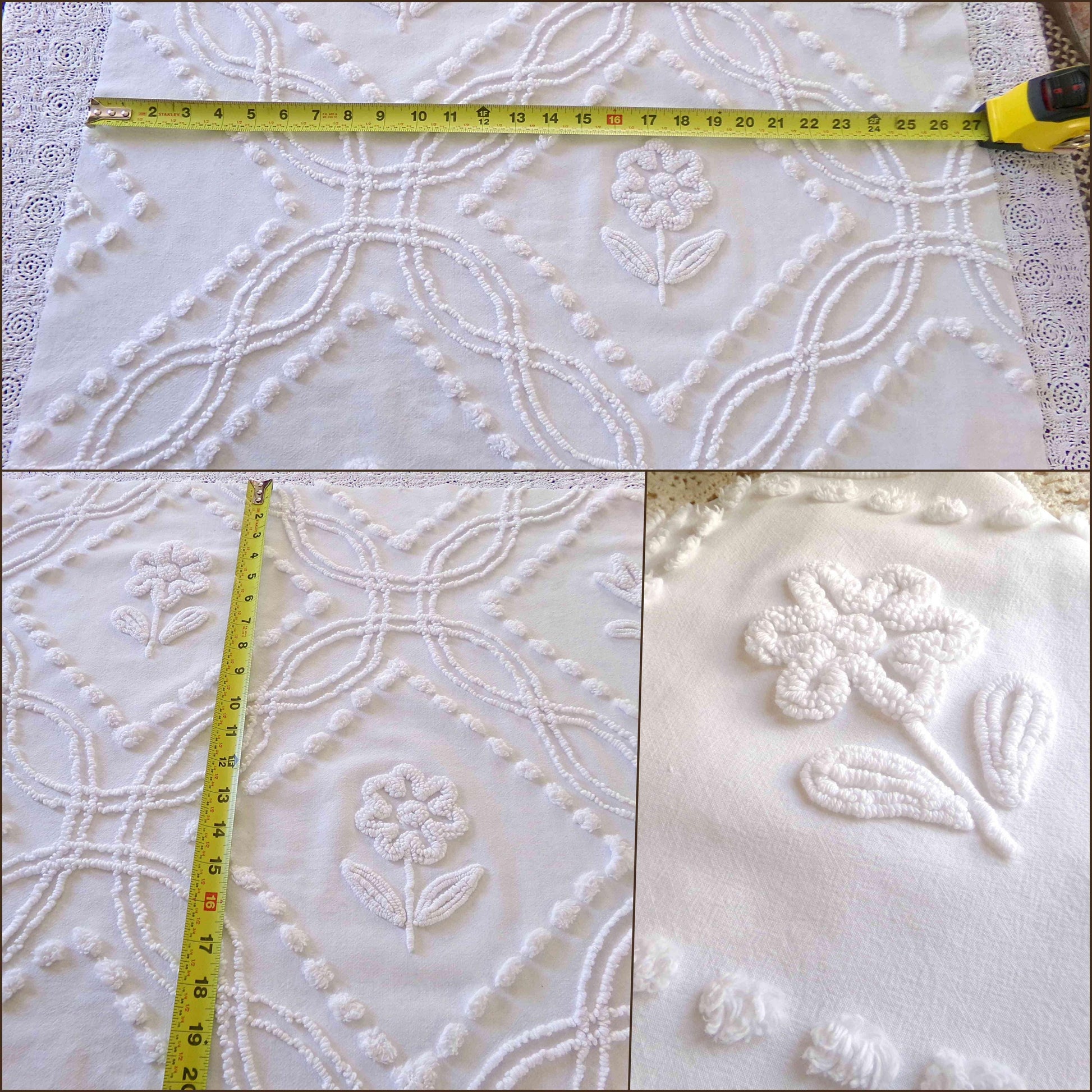 Endless creative possibilities with this very pretty piece of vintage fabric. It features a crisp white bkgd tufted with two daisy floral and one tulip motif, all of which are highlighted by wideset eternity links and puffy pops.This fabric is a popular choice for pillow covers because of its versatile white colorway and simple, classic cottage design.
