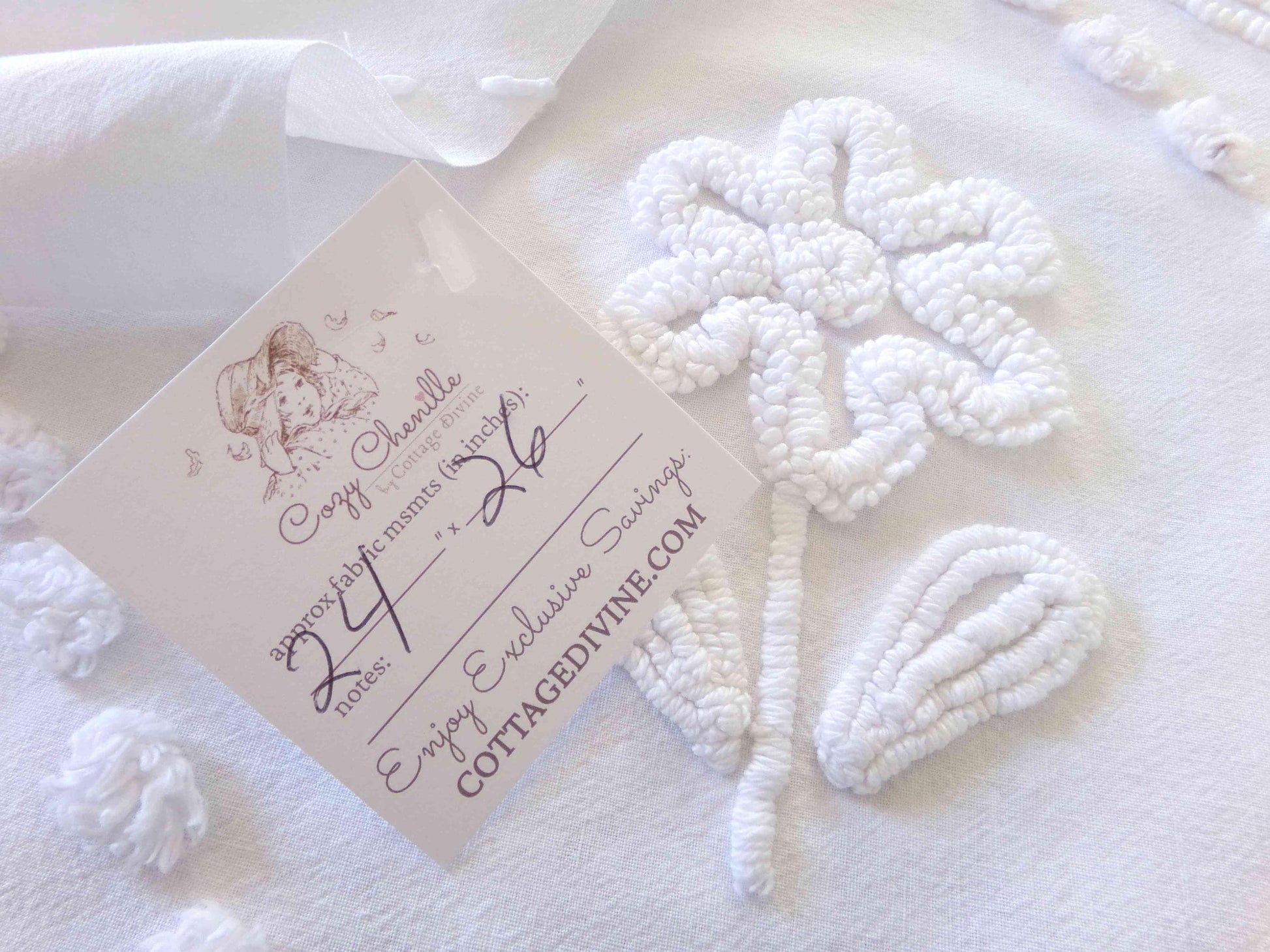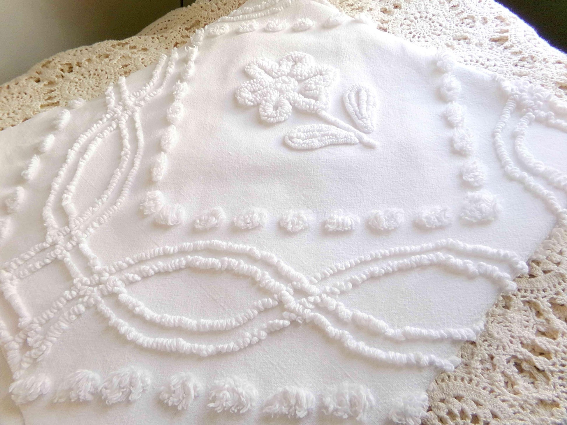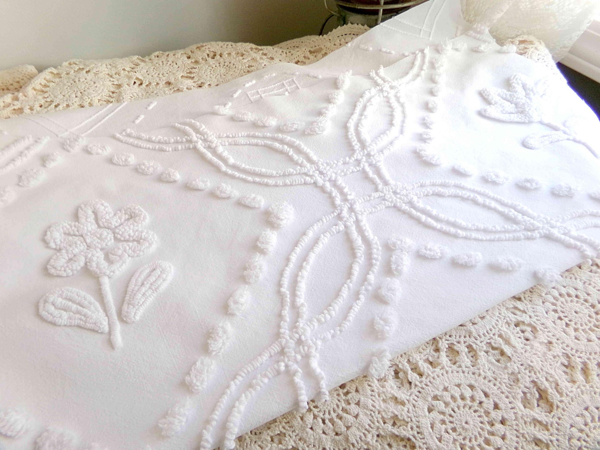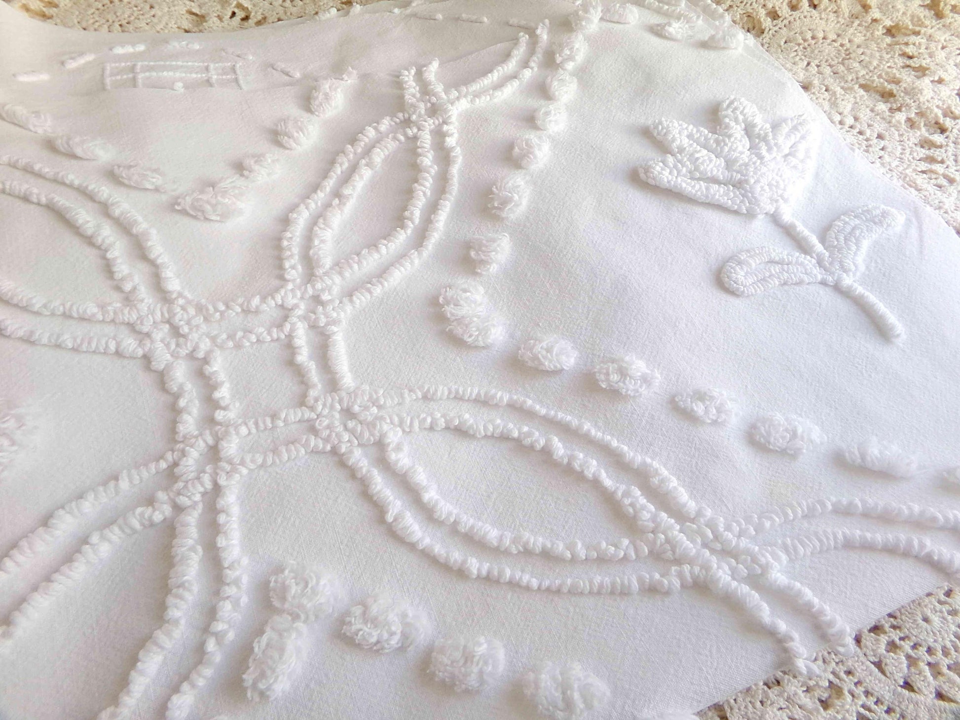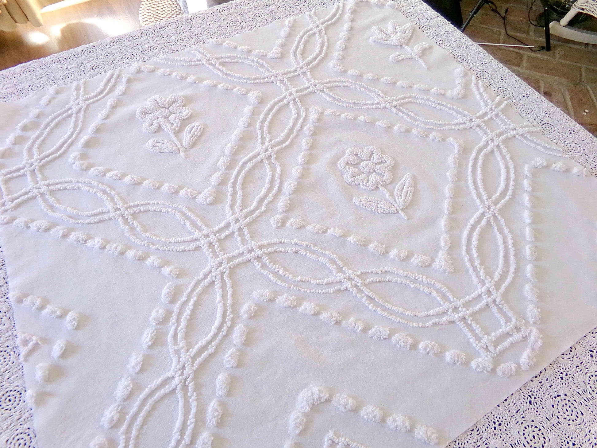 Endless creative possibilities with this very pretty piece of vintage fabric. It features a crisp white bkgd tufted with two daisy floral and one tulip motif, all of which are highlighted by wideset eternity links and puffy pops.This fabric is a popular choice for pillow covers because of its versatile white colorway and simple, classic cottage design.