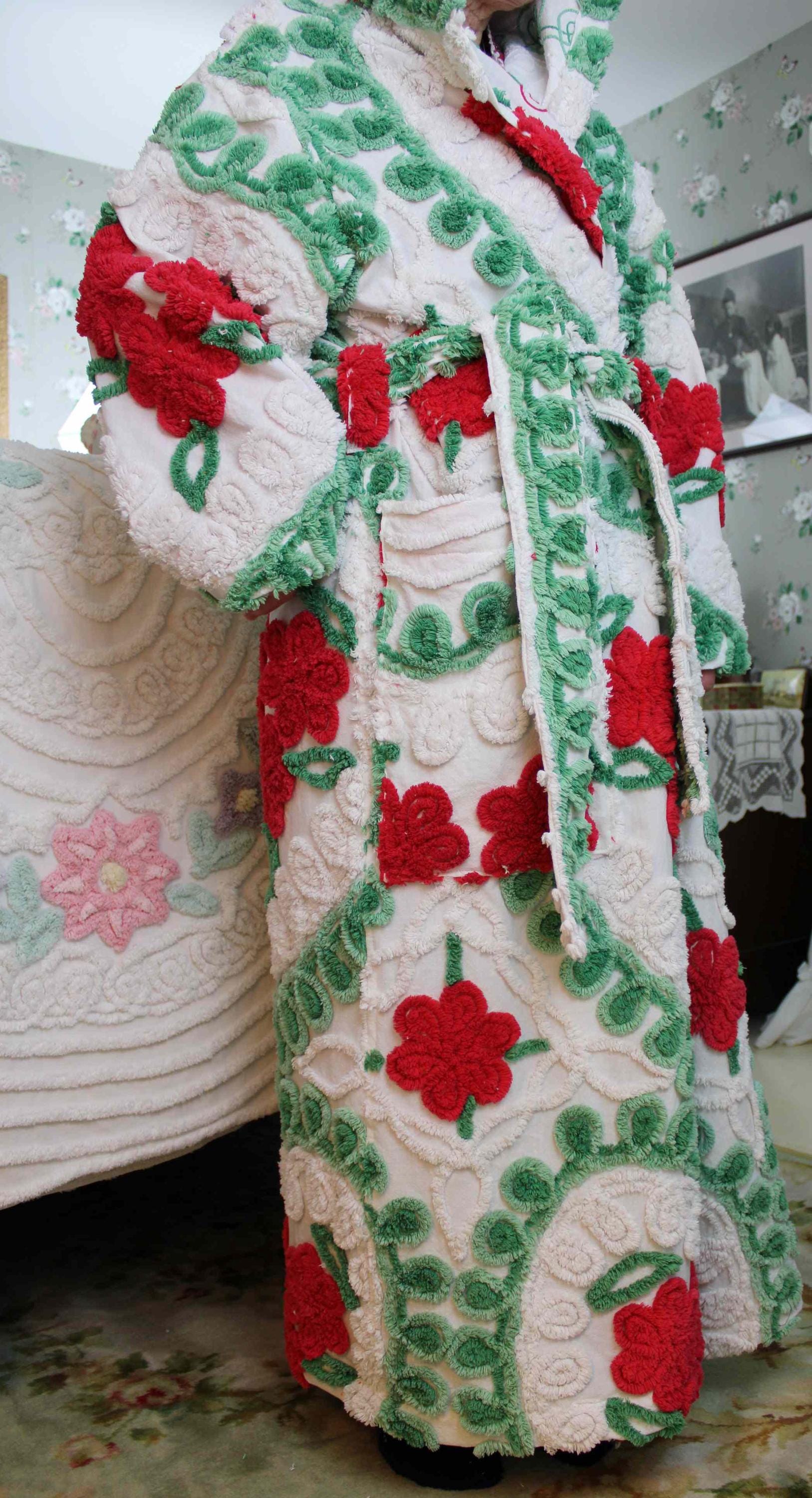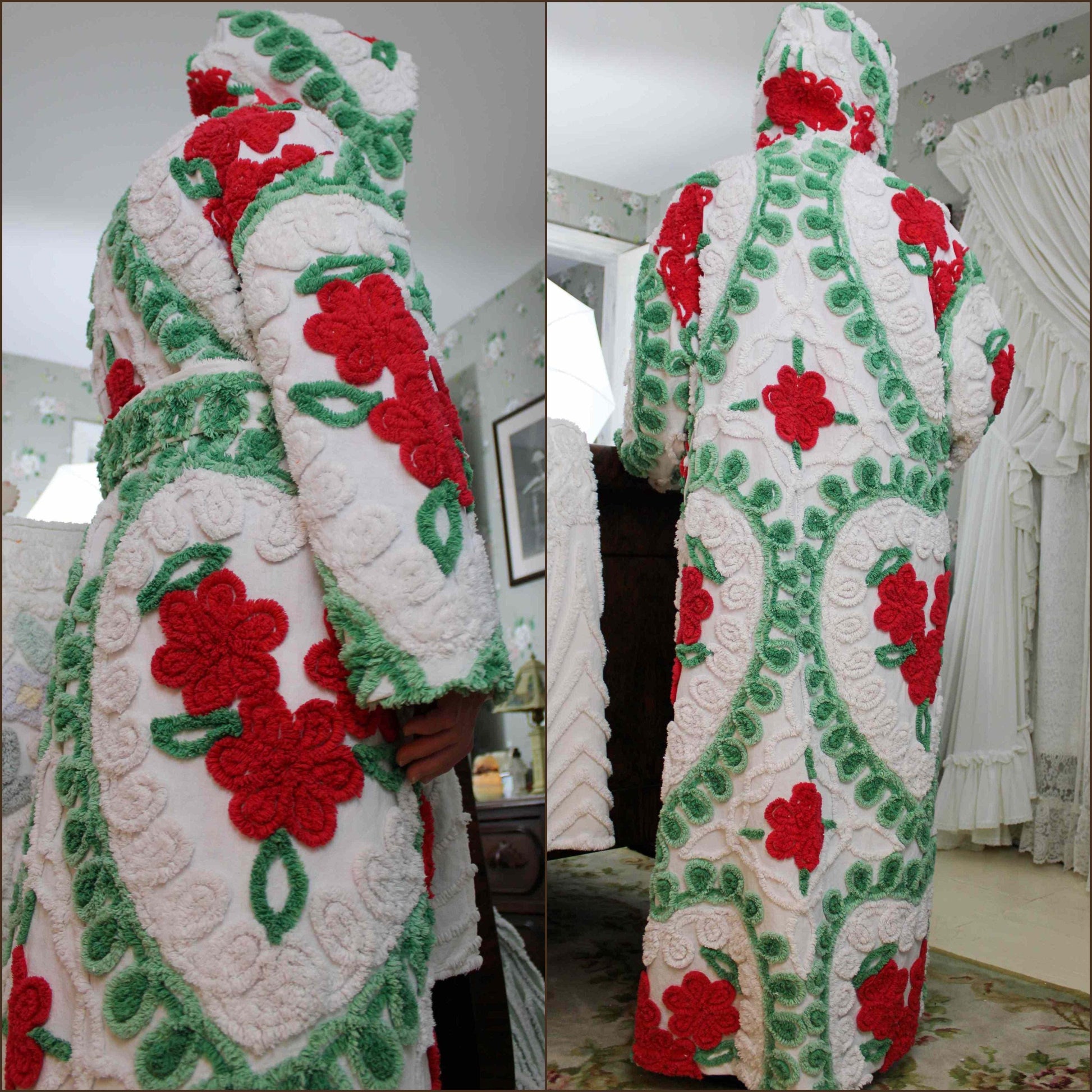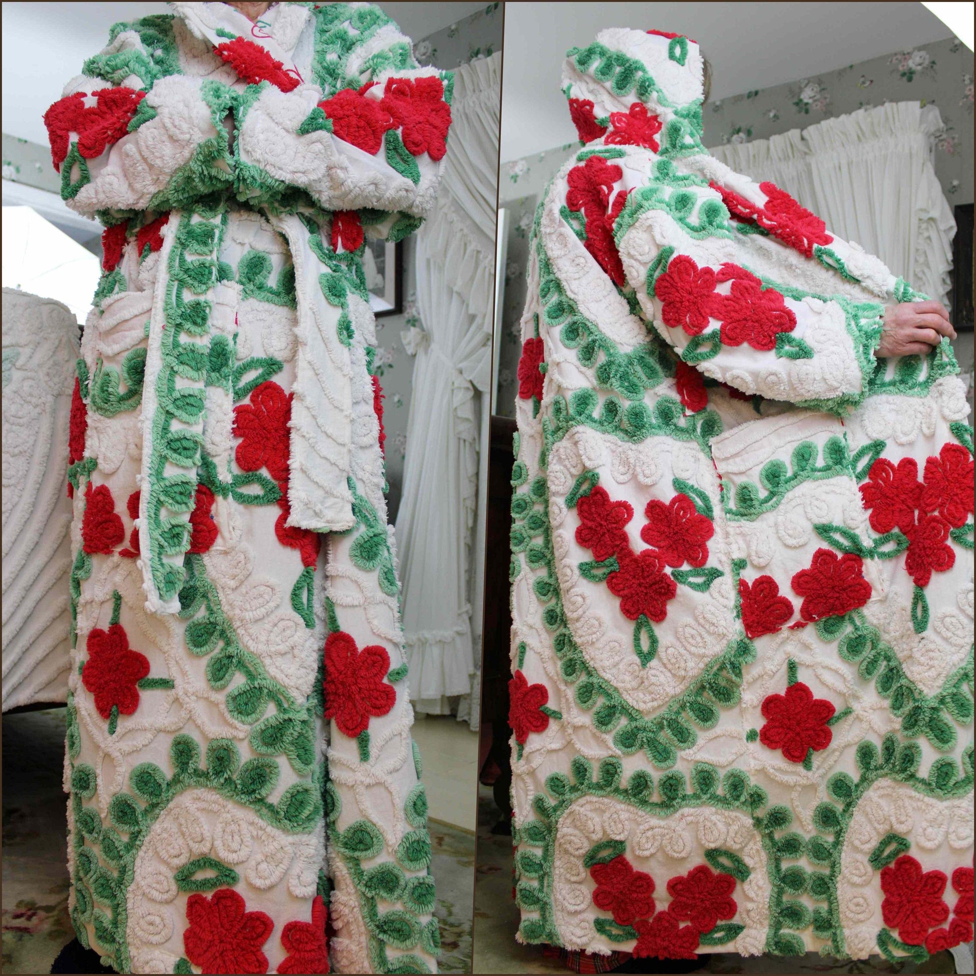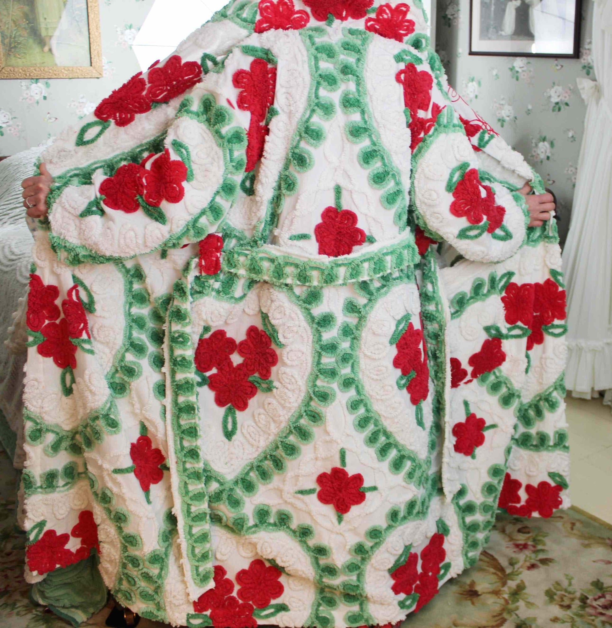 What a treasure...Rare & gorgeous upcycled chenille robe featuring big green hearts that wrap around trios of red roses on a snowy white background.The darling bedspread this bathrobe was designed from (see before/after final img) was in near mint condition, with only a few light age marks from having been stored for more than 5 decades. I have never had another in this stunning colorway and pattern.