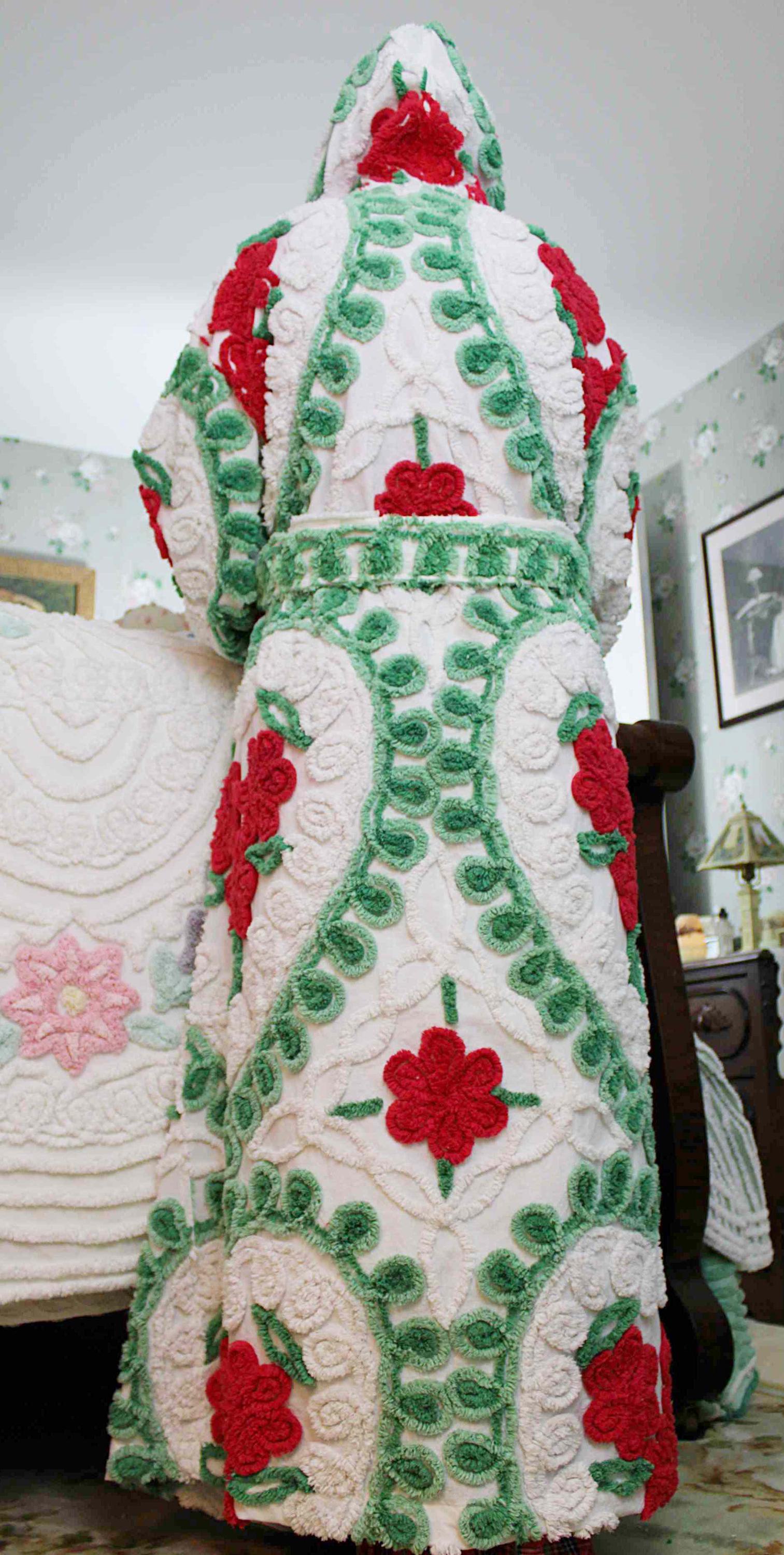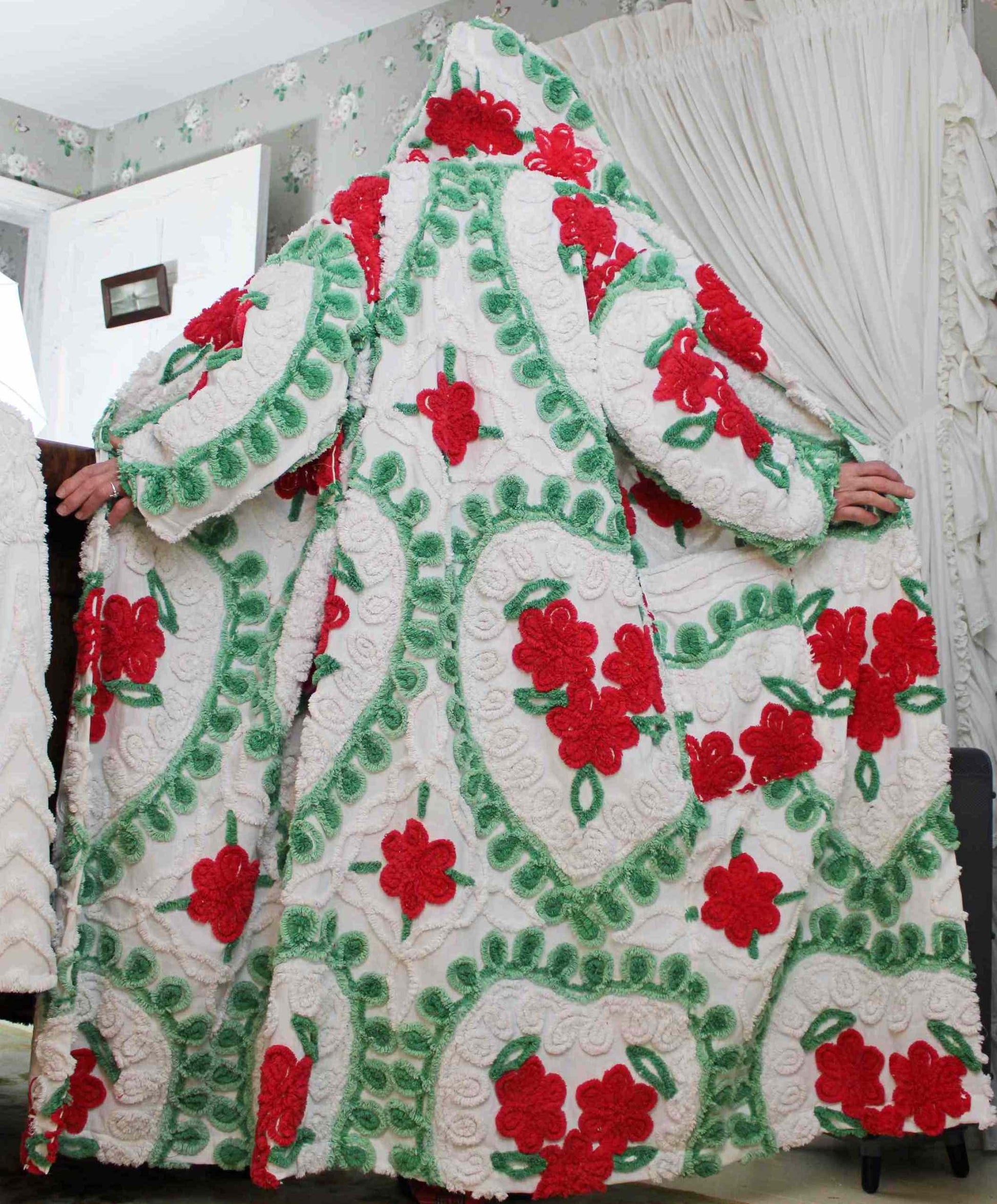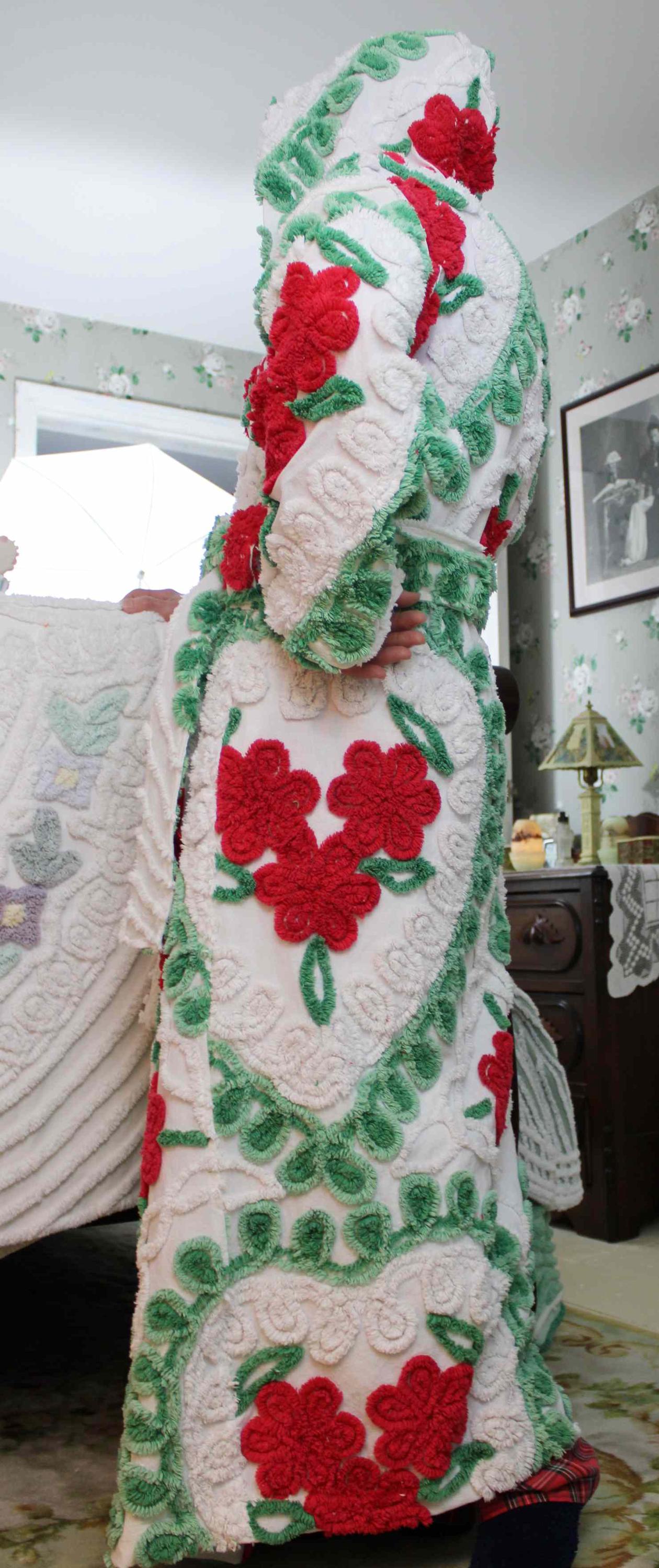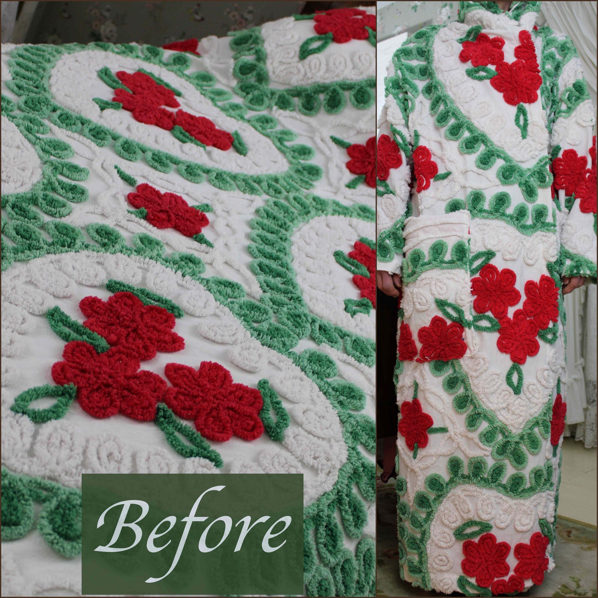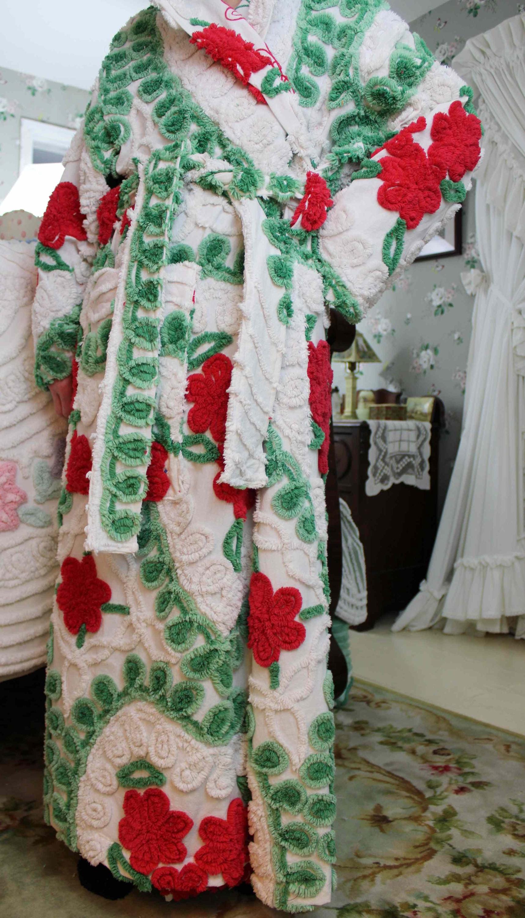 What a treasure...Rare & gorgeous upcycled chenille robe featuring big green hearts that wrap around trios of red roses on a snowy white background.The darling bedspread this bathrobe was designed from (see before/after final img) was in near mint condition, with only a few light age marks from having been stored for more than 5 decades. I have never had another in this stunning colorway and pattern.