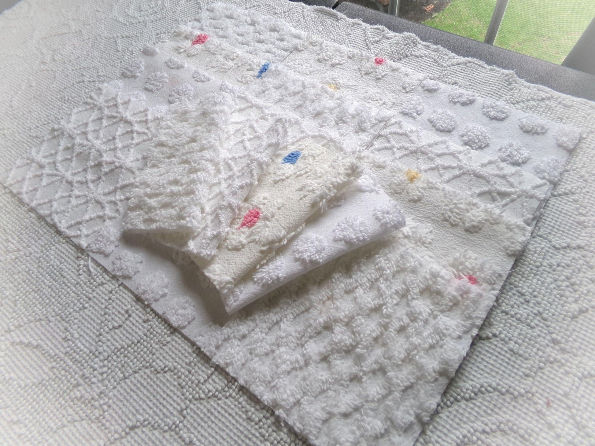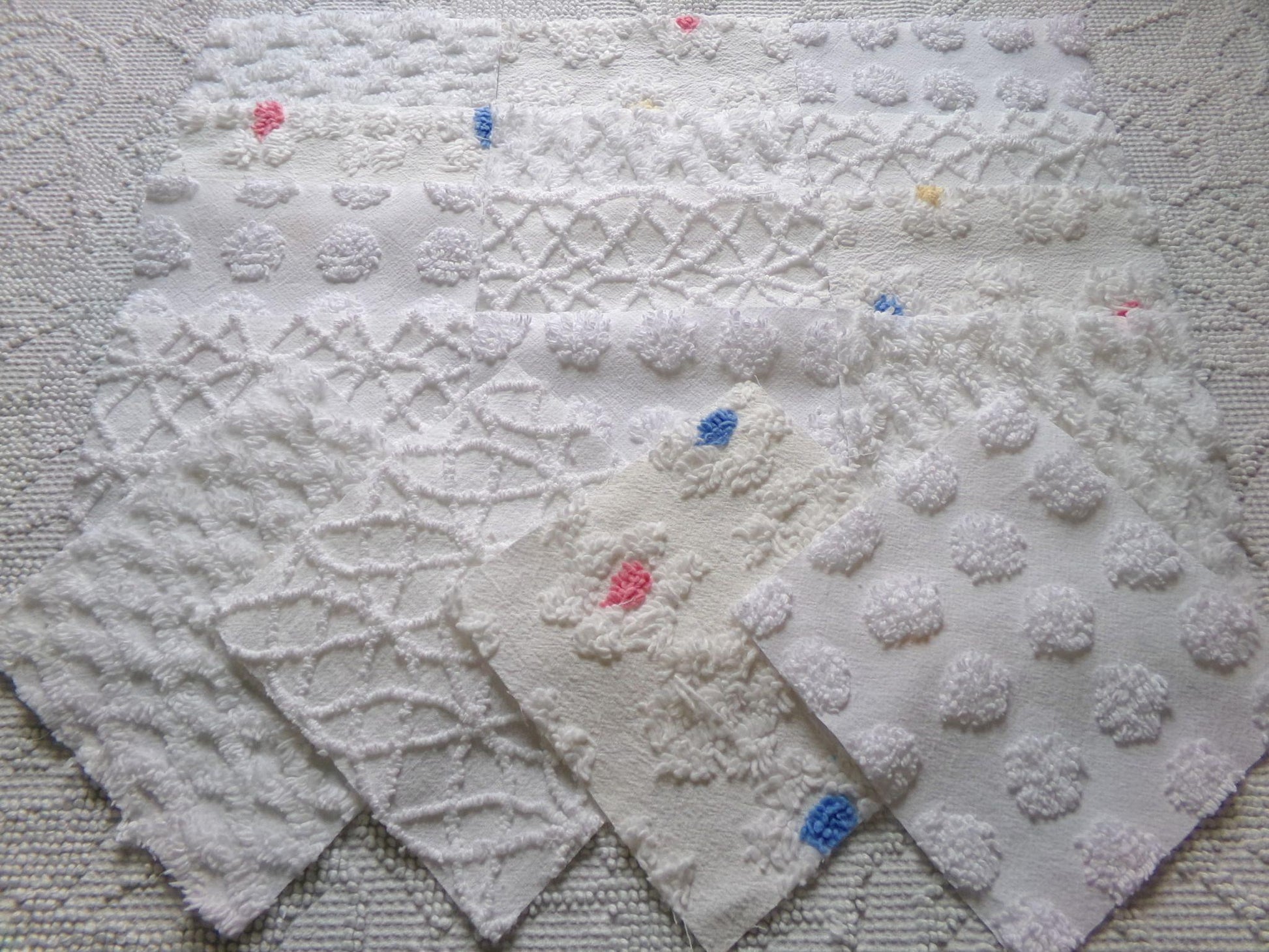 *Winter Whimsy* Inspire or enhance your next quilt or craft project with this cute set of vintage chenille fabric squares in shades of white.You'll receive 4 each of the following patterns: coin pop, diamond lattice, white spider webs & daisy flowers with random color centers.