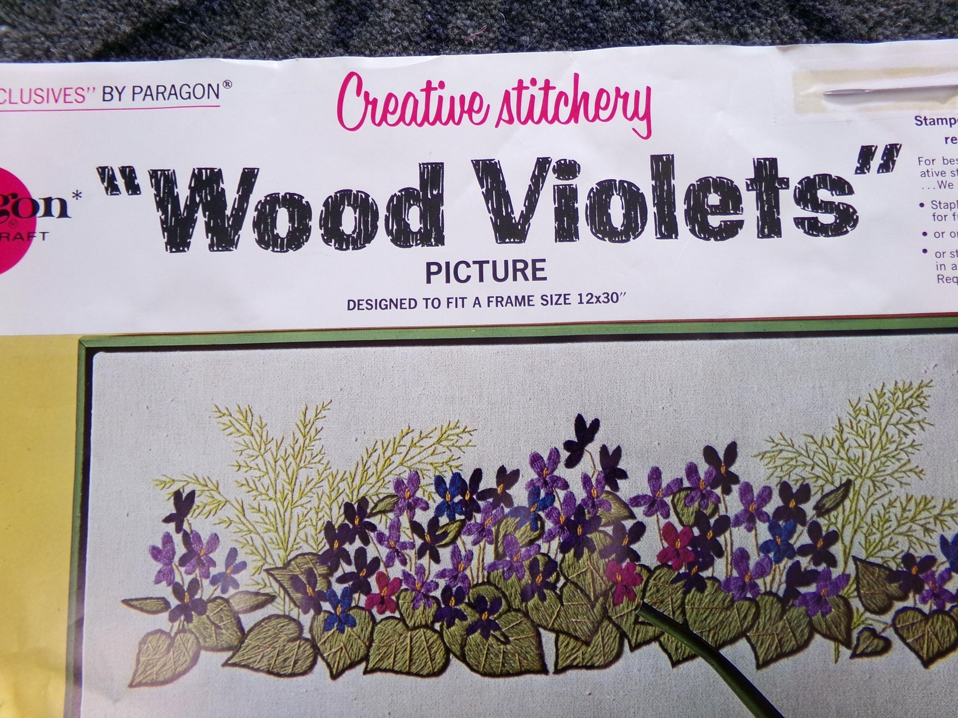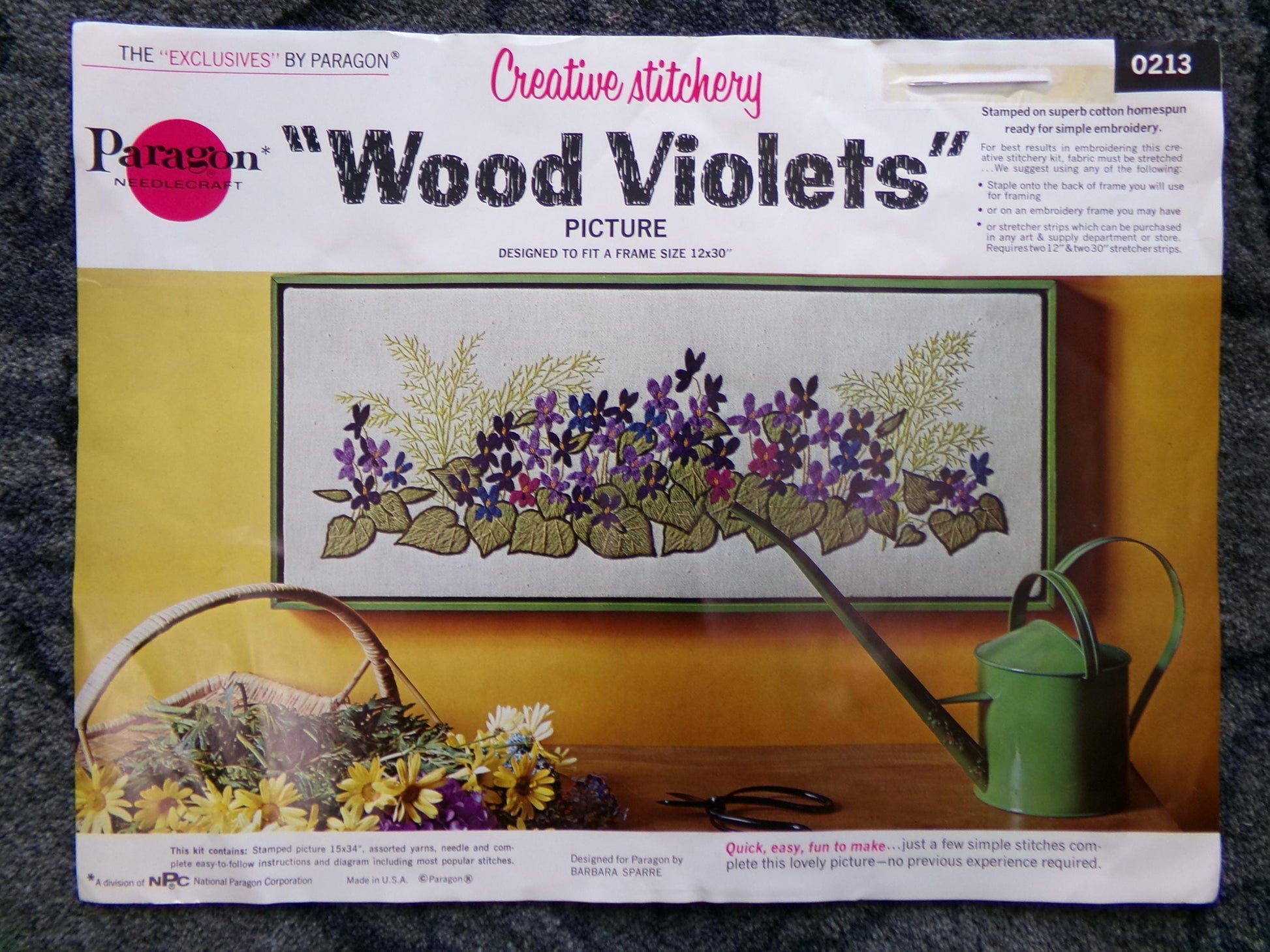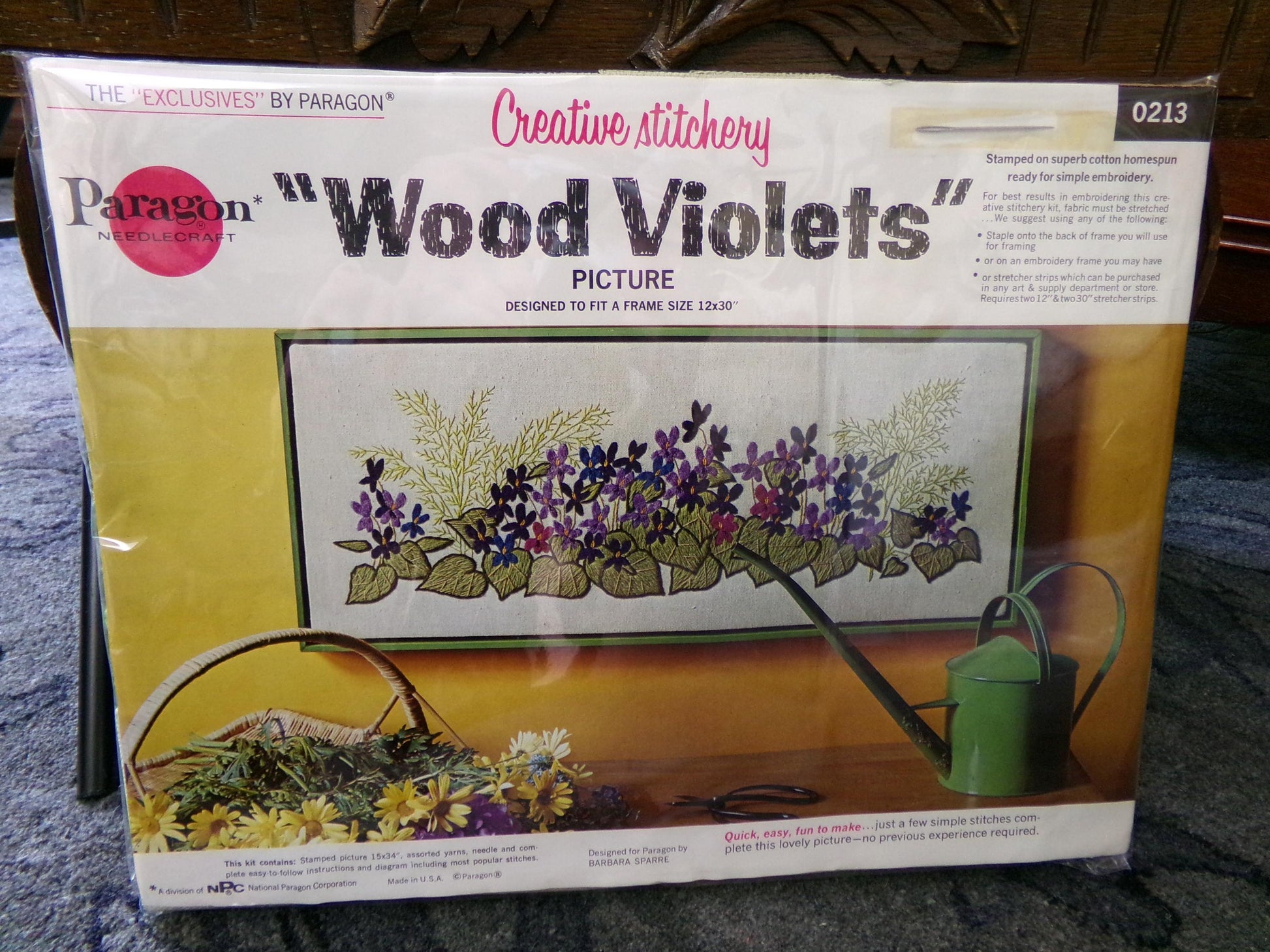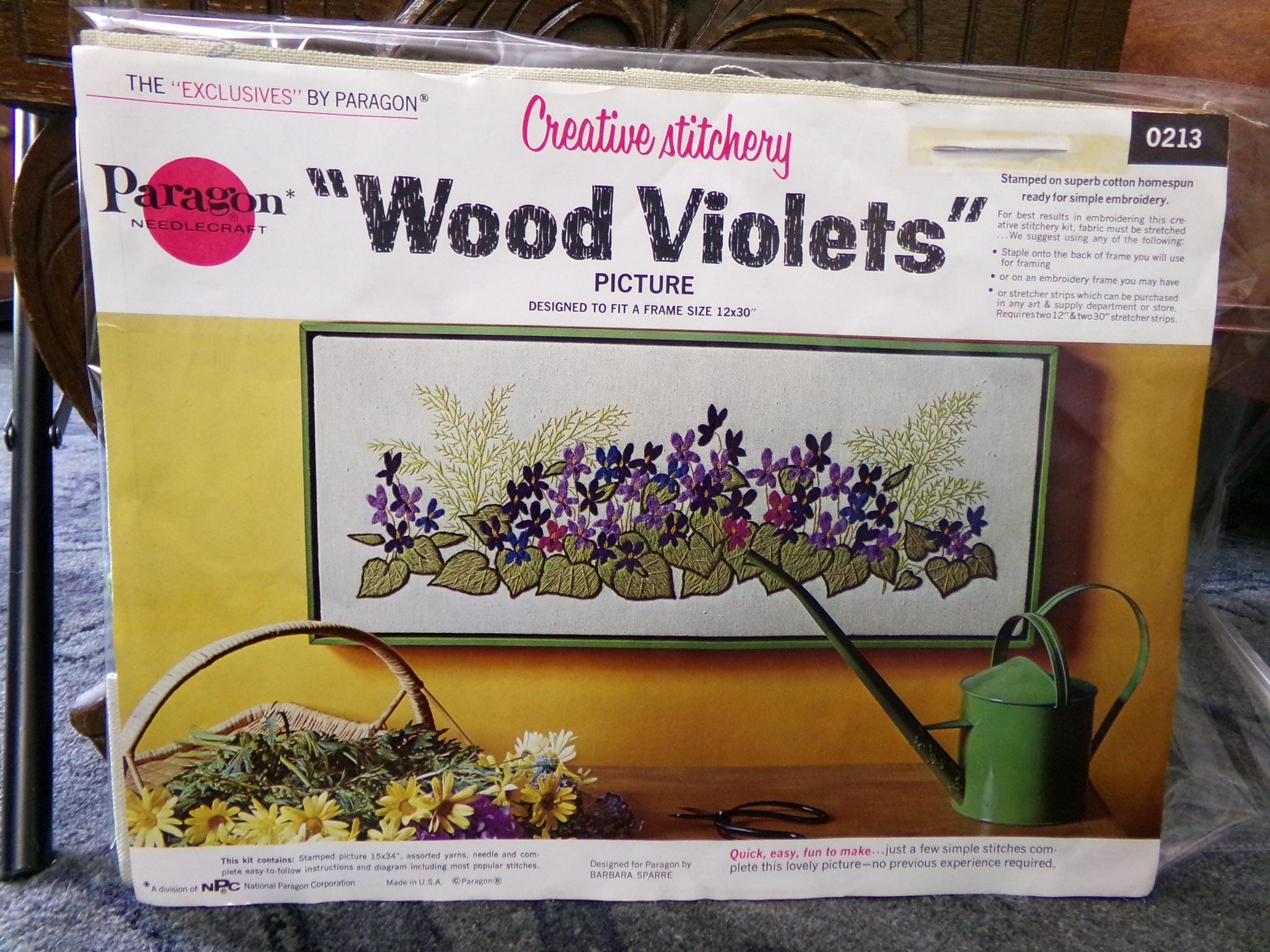 see more: cottagedivine.comWood Violets...Bring a touch of hippie era whimsy to your room with this woodsy vintage crewel embroidery kit, by Paragon Needlecraft #0213. Design by Barbara Sparre. Fits 12" x 30" inch frame when complete (not included).