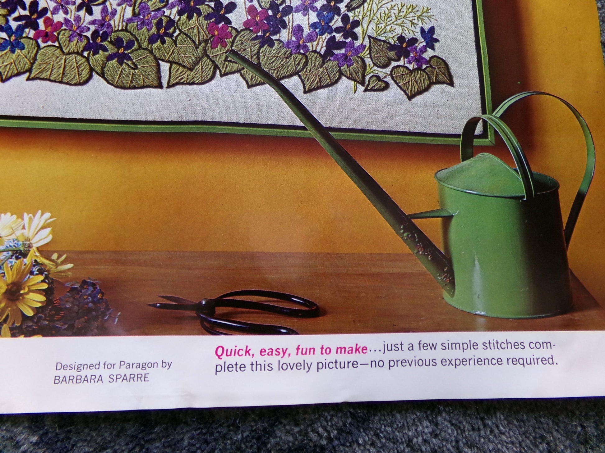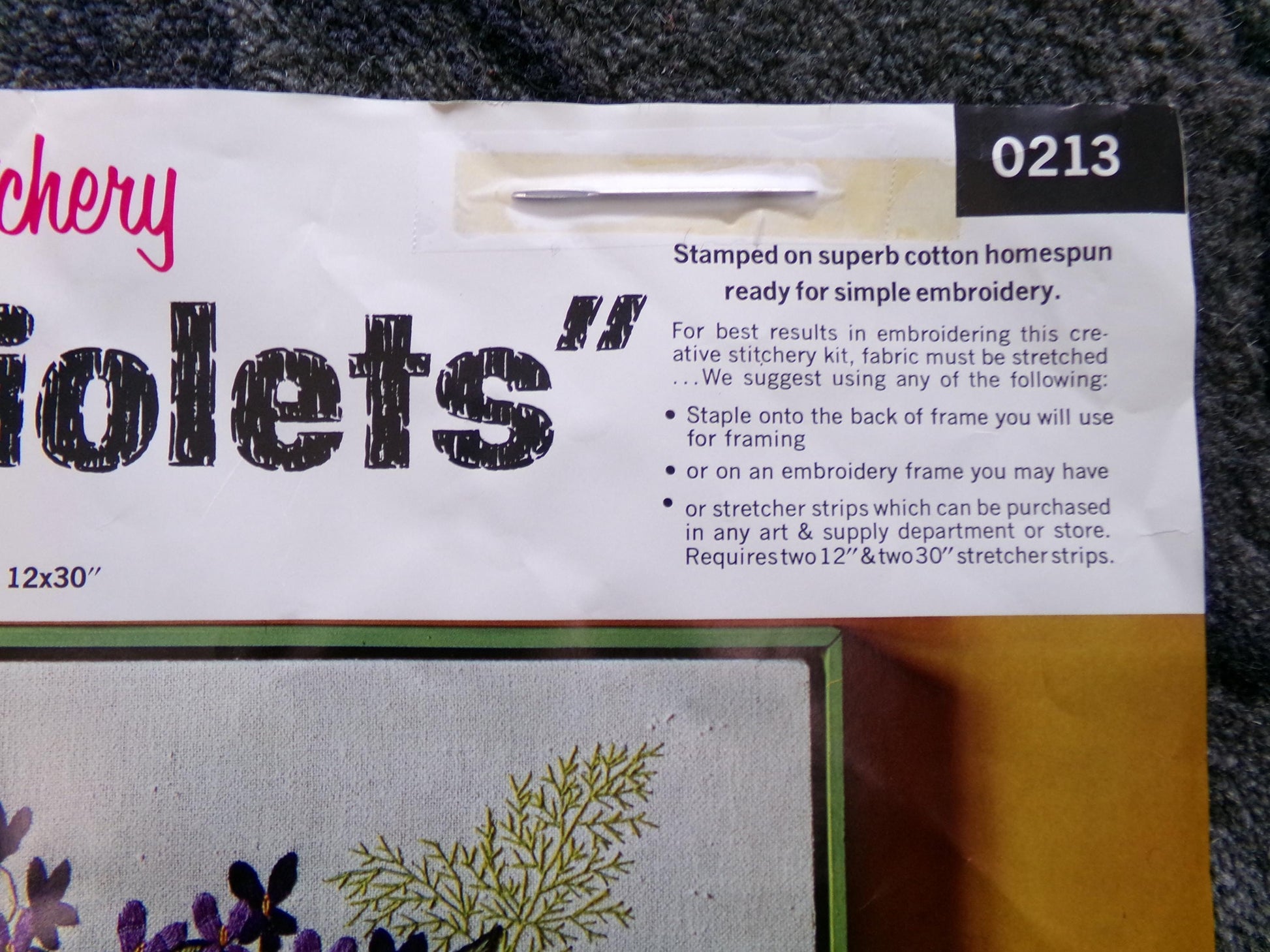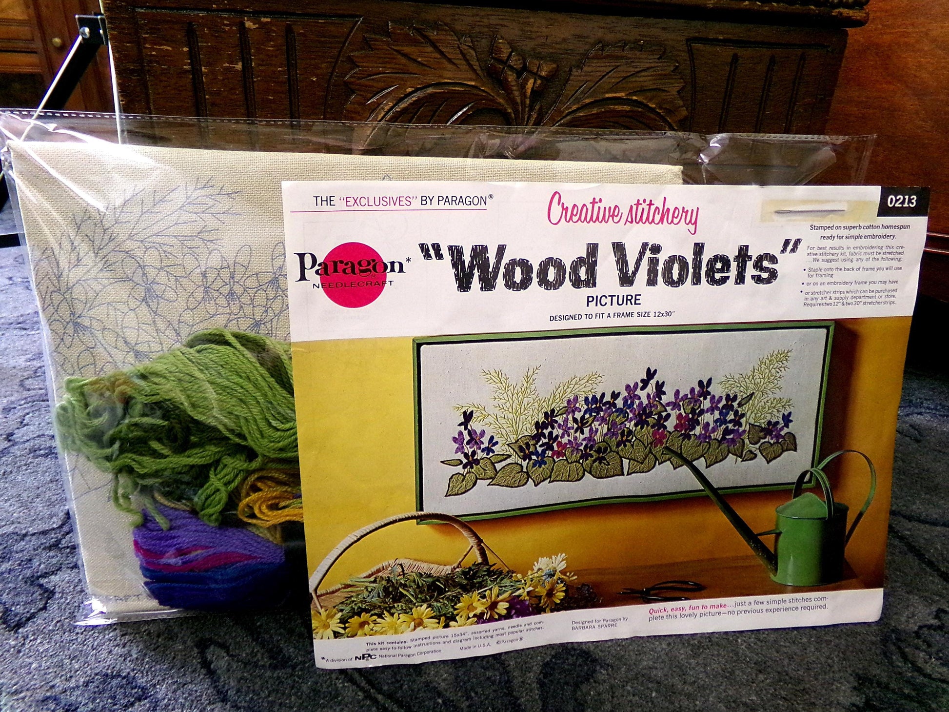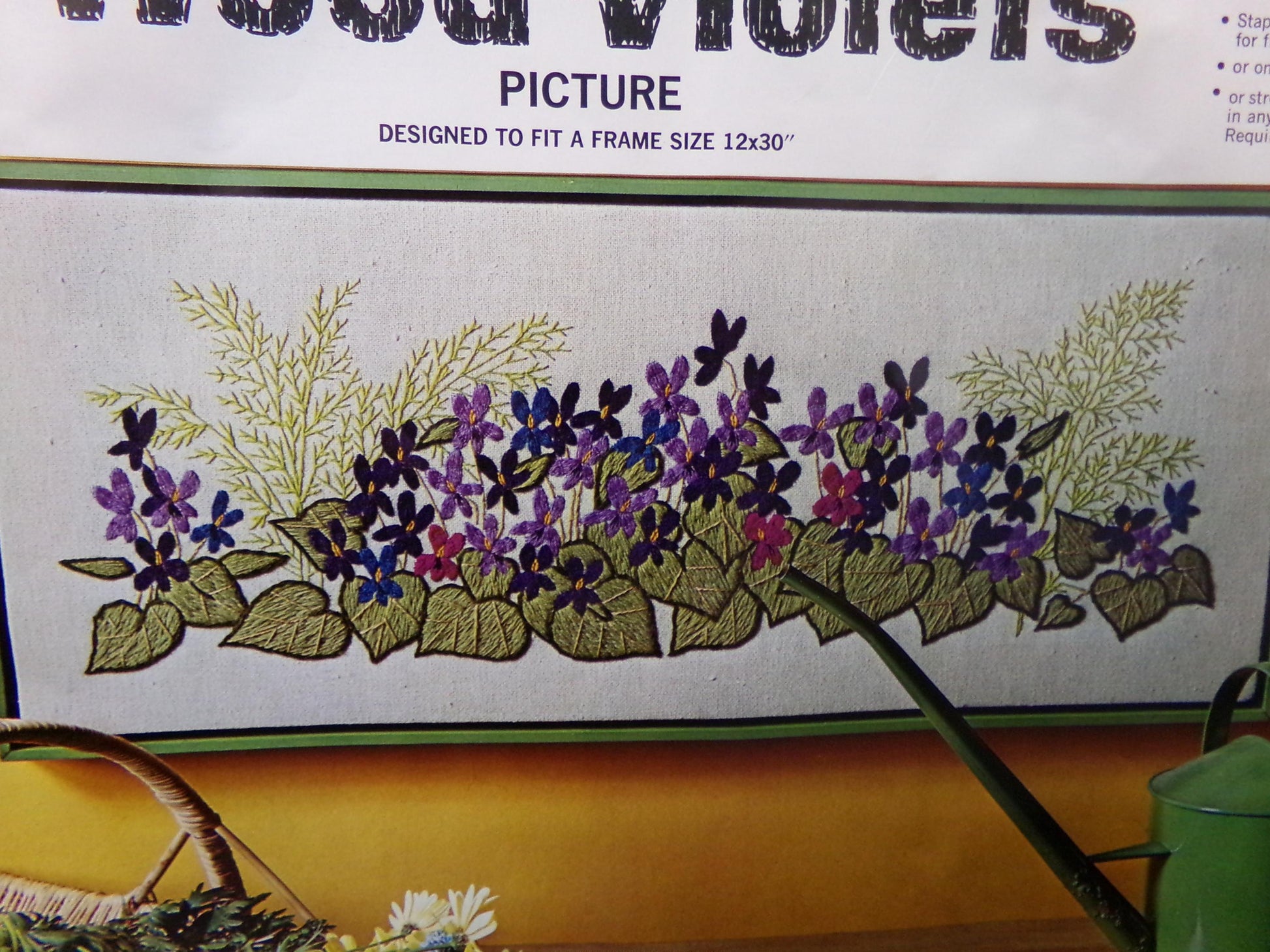 see more: cottagedivine.comWood Violets...Bring a touch of hippie era whimsy to your room with this woodsy vintage crewel embroidery kit, by Paragon Needlecraft #0213. Design by Barbara Sparre. Fits 12" x 30" inch frame when complete (not included).
