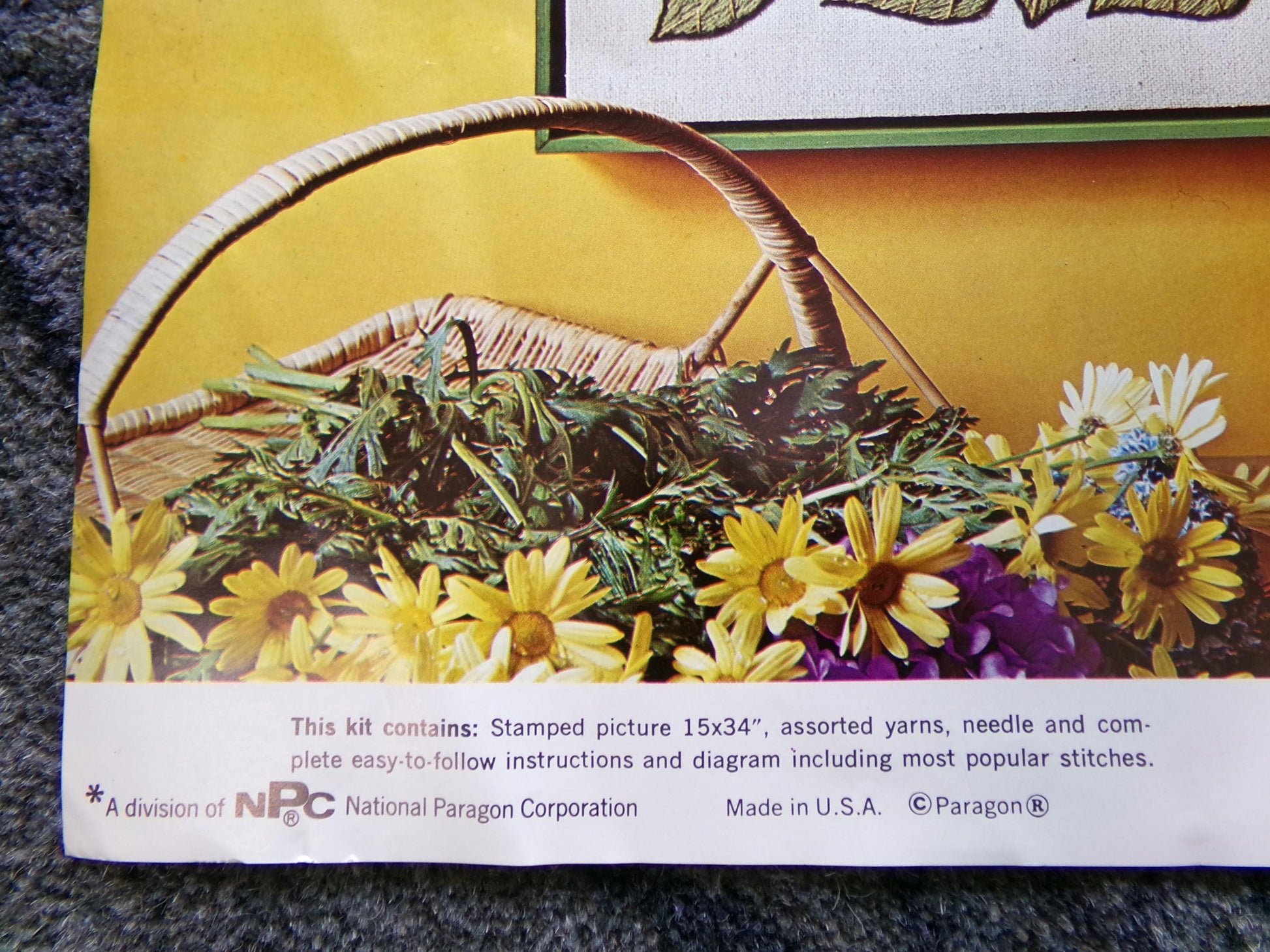 Includes all items as shown: stamped canvas, colored yarn, needle, and instructions for completion. Has been repackaged from original packaging; rear of canvas has some old tape residue which would not impact finished piece when framed.