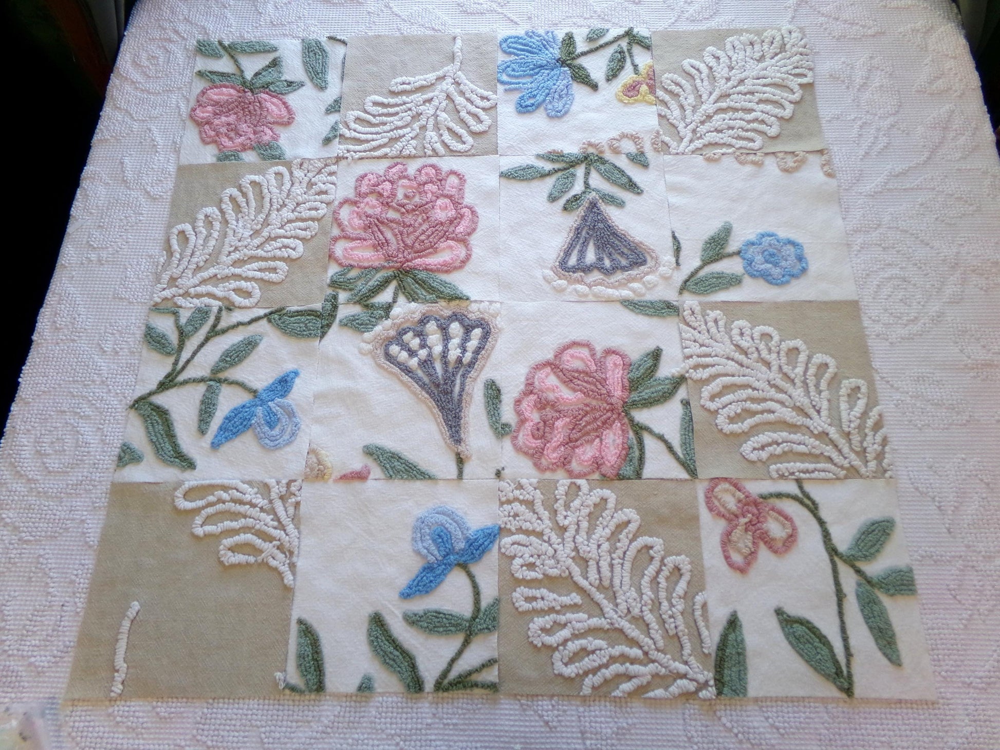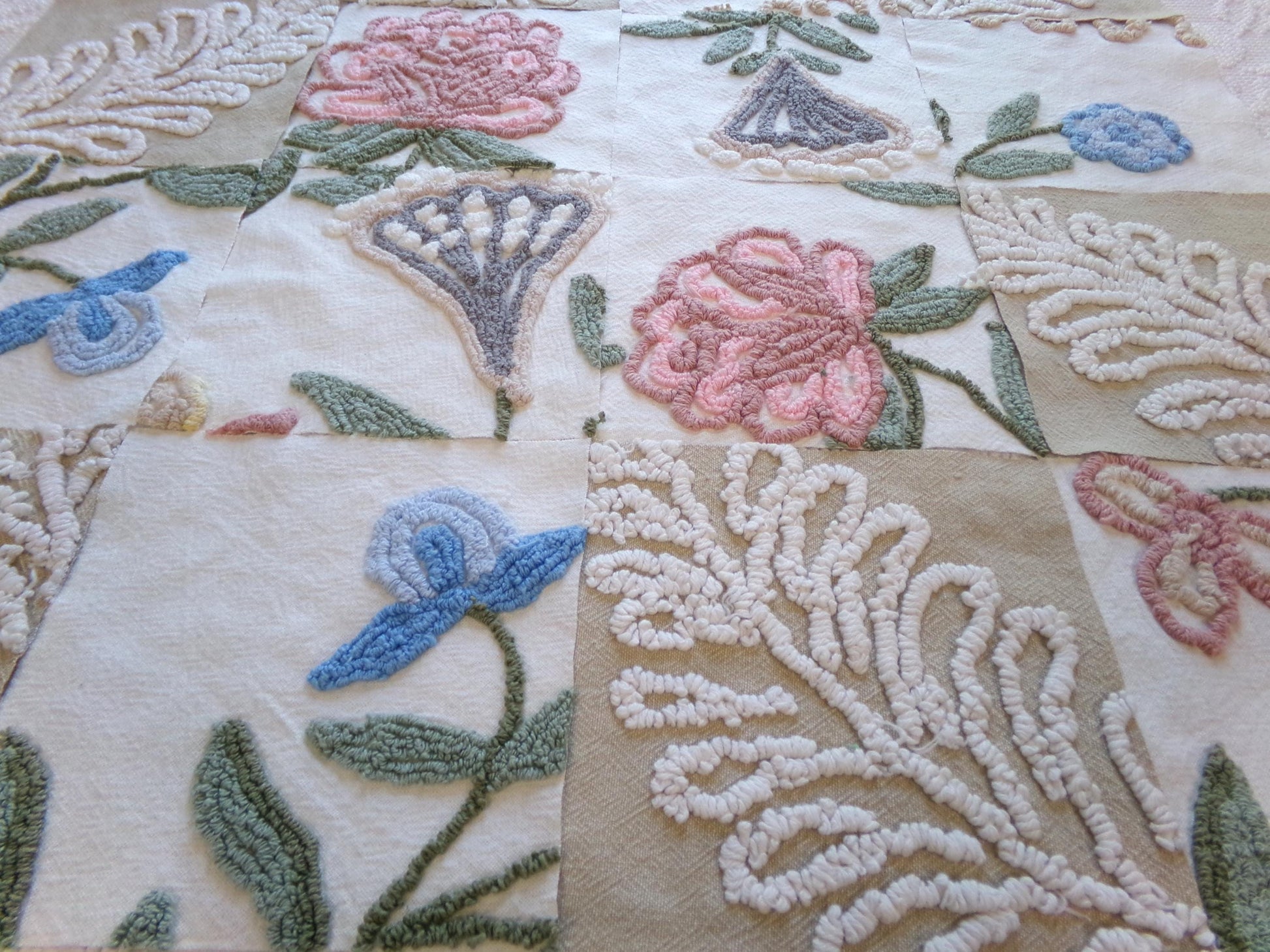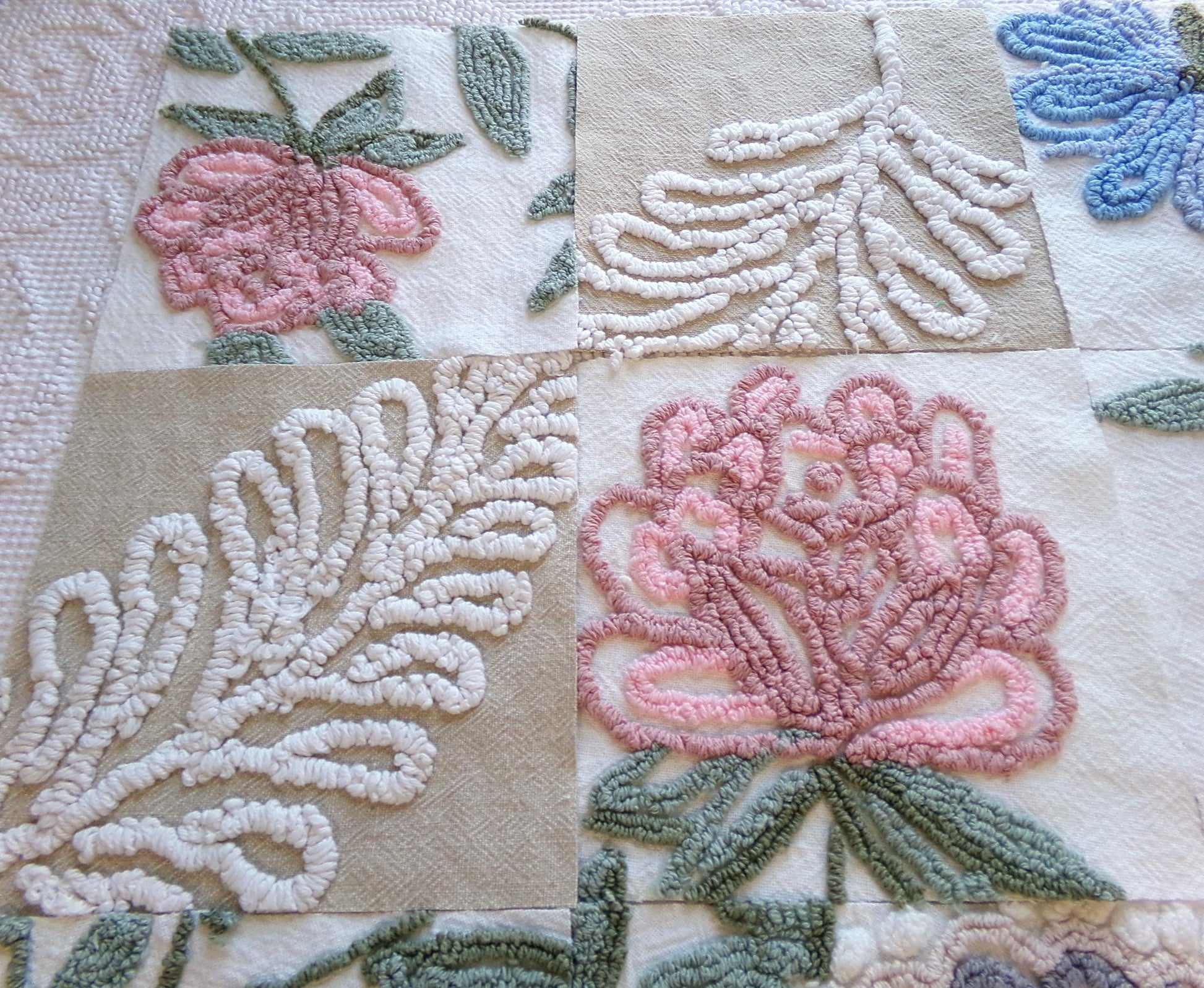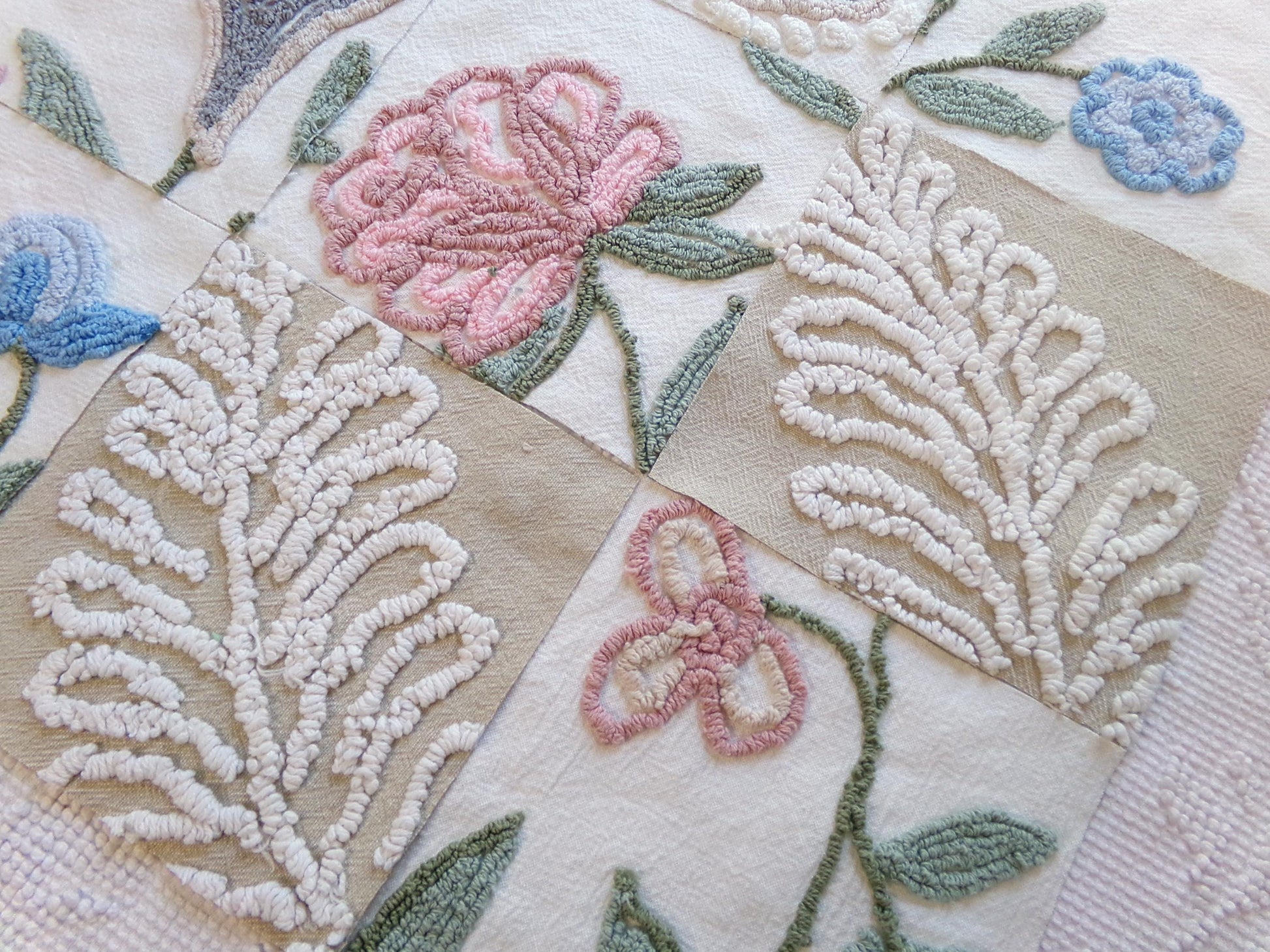 Several squares feature a tan bkgd with a flaming fern design to coordinate with the earthy, natural florals. These chenille blocks are heirloom quality, and I know you'll create something really special with them.