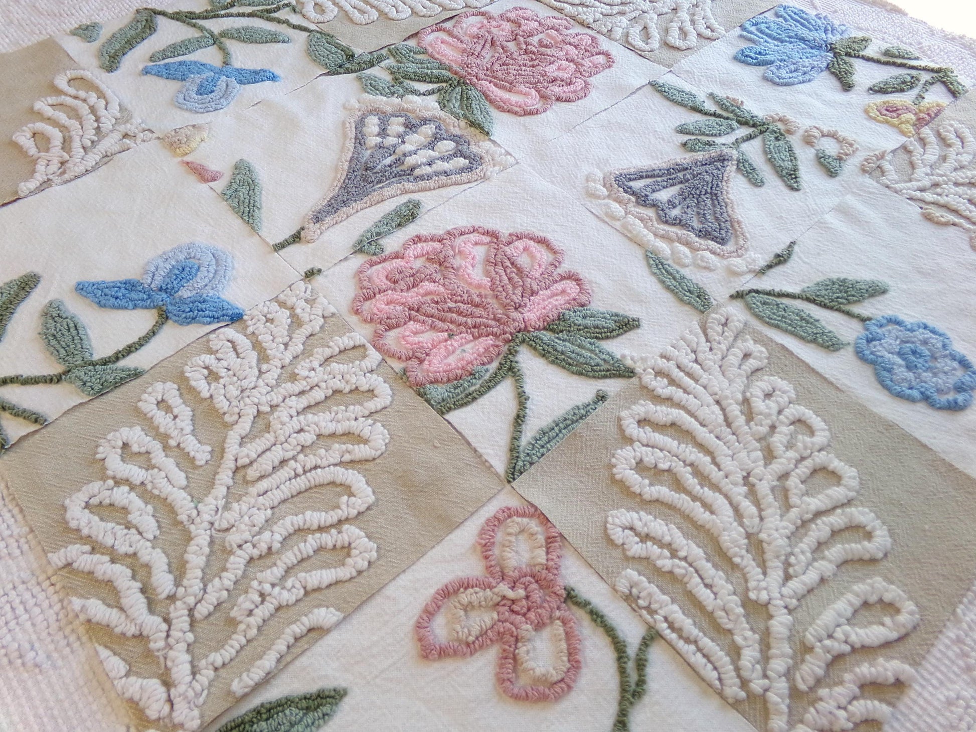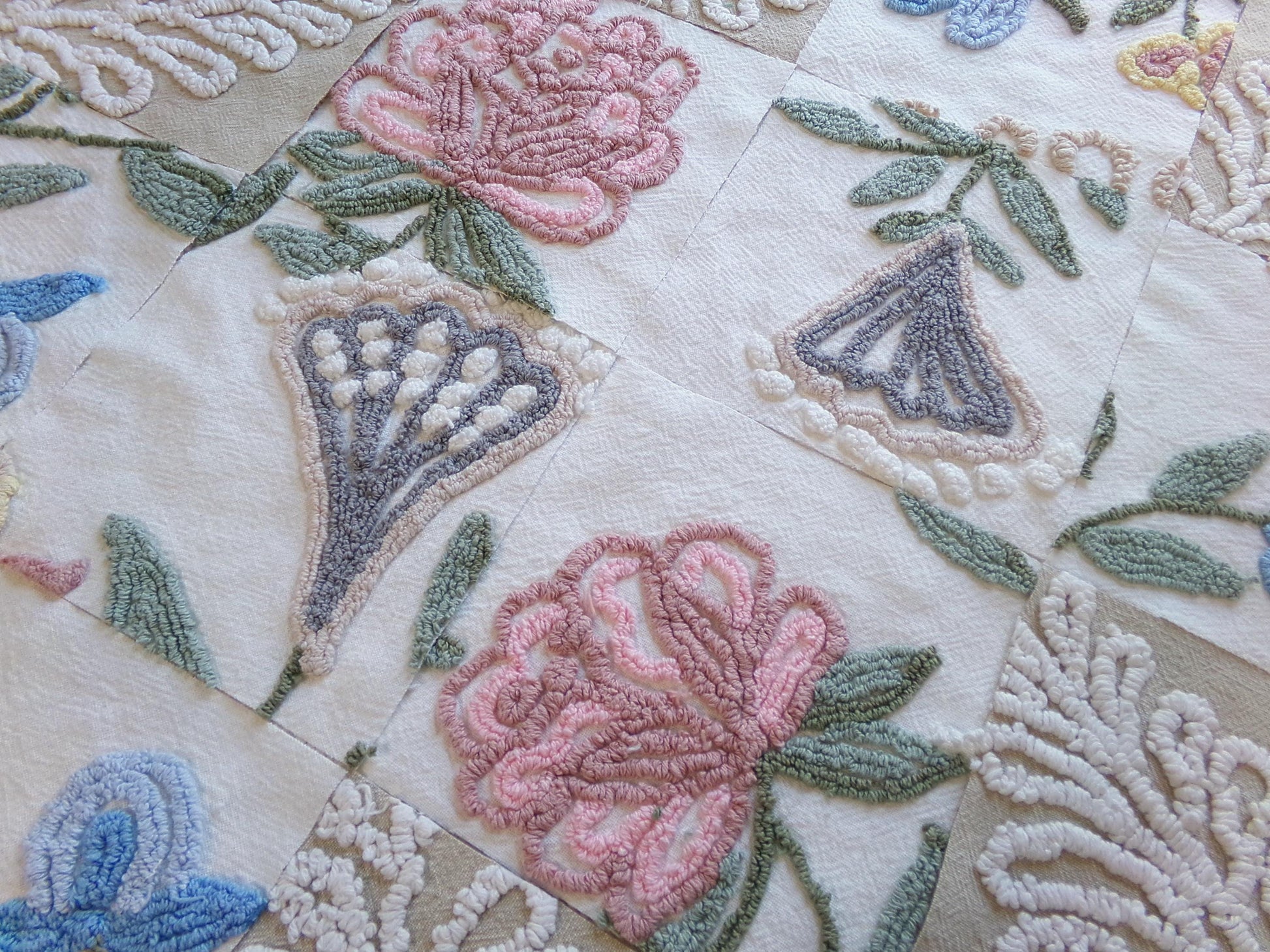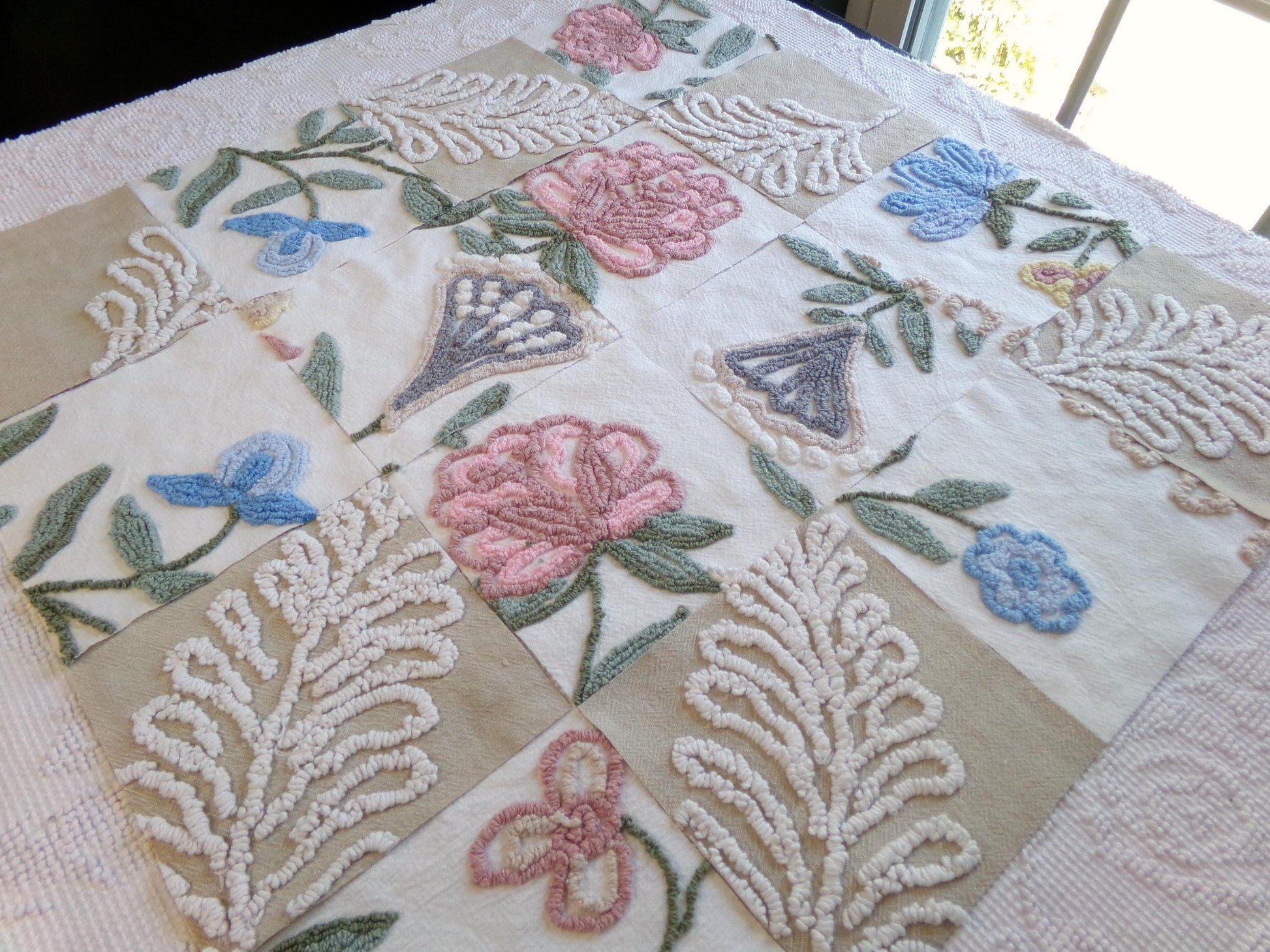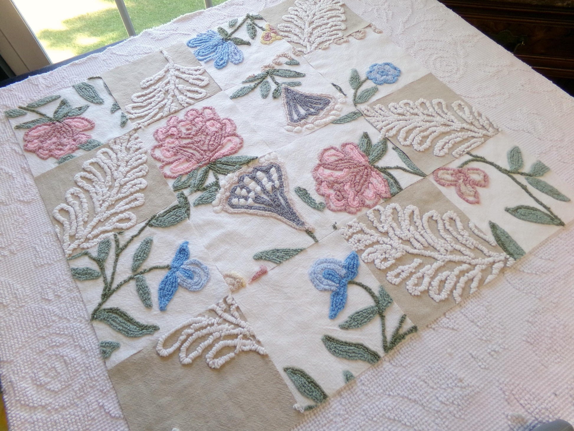 Several squares feature a tan bkgd with a flaming fern design to coordinate with the earthy, natural florals. These chenille blocks are heirloom quality, and I know you'll create something really special with them.