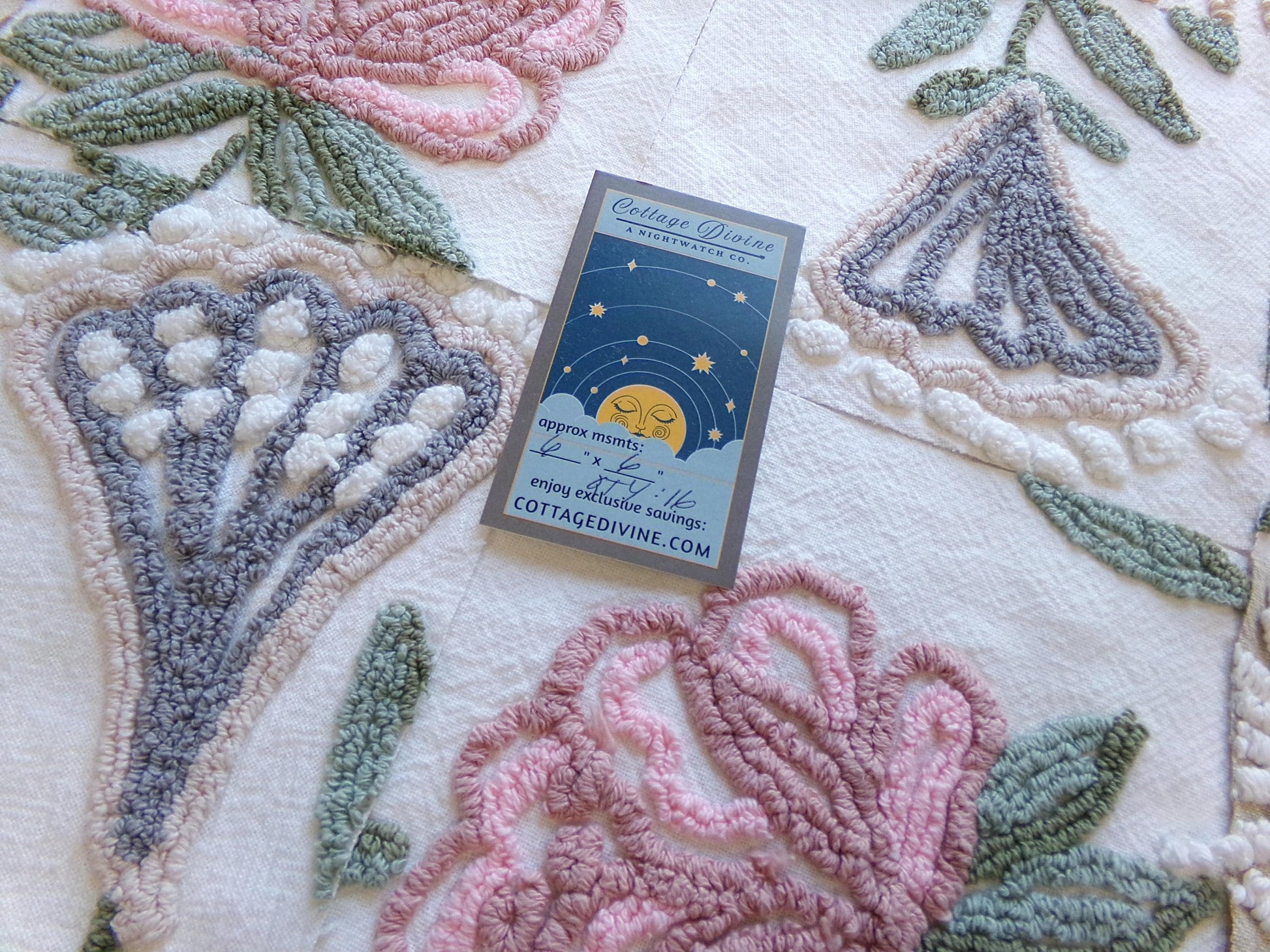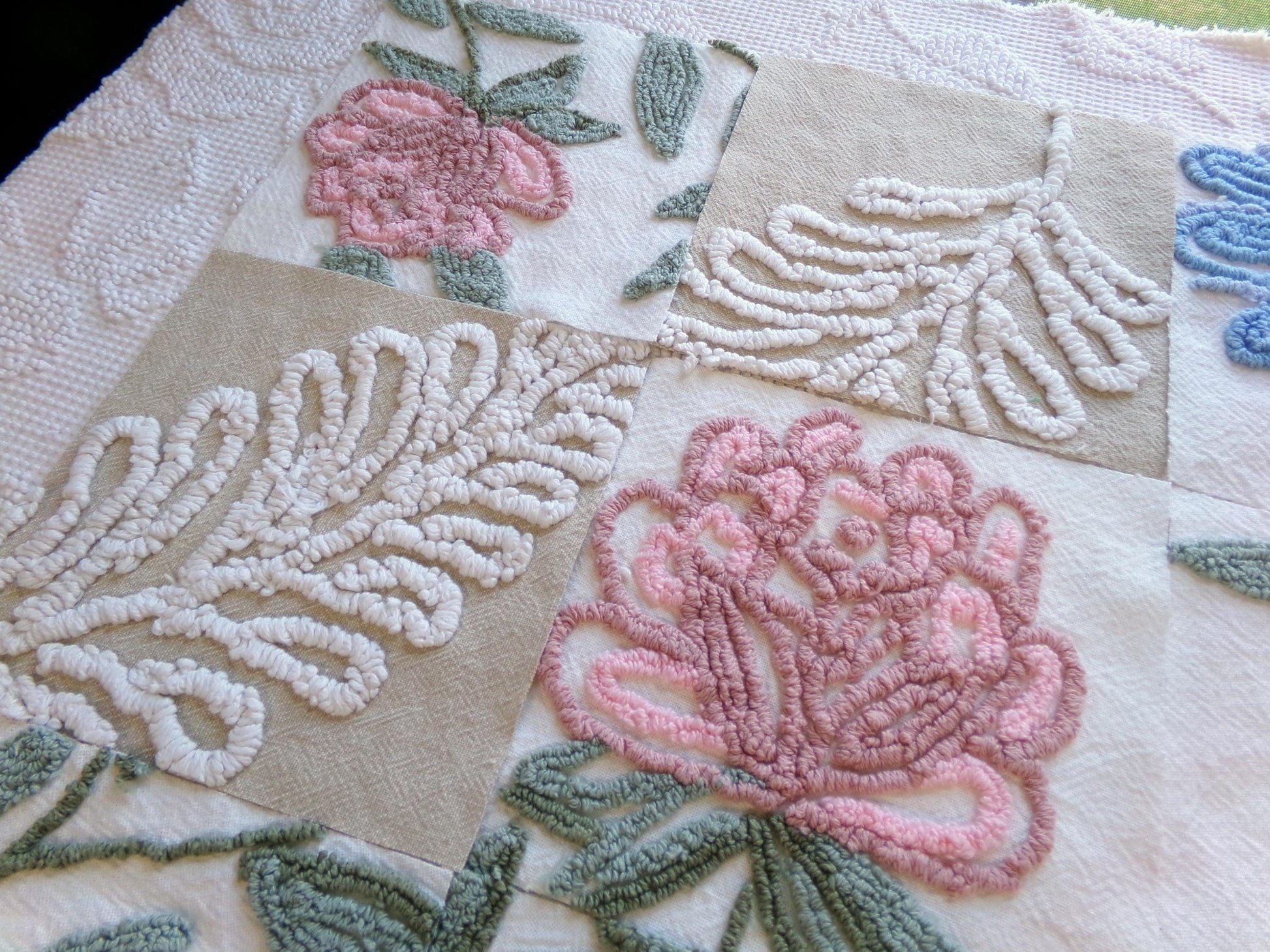 see more, cottagedivine.comHere is a one of our most unique sets of 16 vintage chenille fabric squares, measuring 6" each. For this OOAK set, I hand-selected natural botanical floral designs from several old Cabin Cabin crafts chenille bedspreads.